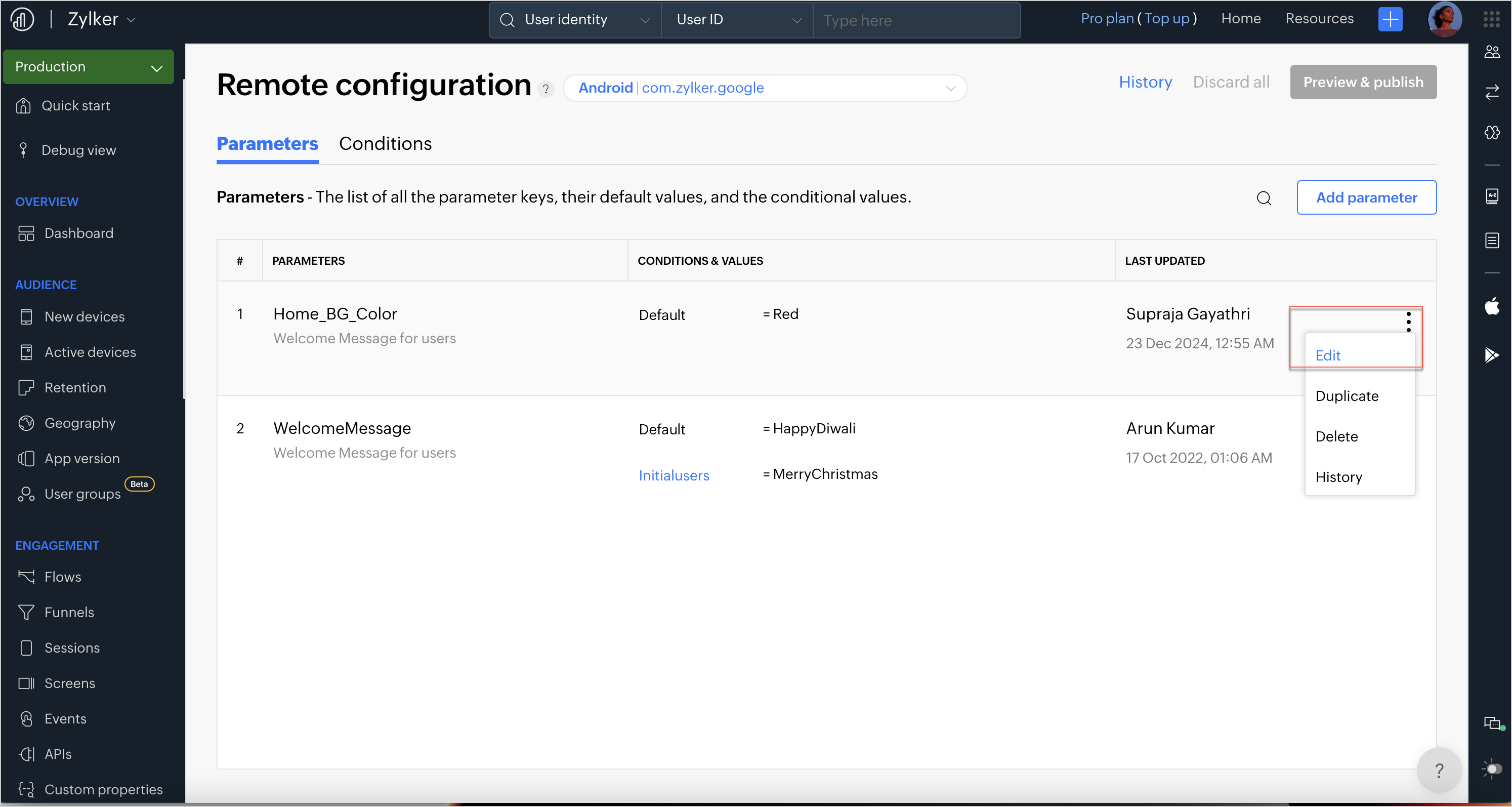1. Hover on the individual Parameters and click the on menu to edit the parameter, duplicate the parameter, delete the parameter, and view all the chnages done to the parameter as history.