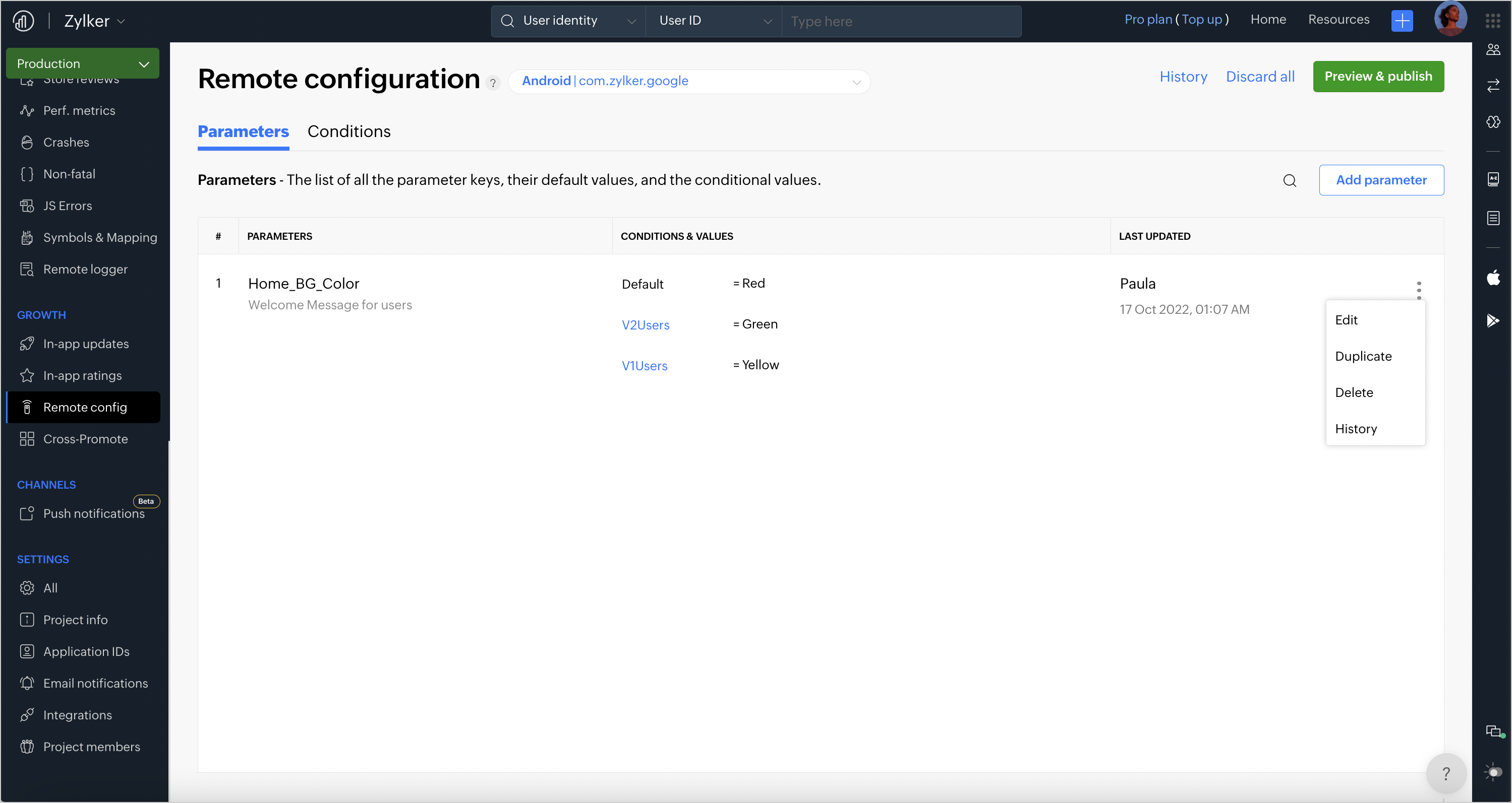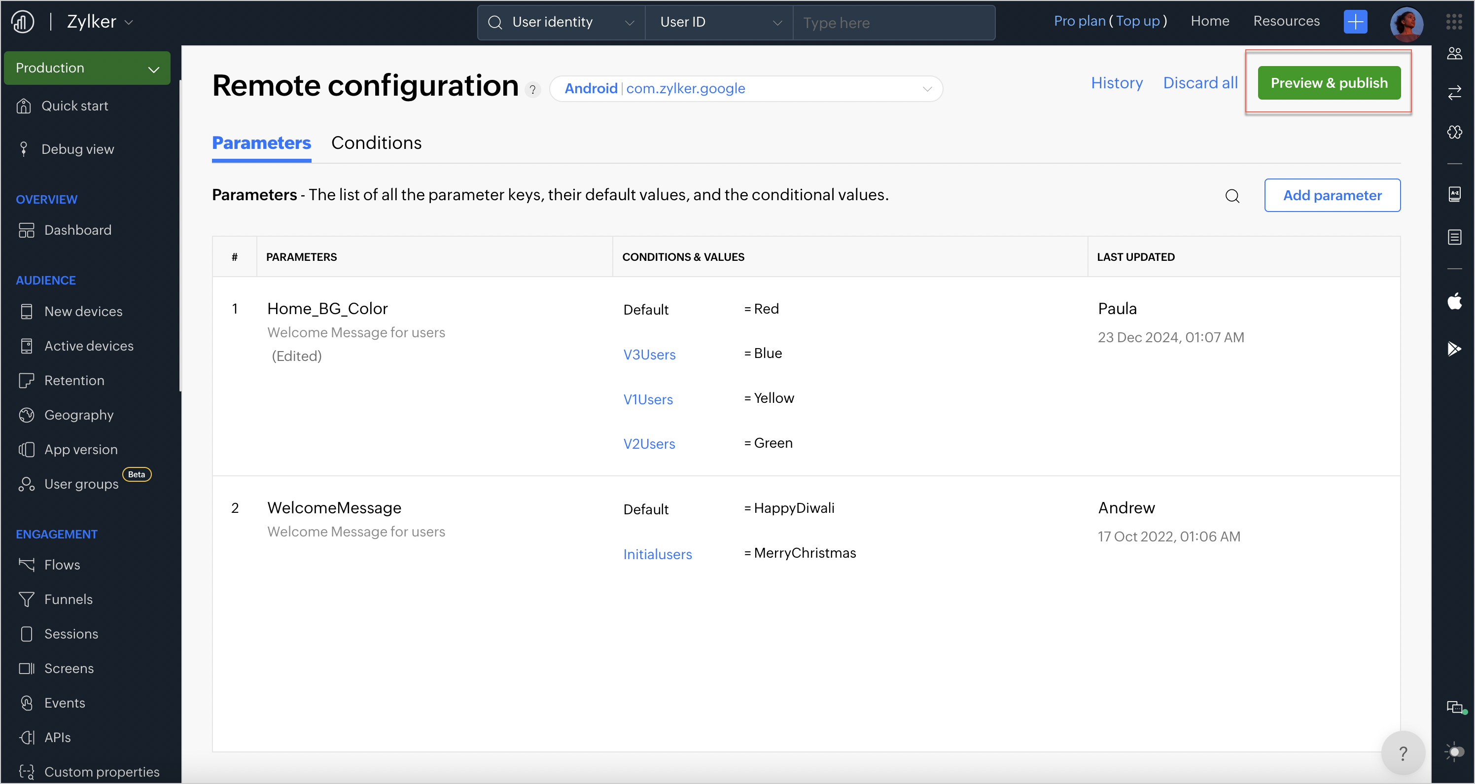 Note: A parameter can be associated with multiple conditions but the first condition that evaluates to true gets assigned to the parameter. You can always switch to any previous configurations that you have made using the Revert to this version & publish option under History.