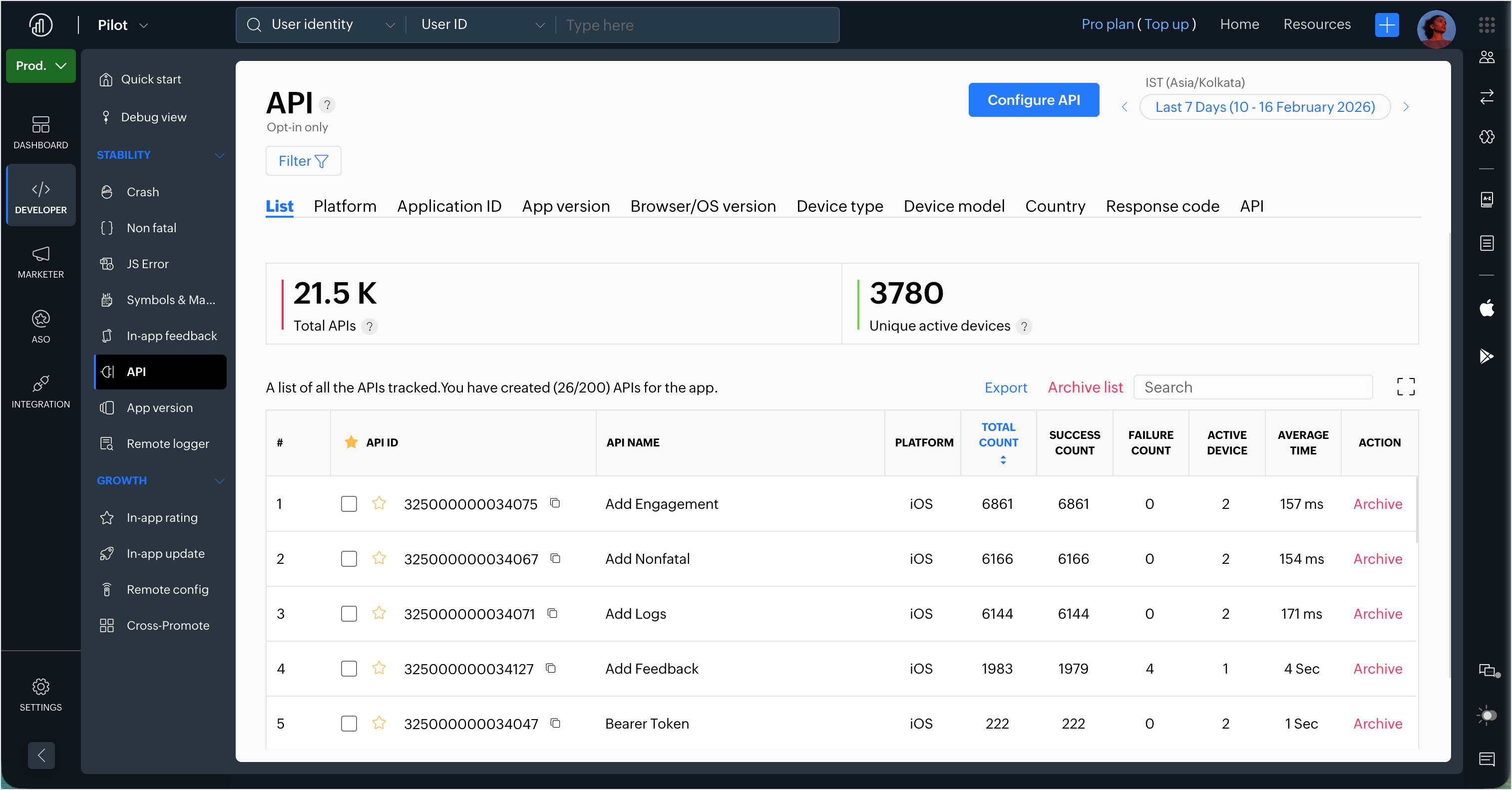 Once the APIs are configured in the console, you will be able to see the list of all the APIs that are being tracked for your app.