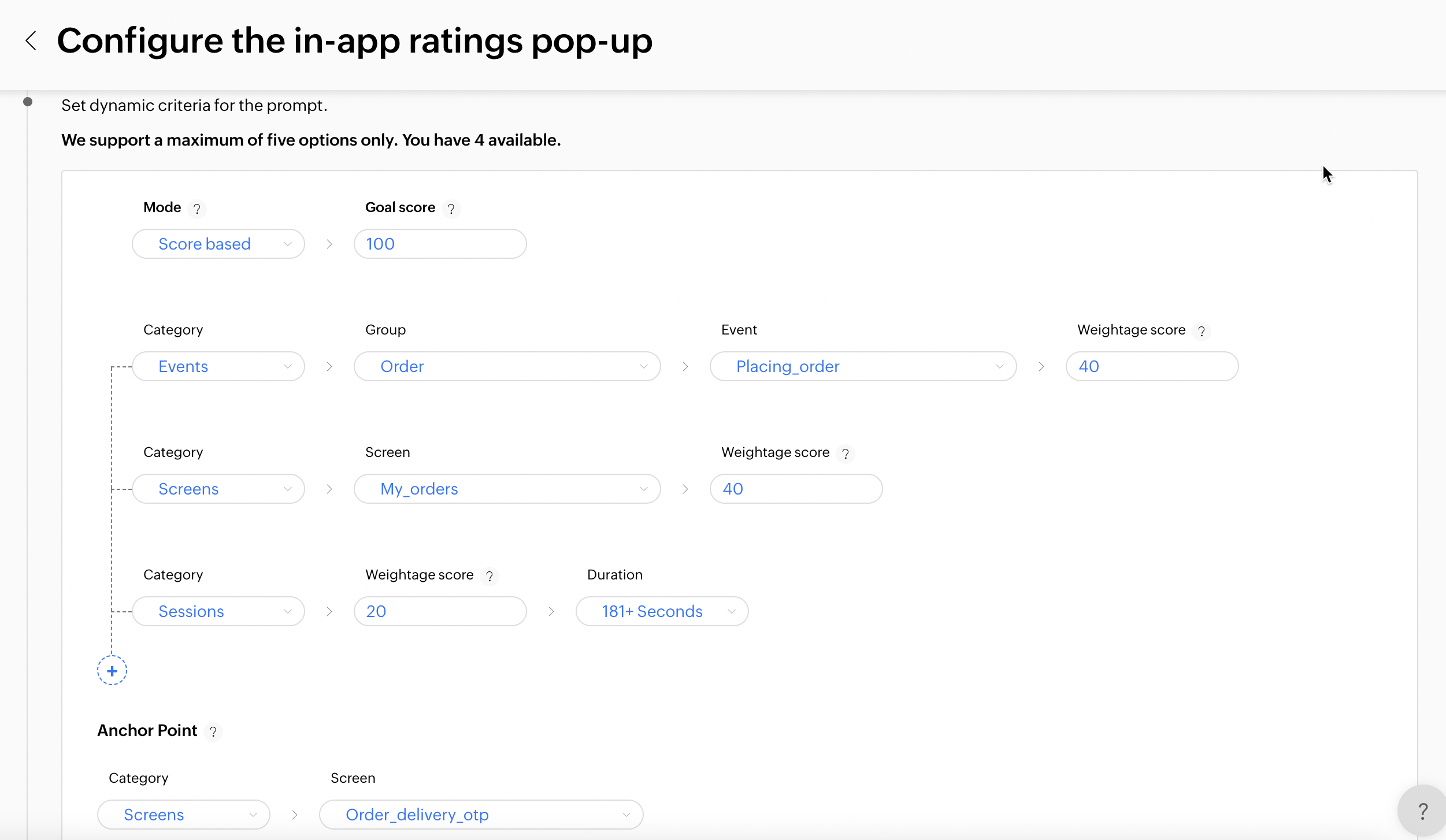 An anchor point can be any particular event or screen which if satisfied, will immediately trigger the rating prompt and the criteria configured earlier will be nullified.