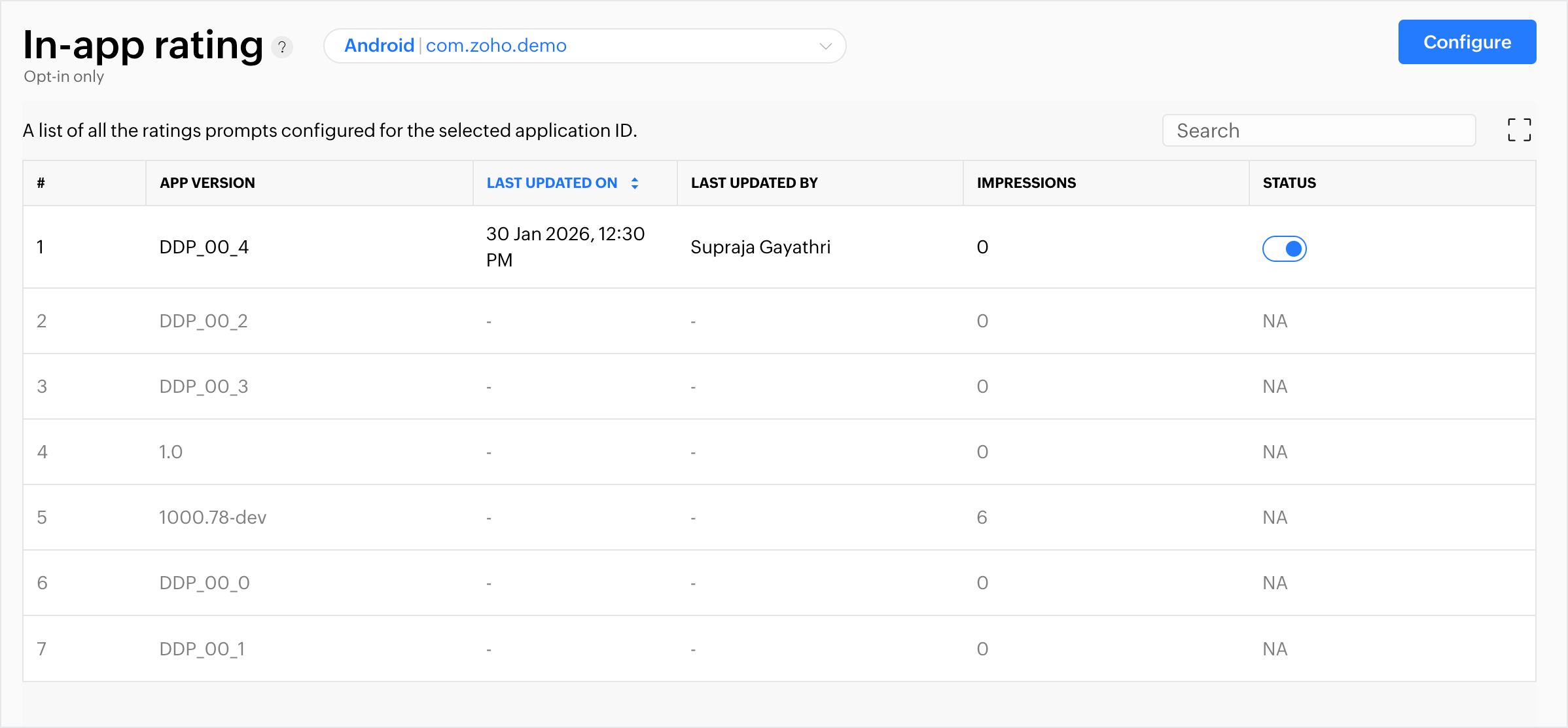 - Select the application ID for which you want to configure the ratings prompt and click Configure to start configuring the ratings prompt.