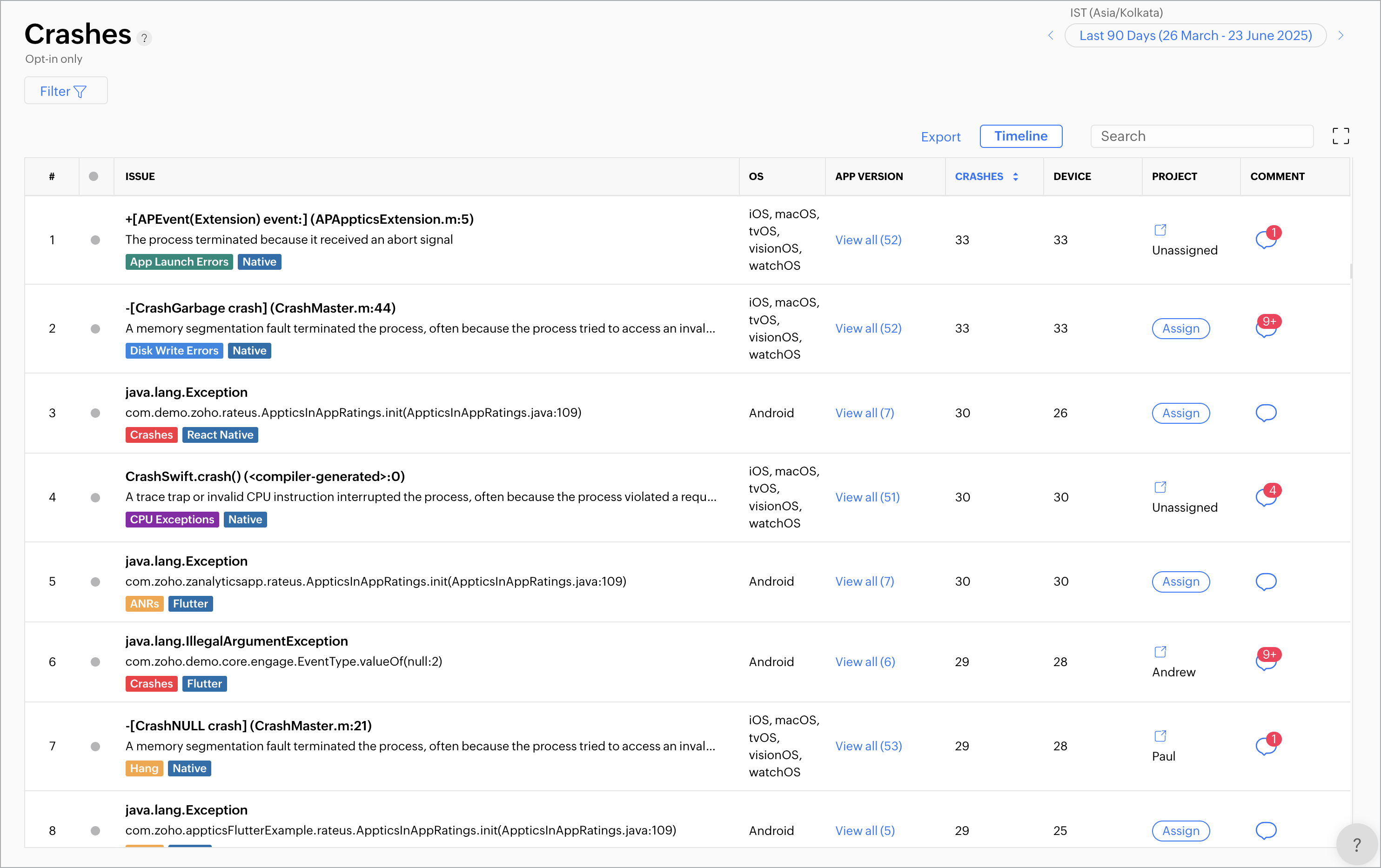 - If you are using Zoho Projects, you can integrate it with Zoho Apptics to assign these issues as bugs and manage them efficiently. (Refer to our Zoho Projects integration guide.)