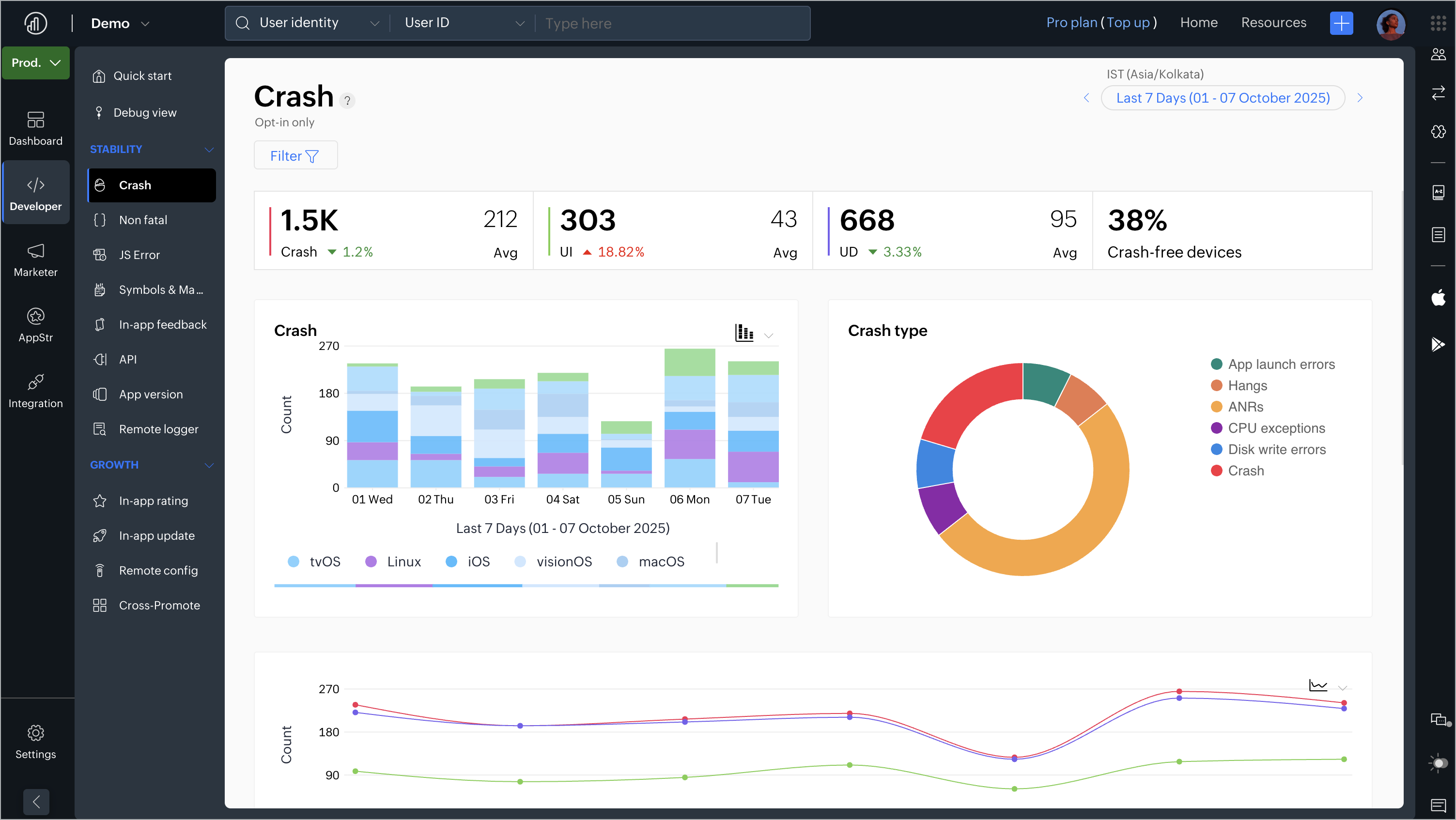 App crashes are fatal exceptions that cause the app to quit forcefully due to an issue. There may be multiple crashes because of the same unique issue. Instant error reporting enables you to get notified of such crashes, access detailed crash reports, and gain actionable insights (crash analytics) to help you pinpoint the root cause behind a crash instance in real-time.