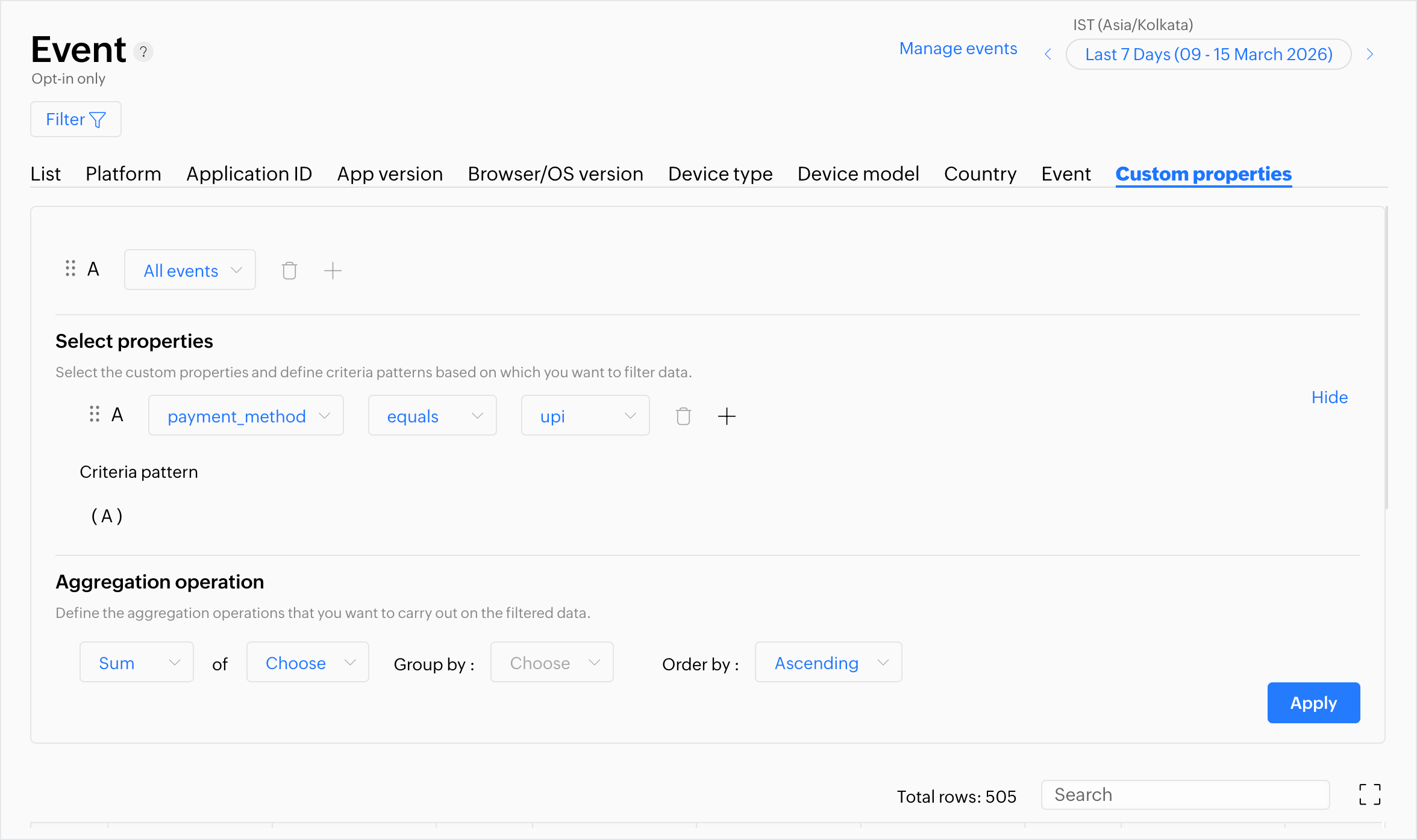 The Custom properties tab allows you to view and filter event data based on the custom properties passed along with those events. This helps in analyzing event-level data more effectively.