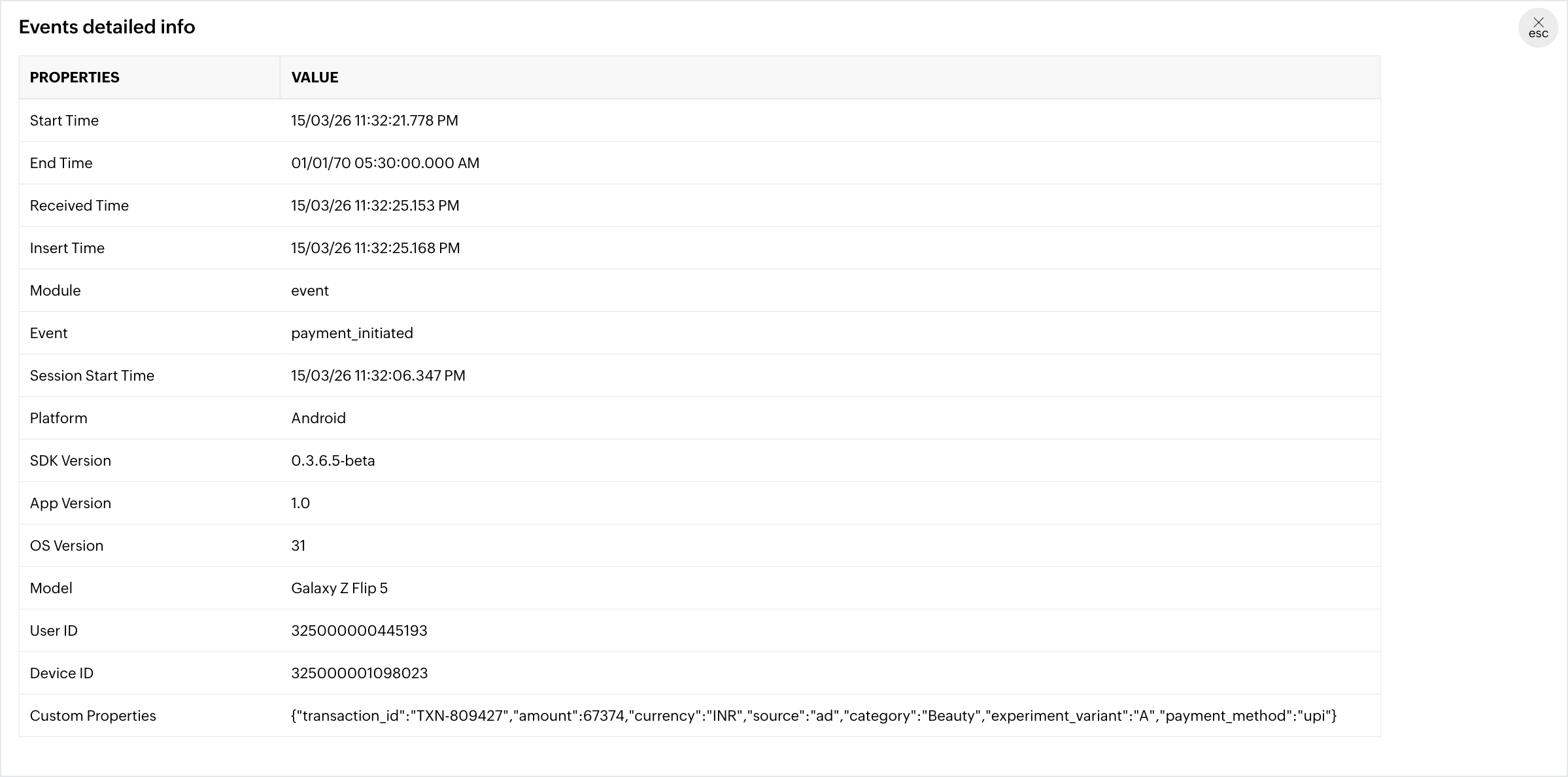 1. Click on View to see the detailed information for an individual event, including the custom properties logged with that event.