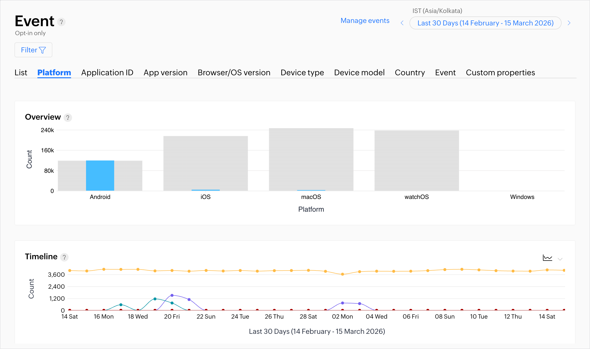 1. If you click on an individual event, you can analyze user activity across brands, platforms, application IDs, app version, browser.OS version, device type, device model, and countries.