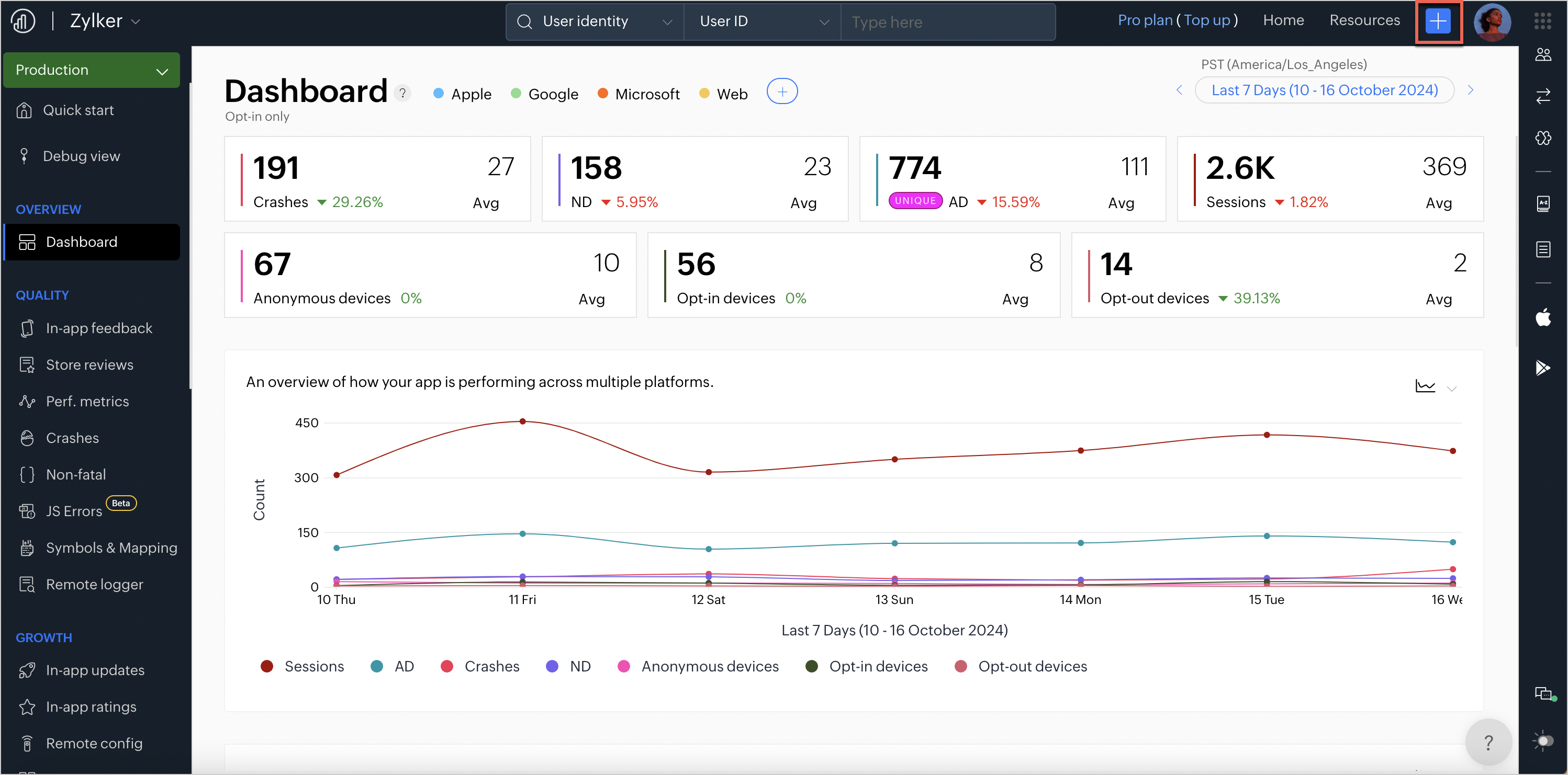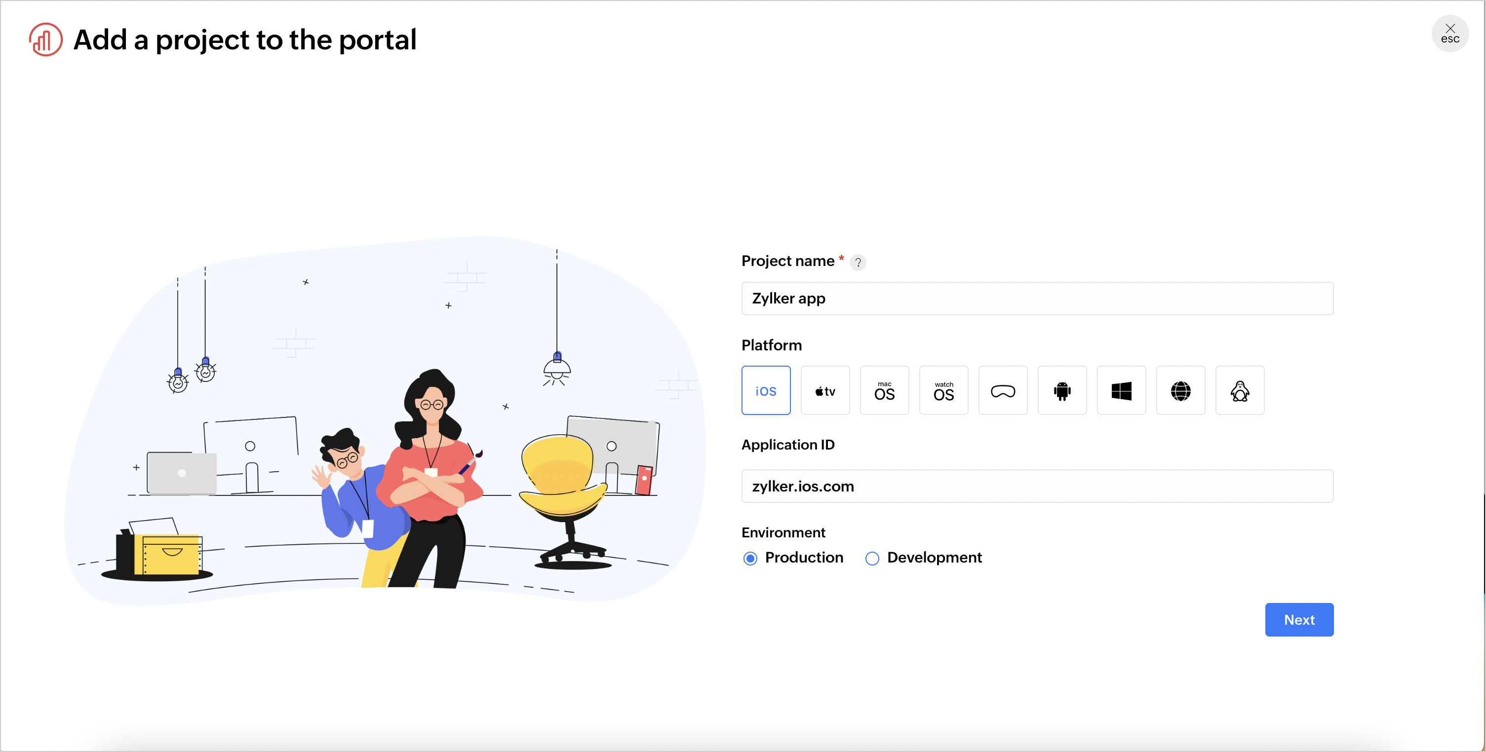 A project is a group of the same applications from different platforms. For example, if Zylker is a project then you can add Android, iOS, macOS, tvOS, watchOS, vision OS, Windows, JavaScript, Flutter, React Native, Unity, and Linux applications to Zylker project.