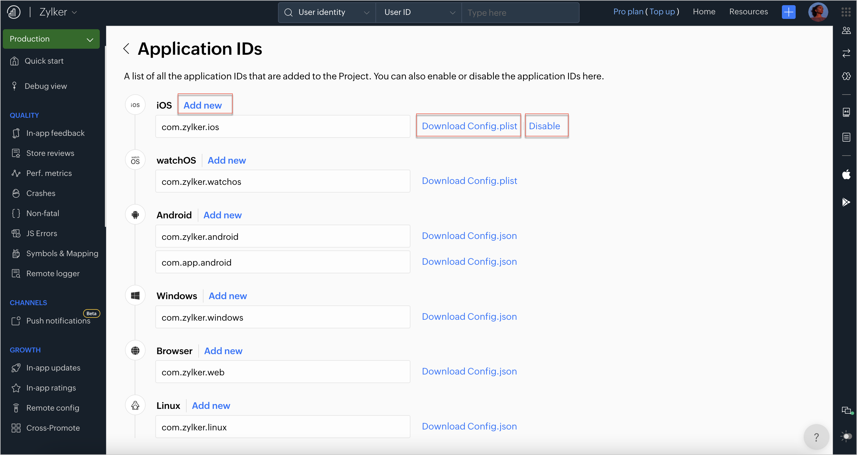1. You can add new application IDs, download the configuration files for individual application IDs, and disable applications IDs from here.