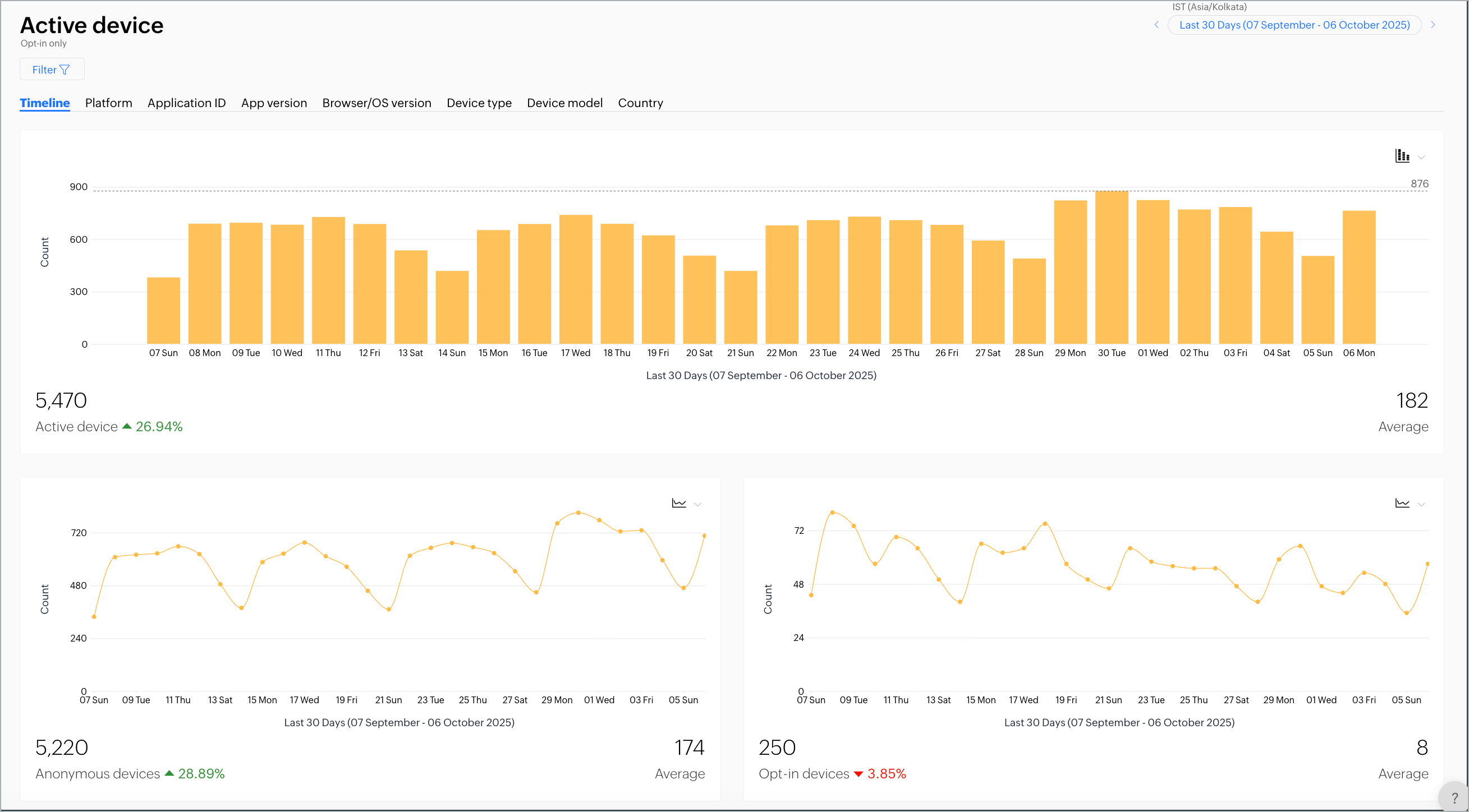 - Active devices (unique): The unique number of devices in which atleast one active session has happened in the past 30 days.