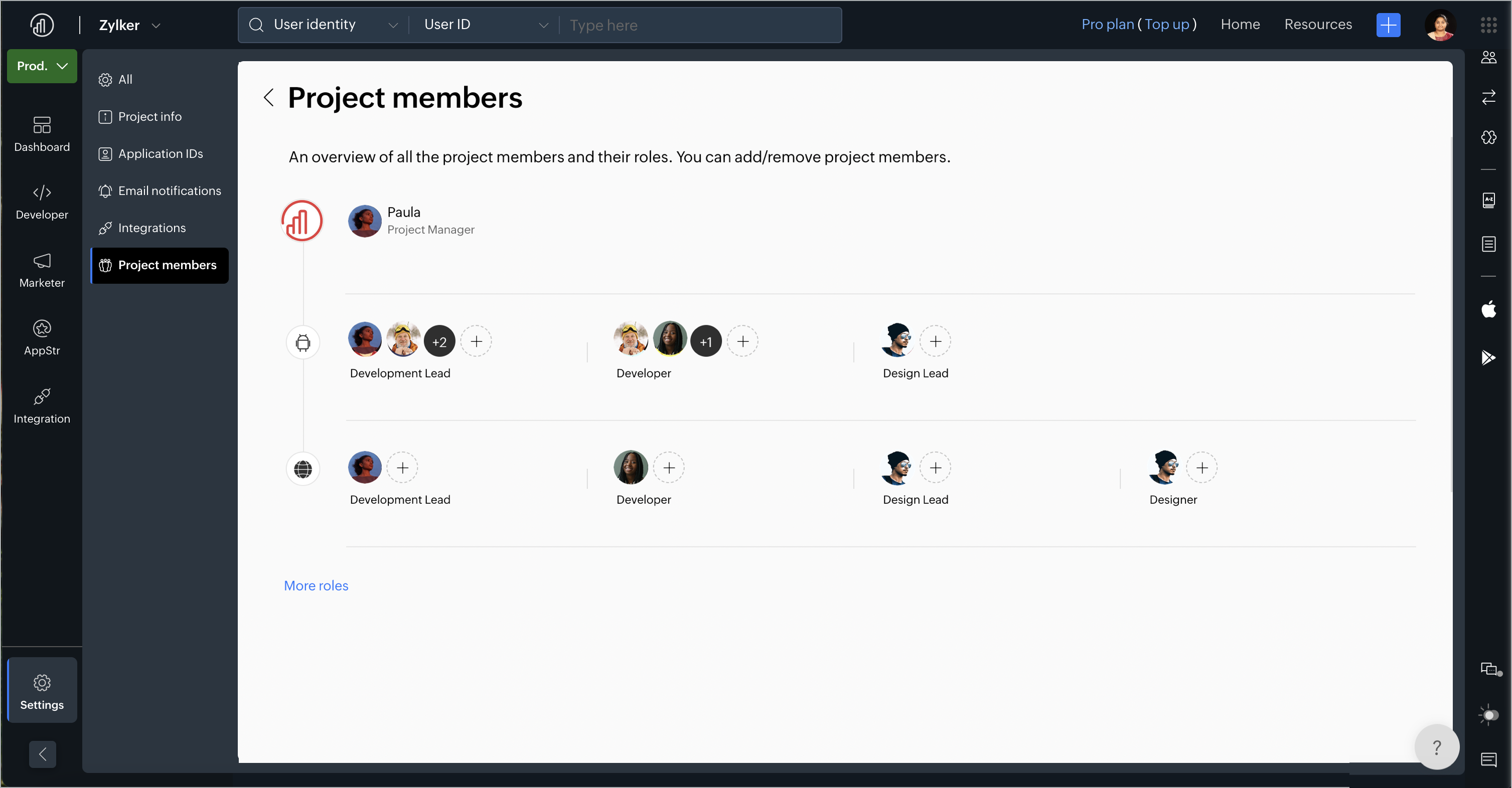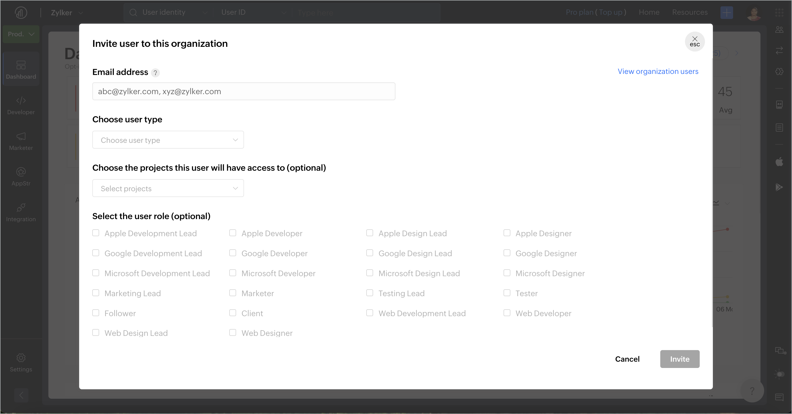You can invite members to the organization and add them to your project. Zoho Apptics offers role-based access, where the org admin or the project manager decides what pages can be accessed by whom within a project. Defining specific roles is important as it is easy to manage an individual working on multiple projects with different permission levels.