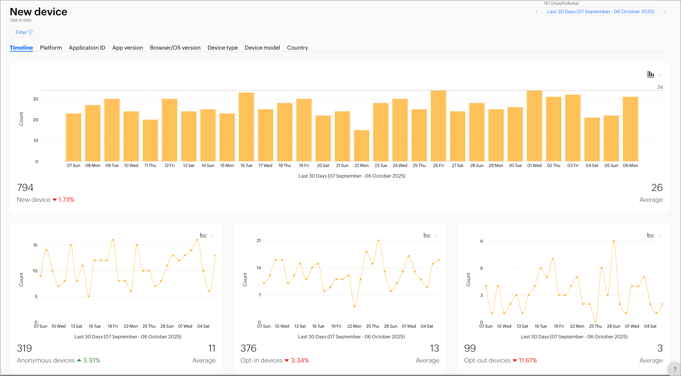 Generally, the new devices in Apptics can be equated to the number of downloads from the marketplace. However, this data should not be compared with the App Store or Play Store installed count. The reason being, we collect data based on the consent preference from each device and tracking status set by the developer.