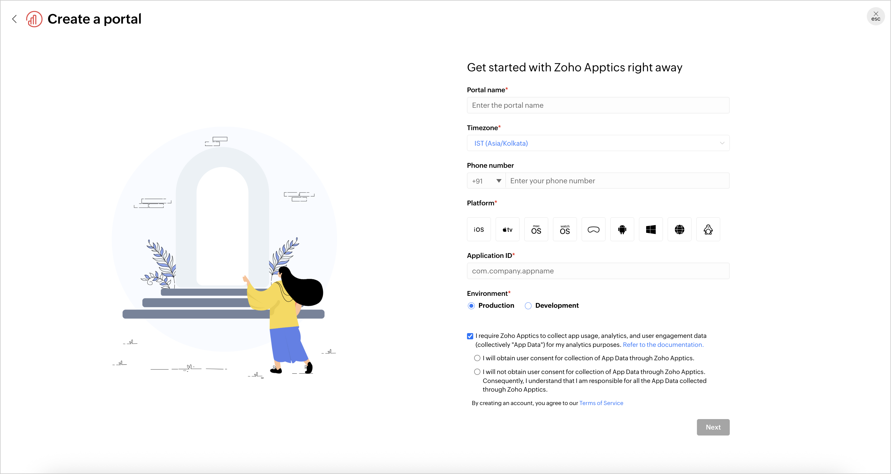 - When you create a organization in Zoho Apptics and if you agree for Zoho Apptics to collect app data from your users, you are given a choice as to whether you are willing to ask your app users for consent for data collection or not.