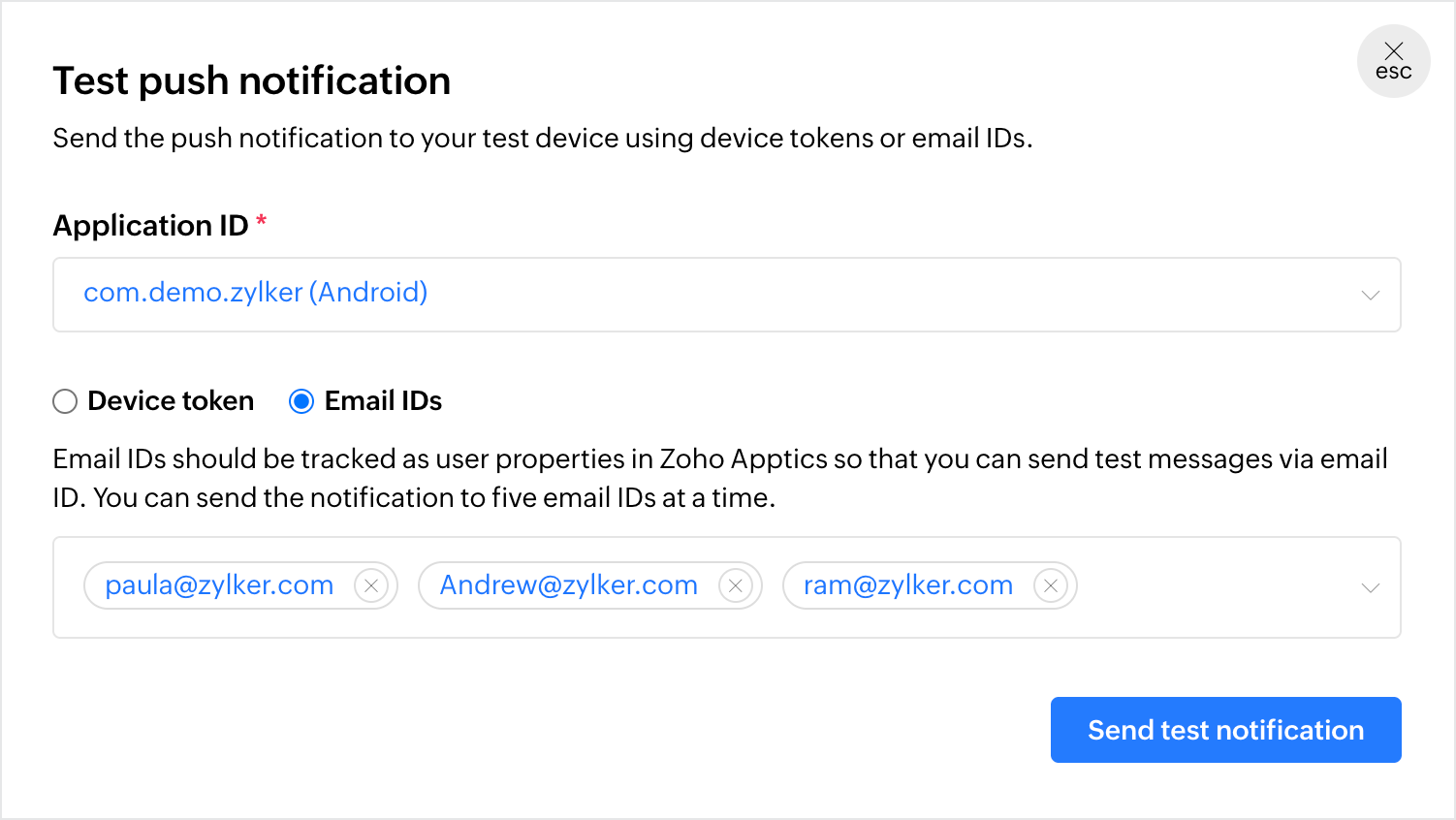 user properties within Apptics. The test notification will be then sent to the respective devices mapped to every email ID.