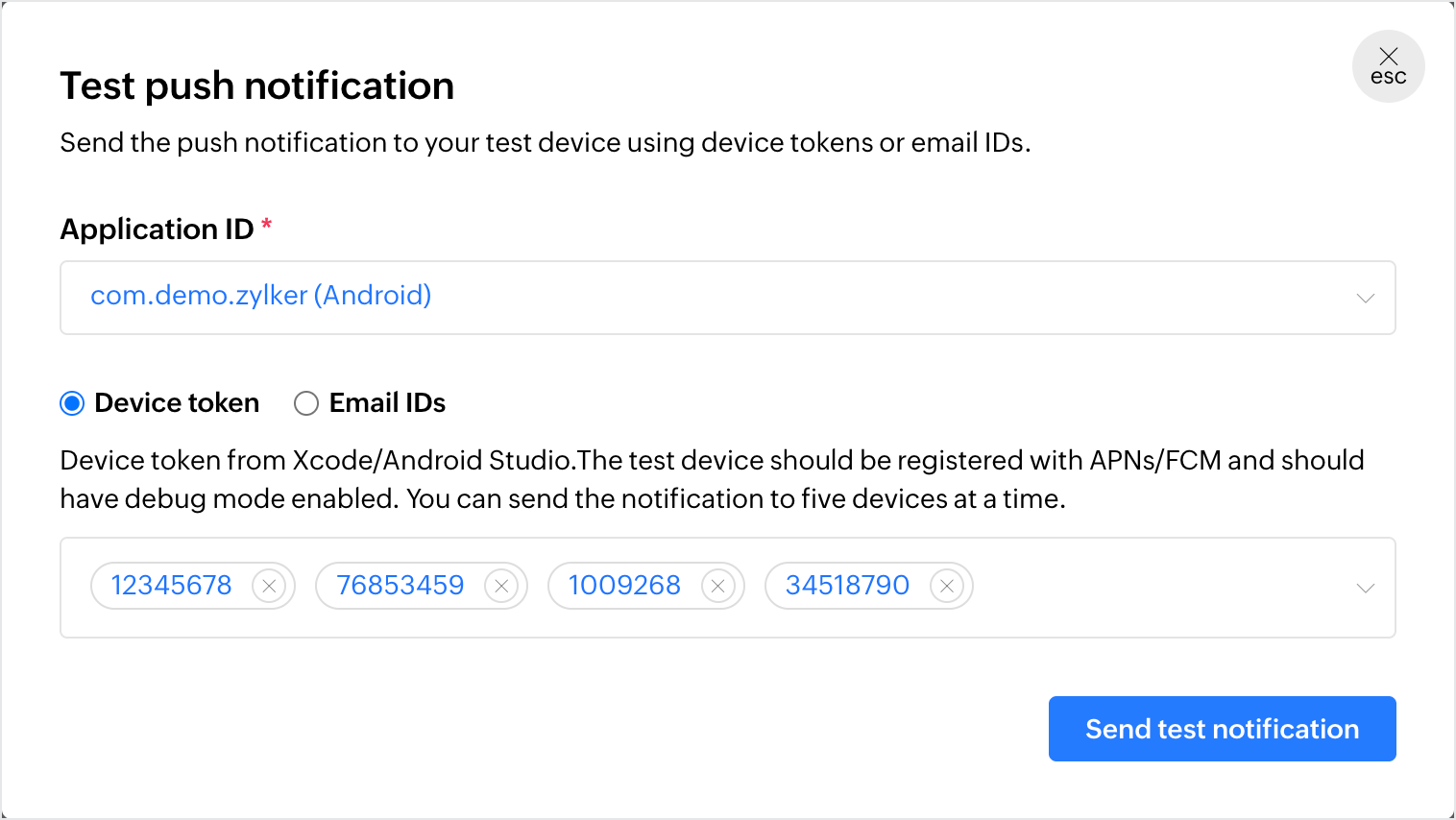 Note: You can send test notifications using device tokens only to devices that are registered with APNs/FCM and have debug mode enabled in them.