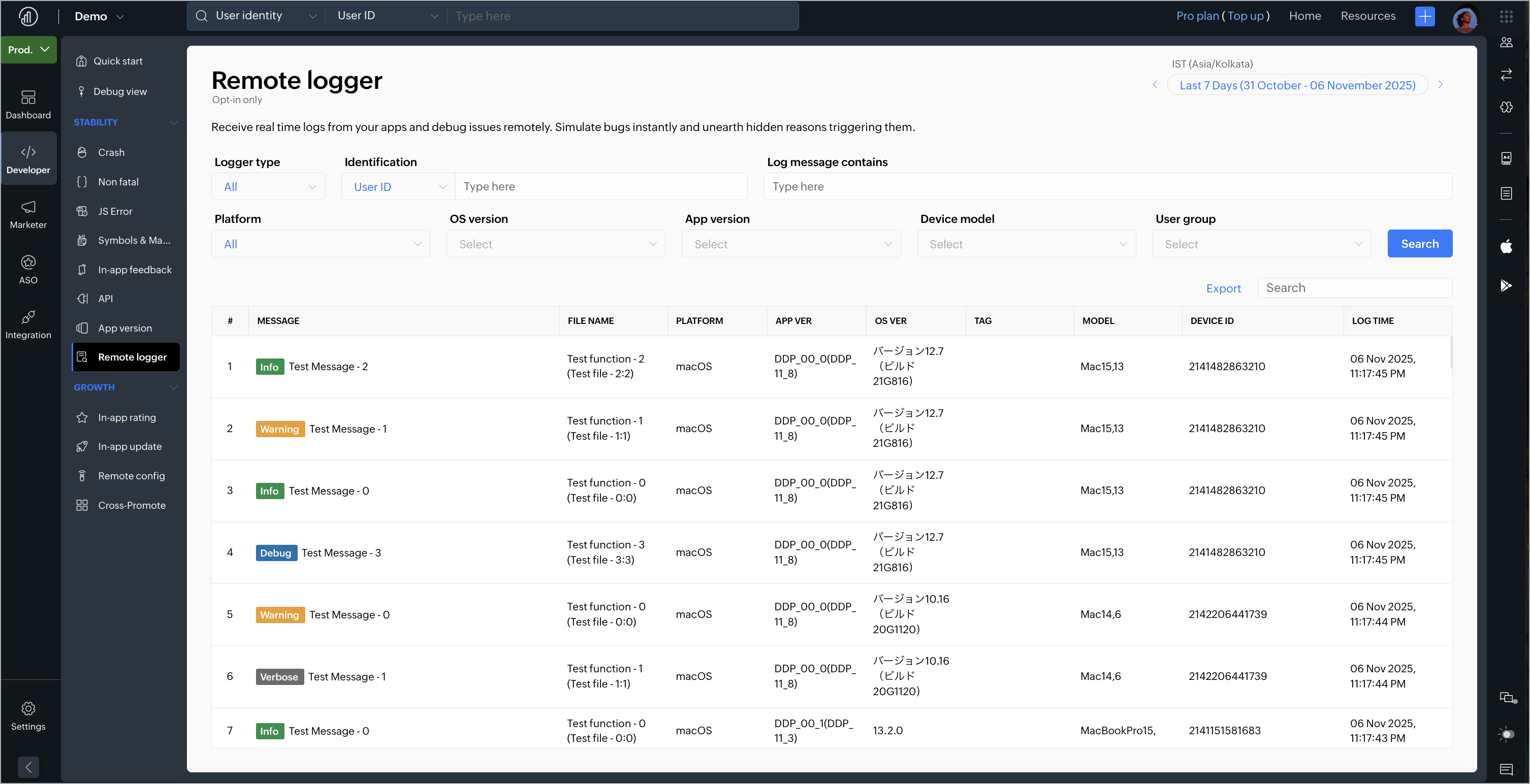 4. You can filter the logs based on the logger type, device/user ID, log message, platform, OS version, app version, device model, and user group.