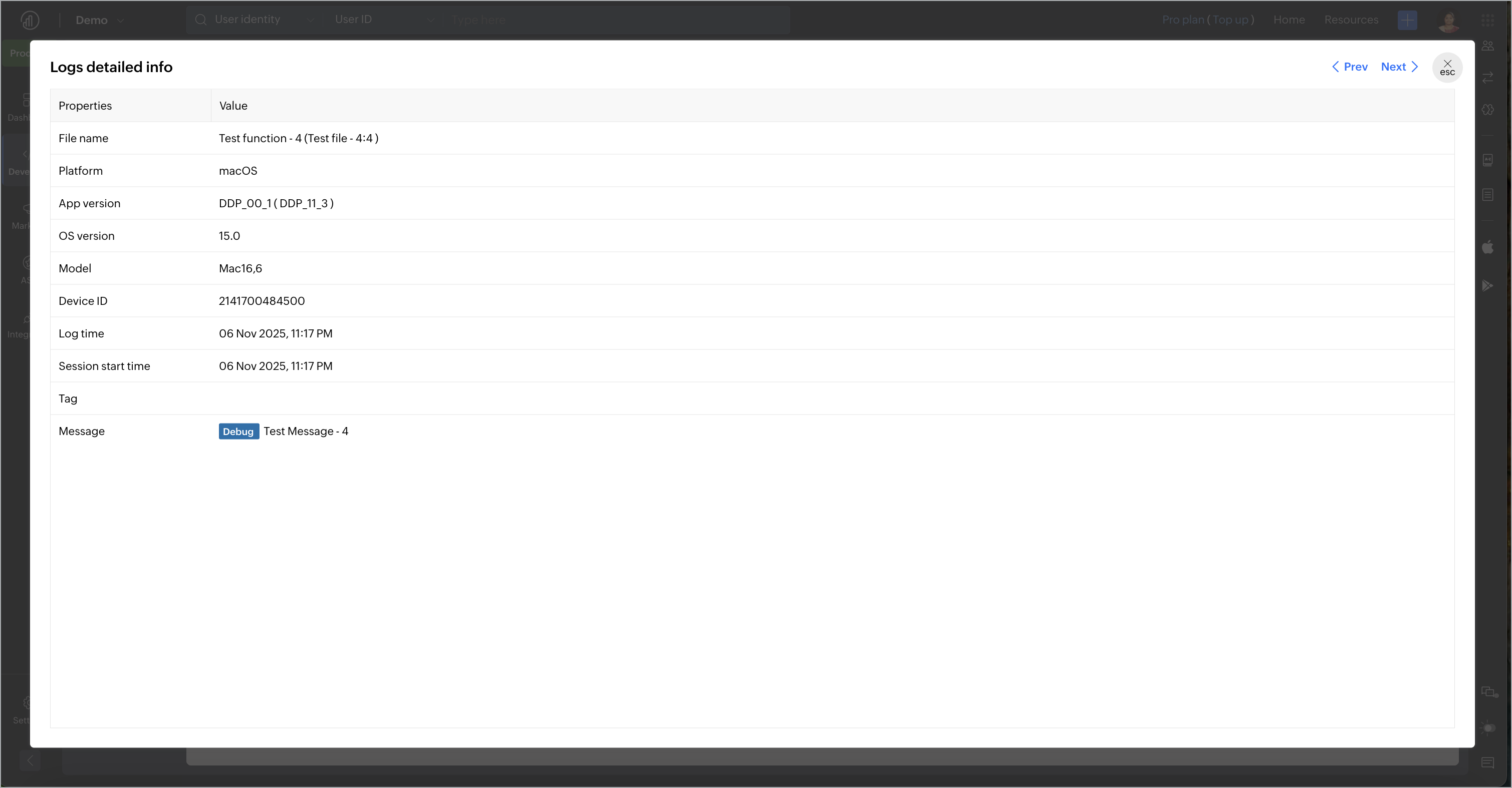 1. Click on the individual log to get more details such as log properties, file name, platform, app version, OS version, device model and ID, log time, session start time, and the log message.