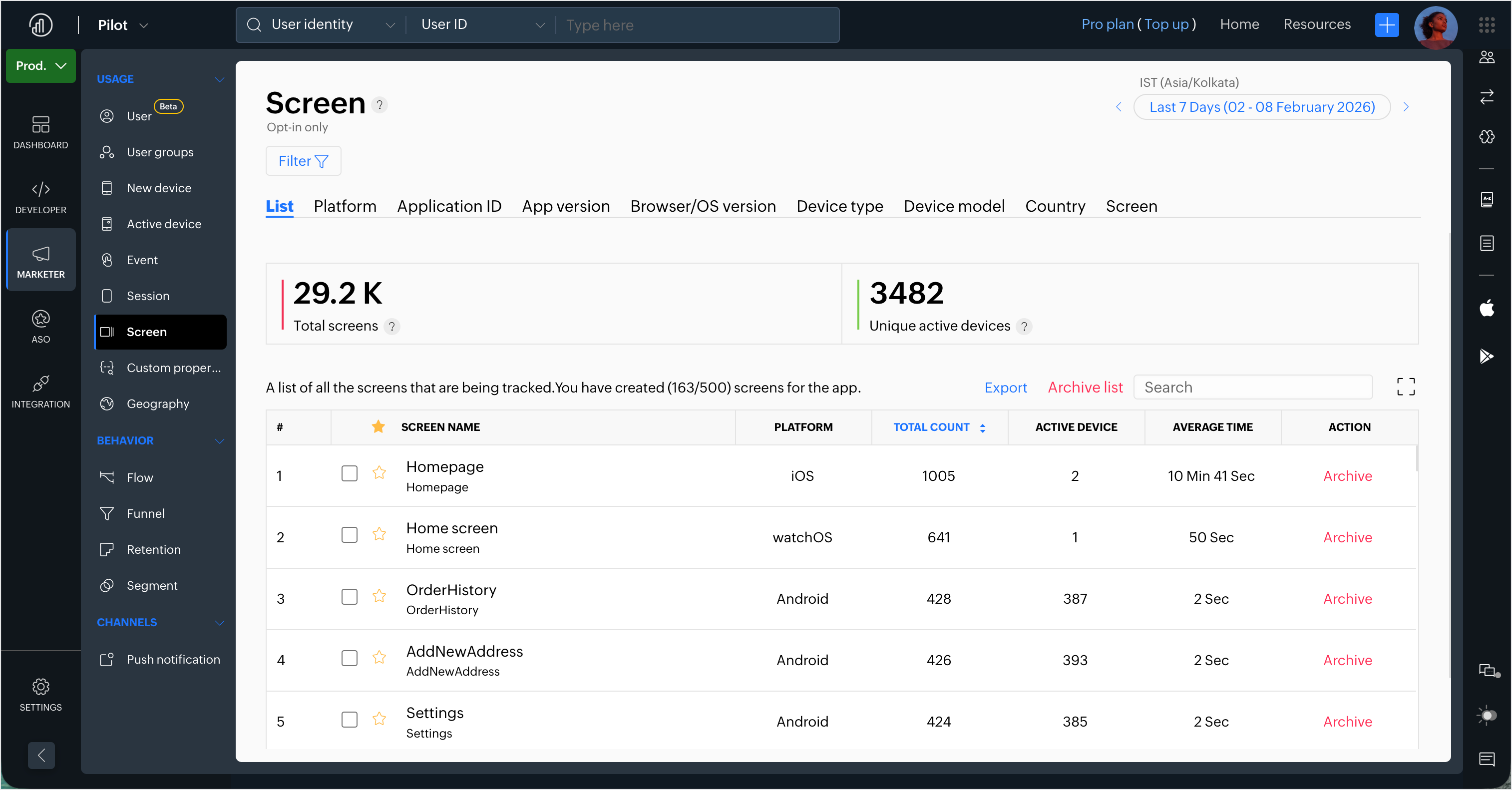 1. Below the stats, you will see the list of all the screens tracked for your app and includes details like the platform, the total number of screen visits, active devices, and the average time spent on the screen.