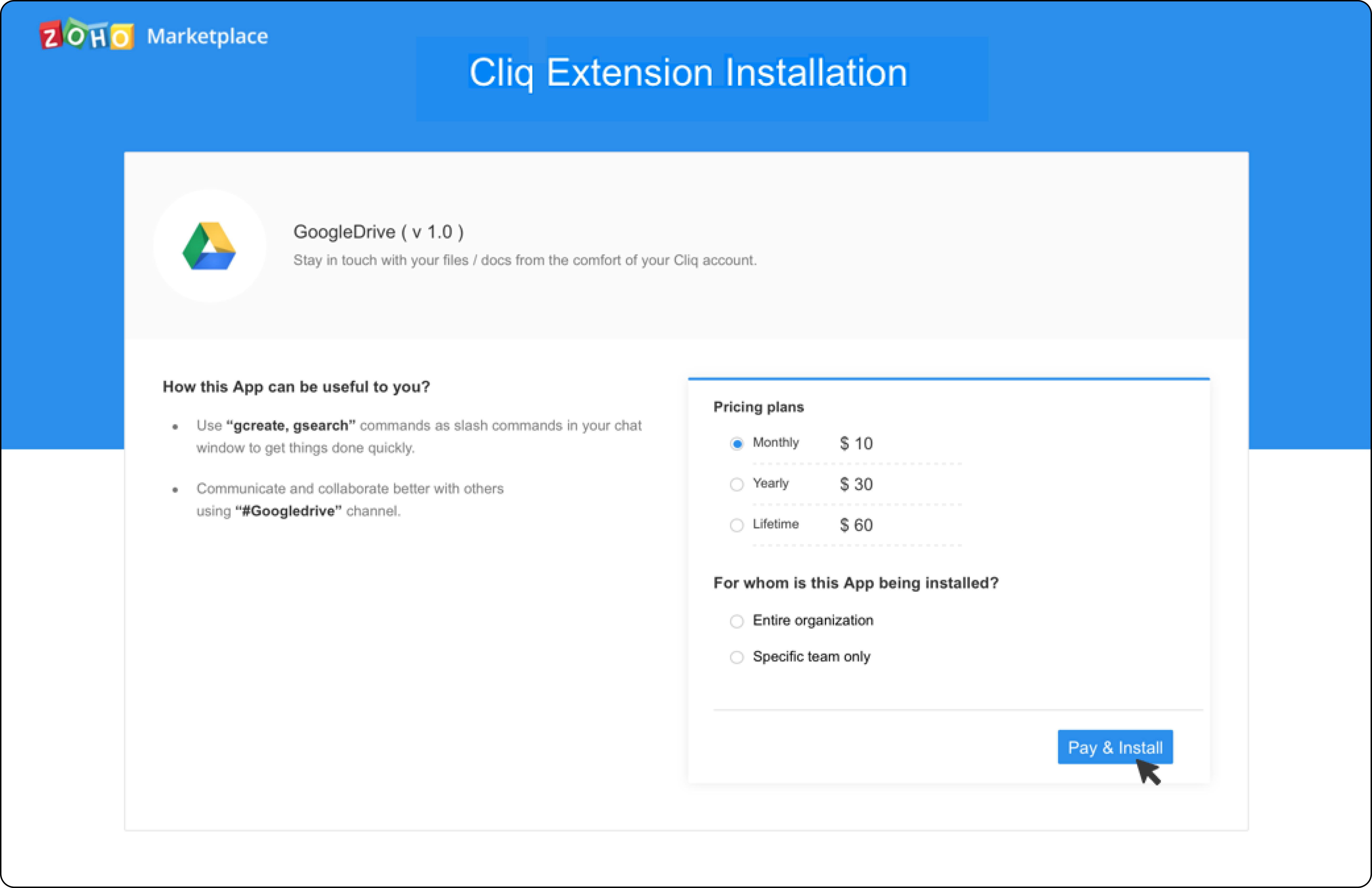 To install extensions: Navigate to Zoho Marketplace by clicking on the plug icon in the top-right corner or by clicking on the following link https://cliq.zoho.com/integrations/marketplace The extensions under Cliq will be listed out Select the ...