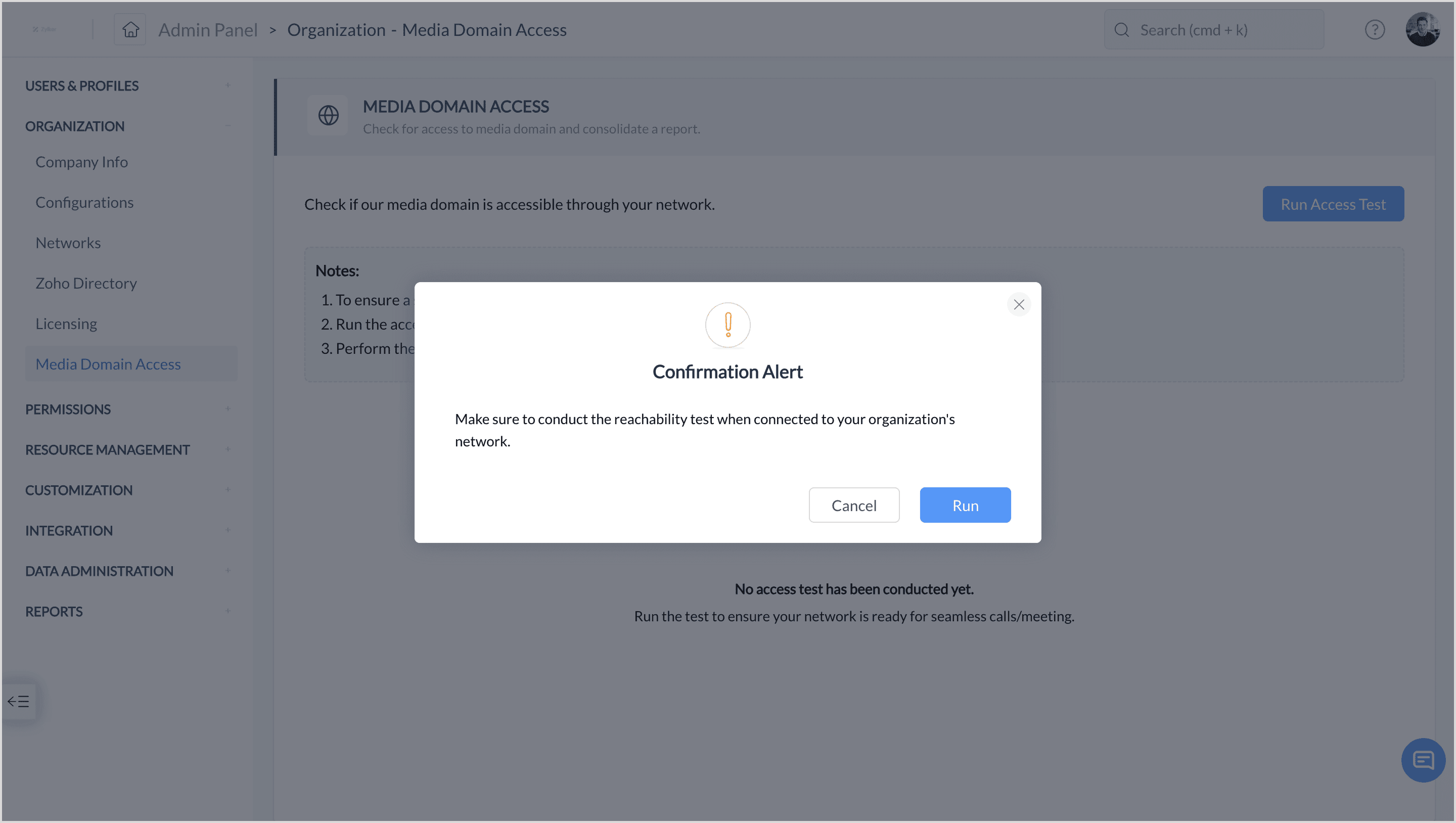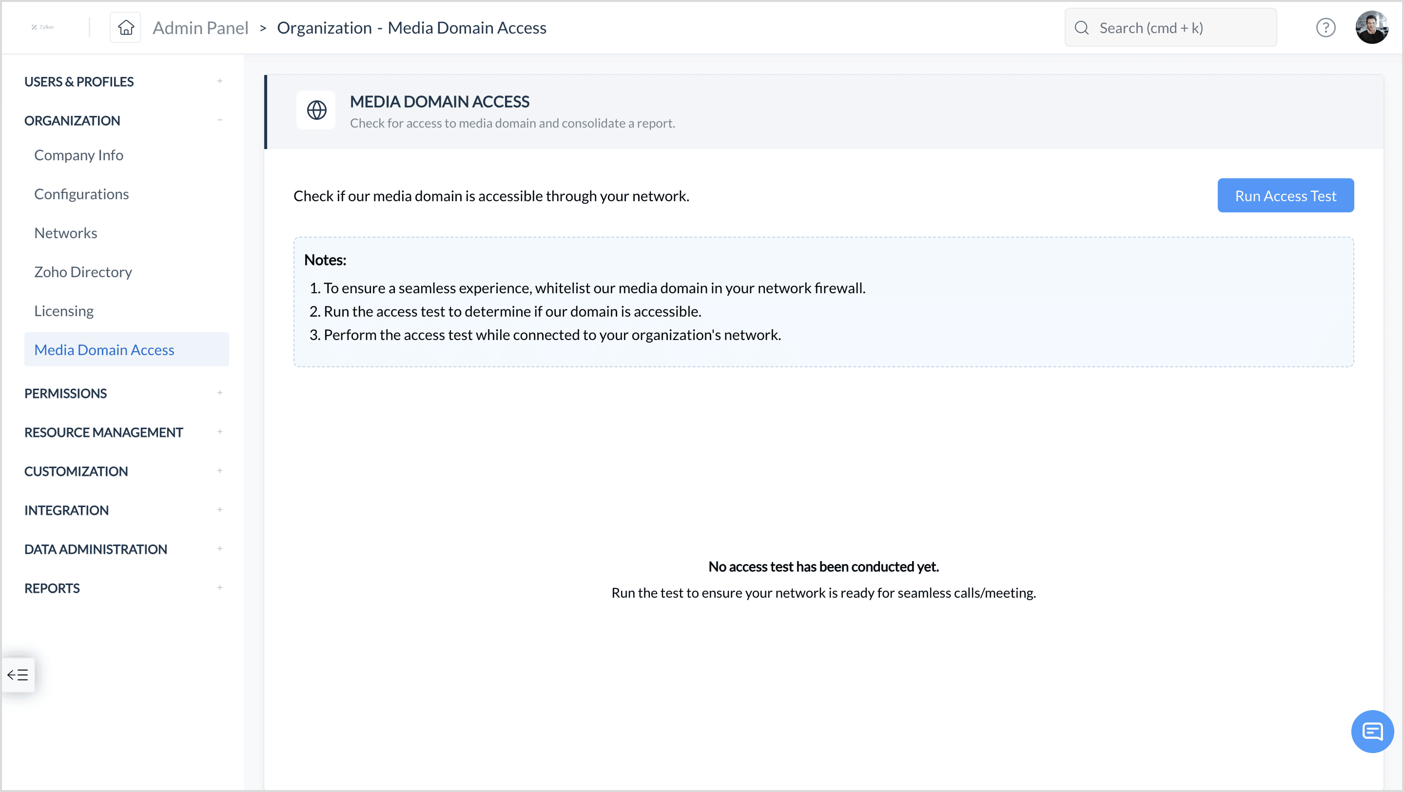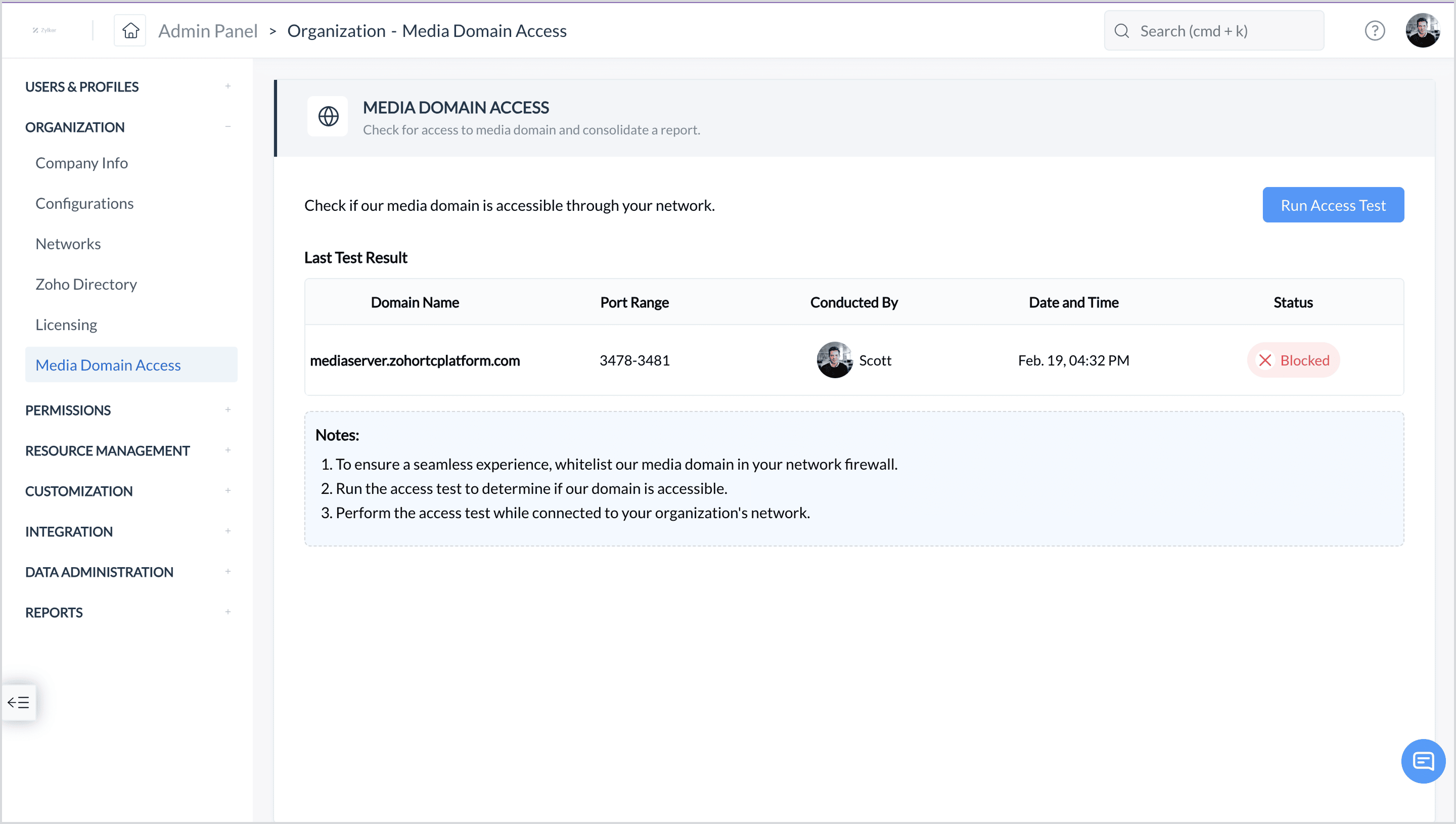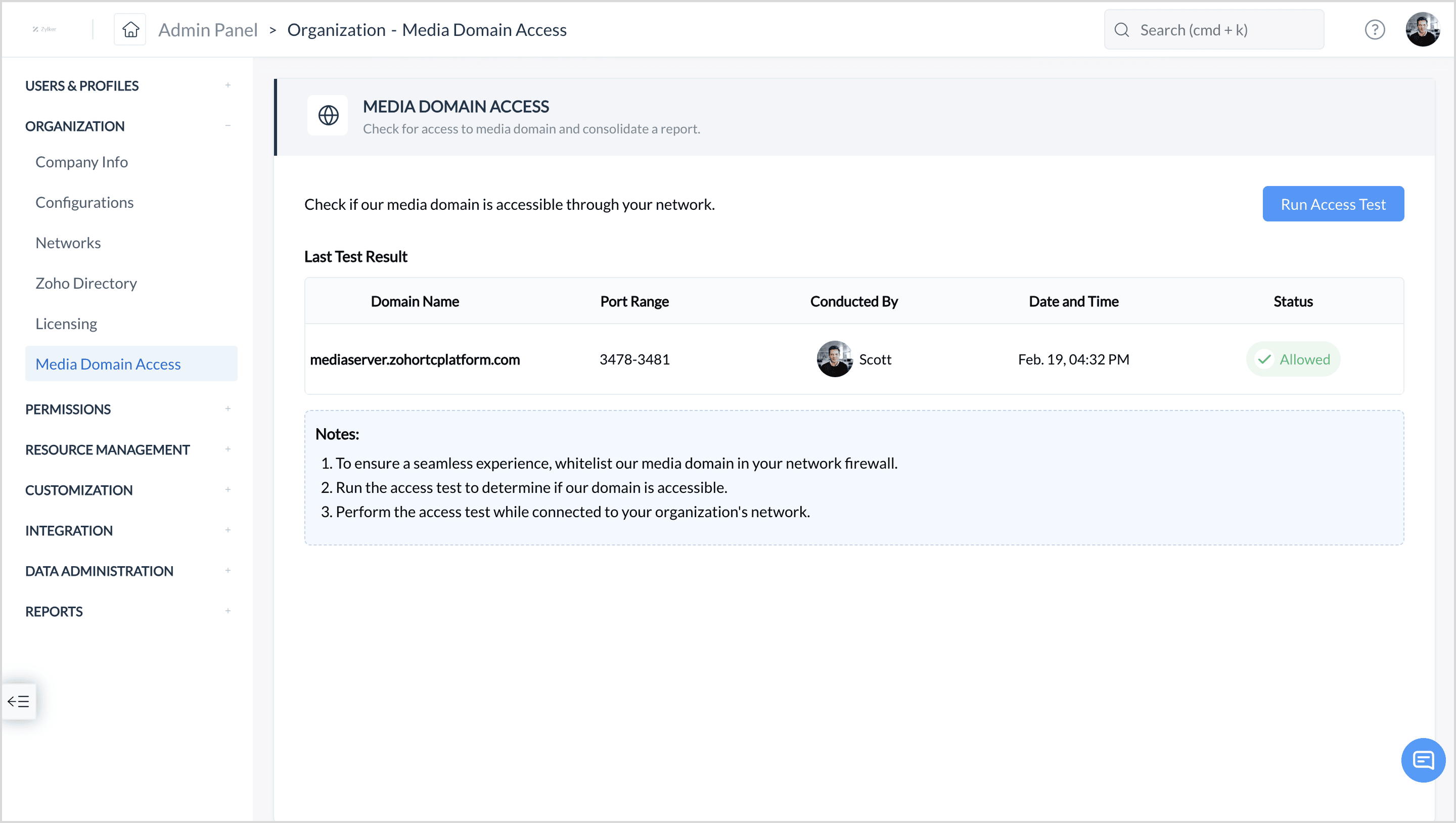 Once the media domain is whitelisted or if no firewall is configured in the network, the admin must run an access test to confirm that the status is set to "Allowed."