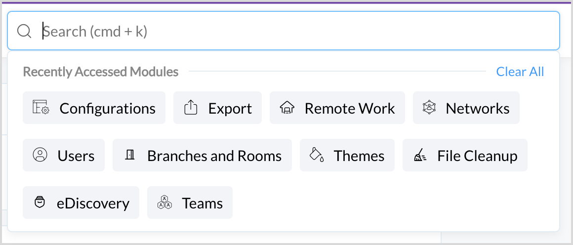 5. Zoho Cliq keeps track of your recent searches. You can access your last five searches under the Recent Accessed Modules section. Clicking on a recently accessed module will take you directly to that module.