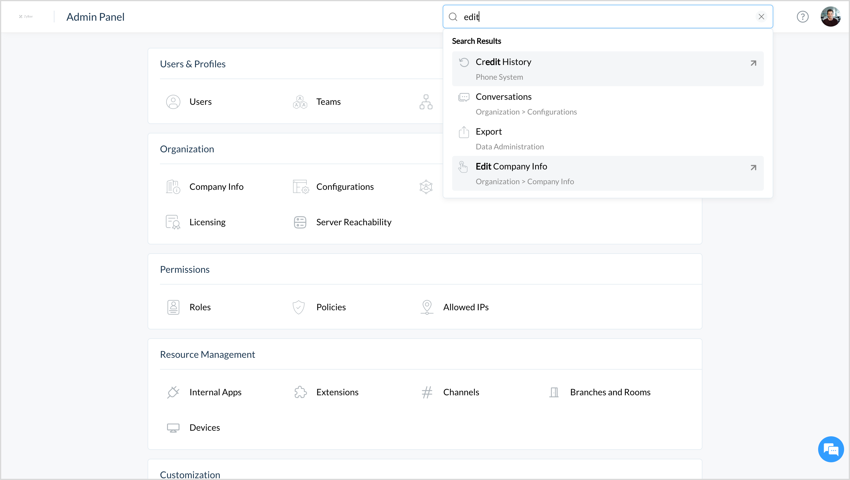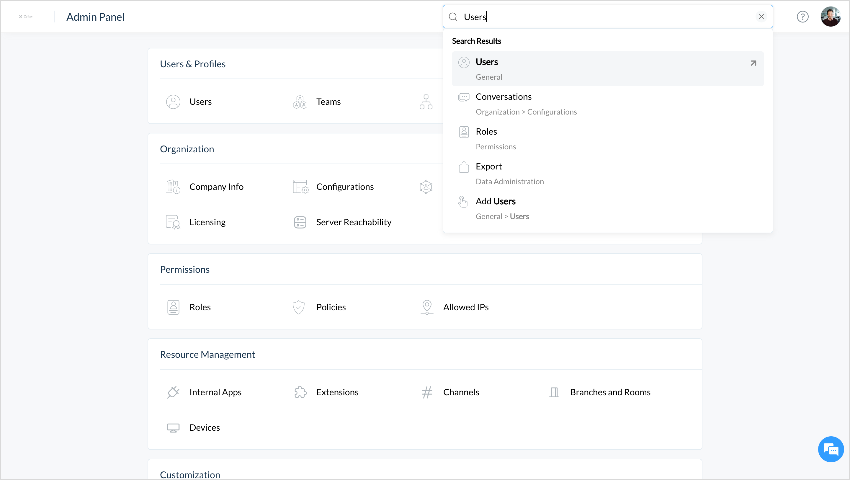 You can search for modules in Zoho Cliq's admin panel. You can also search for specific actions provided in each module. You can search for modules directly using the module names or use alias words that match the module names. To search for a module in the admin panel: