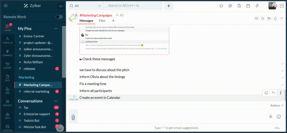 Turn your conversations into actions with the message action 'Create task'. Your conversations in Cliq will have a mix of new tasks, issues, future to dos, and new implementations—keep track of them all by sending it to your workspace as Tasks.