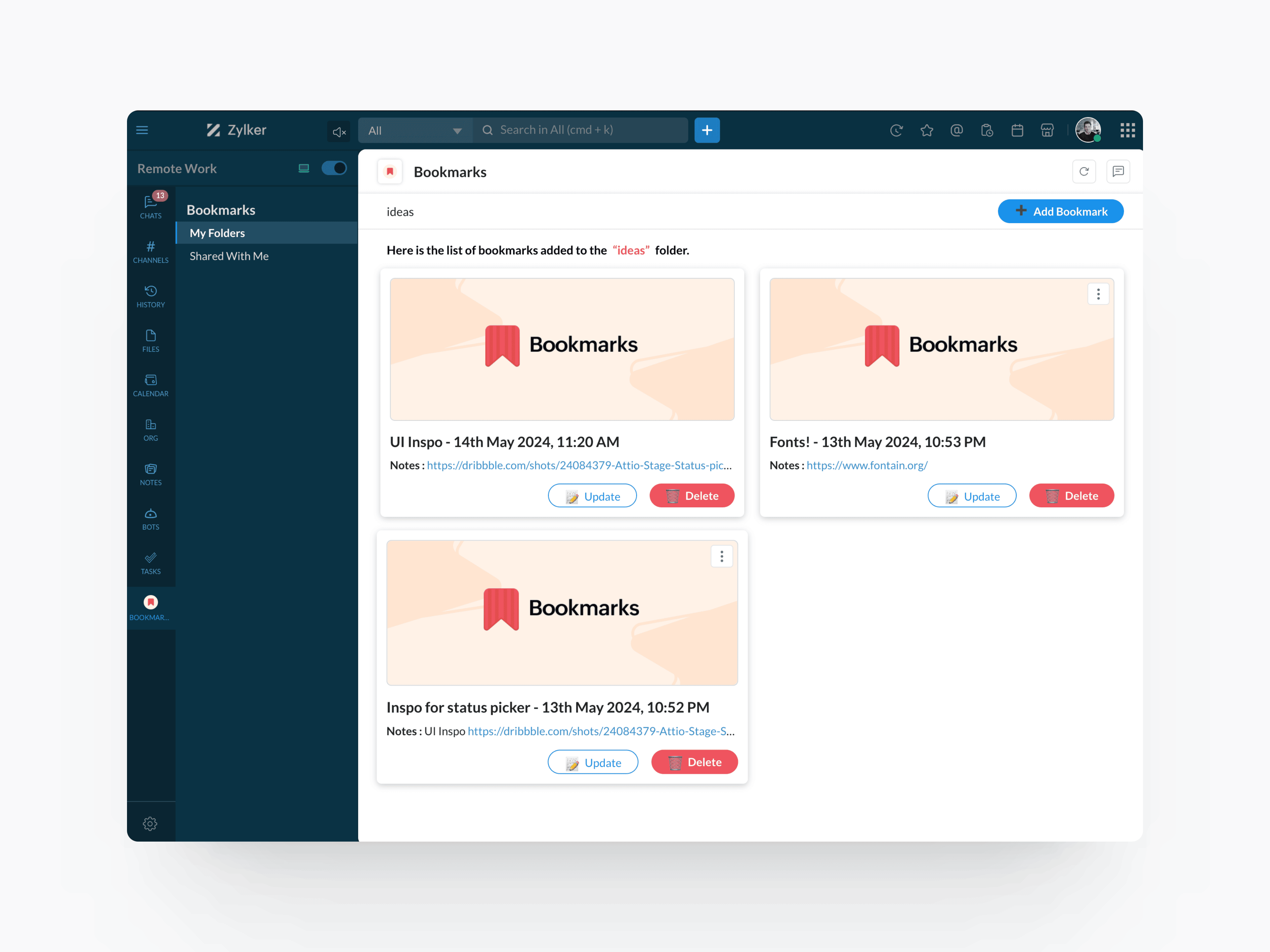 The Bookmarks Extension in Zoho Cliq offers a simple yet powerful way to save and access key information, whether within Zoho Cliq or from external sources. With features like adding bookmarks, viewing, saving messages as bookmarks, and managing and sharing folders, this extension simplifies the process of organizing and retrieving information, enhancing your workflow efficiency and ensuring your key information is always at your fingertips in Zoho Cliq.