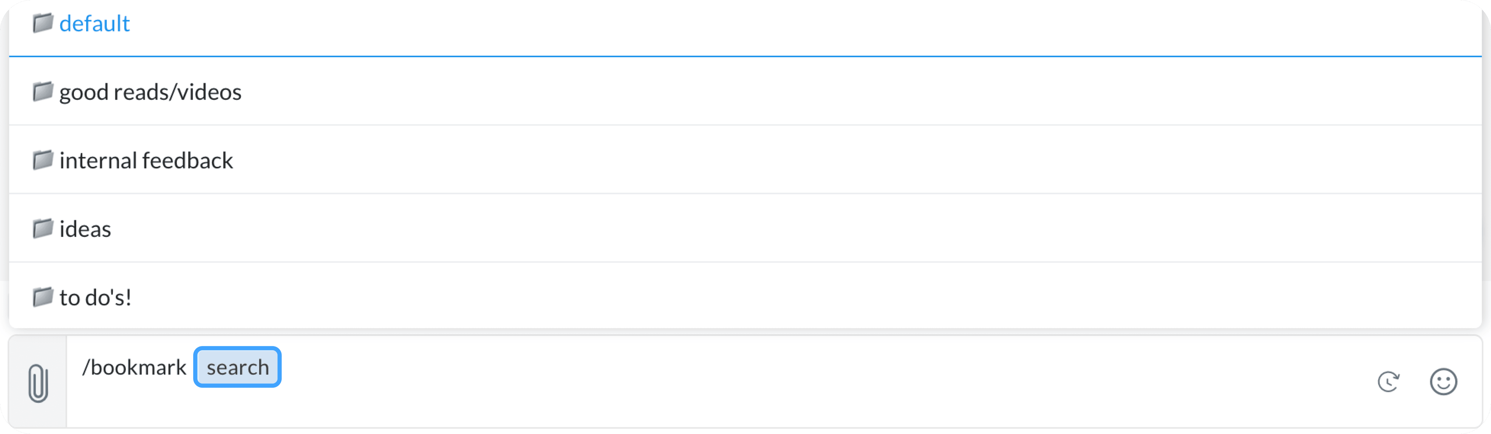 /bookmark - search: Execute the slash command /bookmark - search to search your bookmarks within the chosen folder from any conversation.