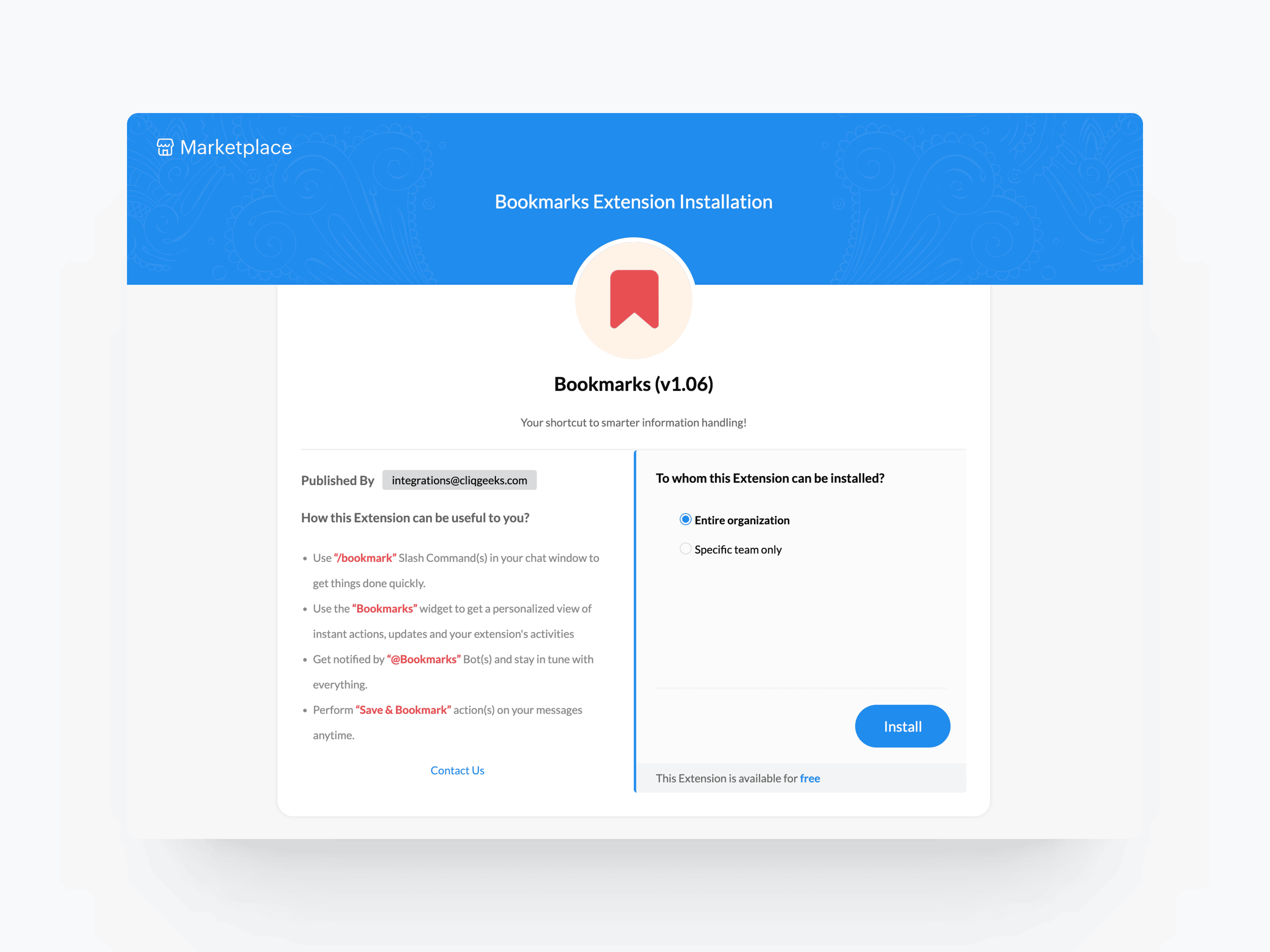 Go to the Zoho Cliq Marketplace and search for "Bookmarks for Zoho Cliq" or install it from here →.
