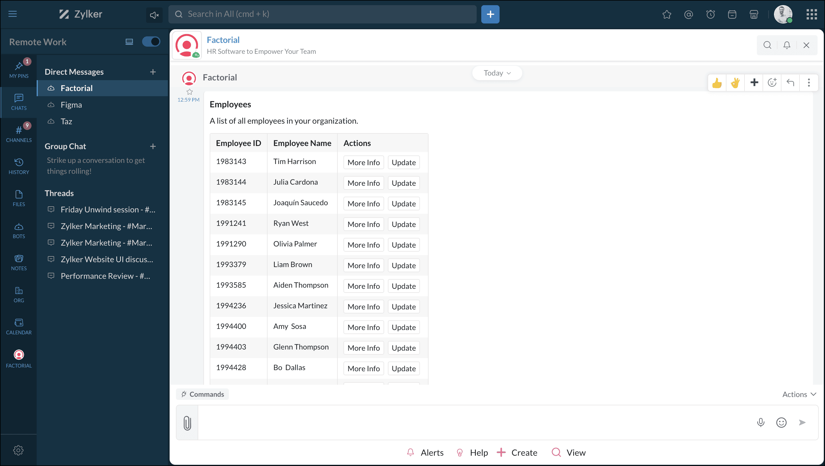 Bot Menu Action: Go to the Factorial HR bot, then click View, followed byEmployee to view the list of employees. The list will display employee details, such as name and email address, in a tabular format. You can also view more information on the employee, as well as update the employee details.