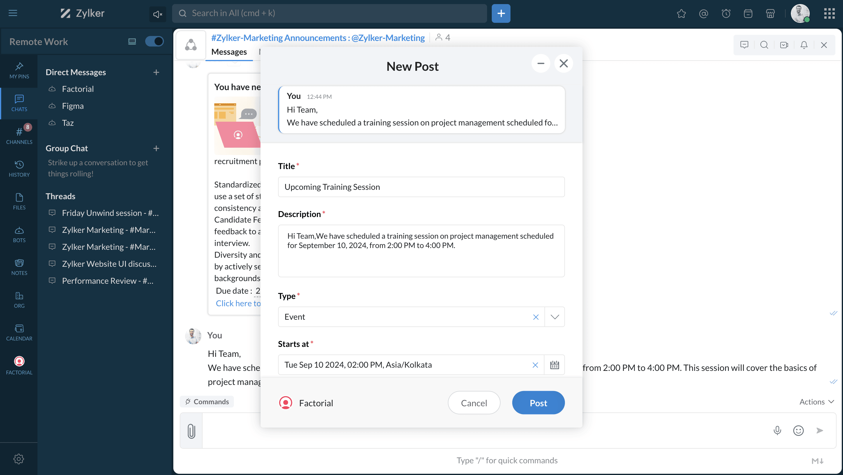 Slash Command: Use the /post slash command to create posts. You can add the Title, Description, Type of Post, Start Date, Location, and enable Allow Comments and Reactions.