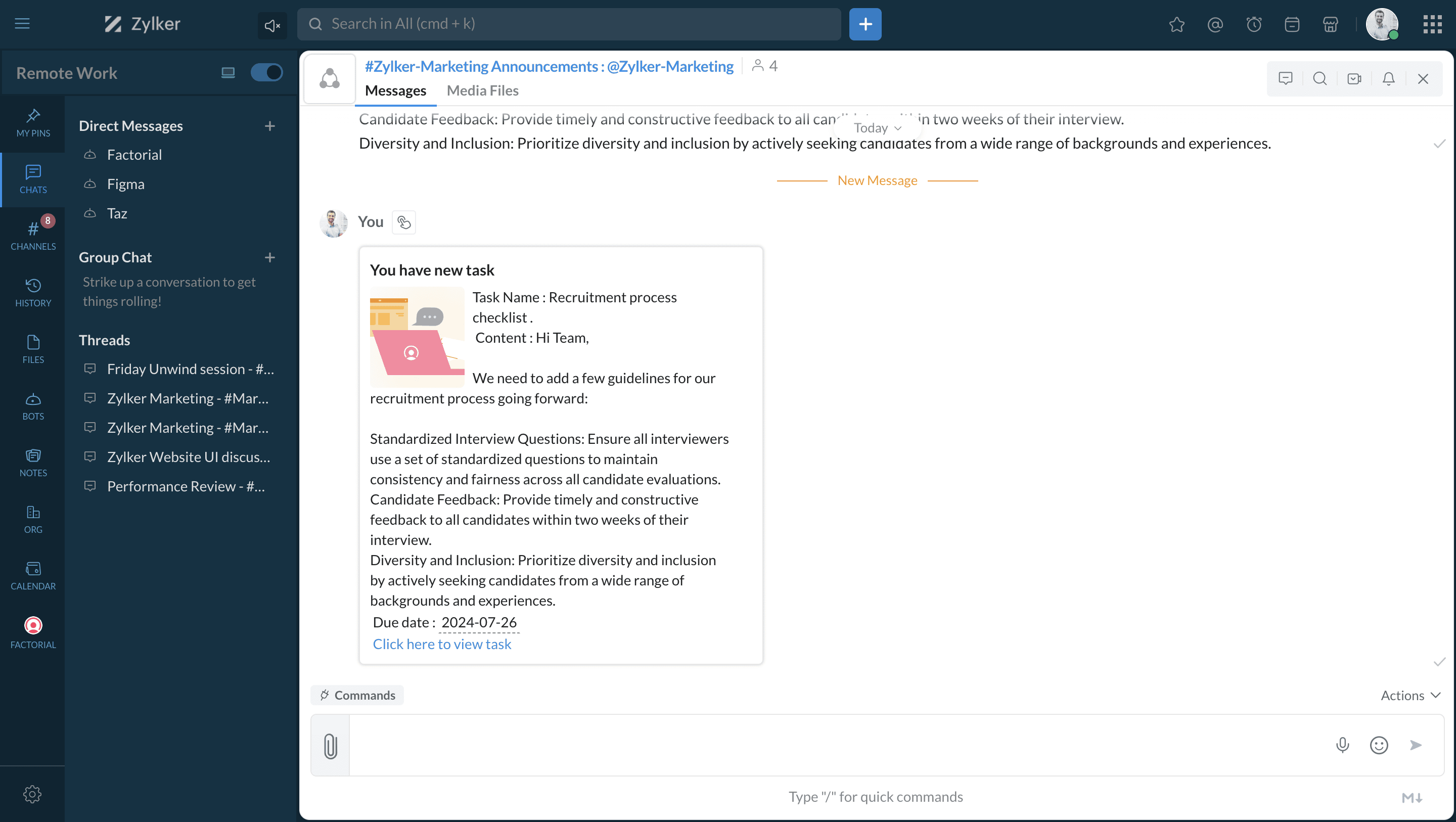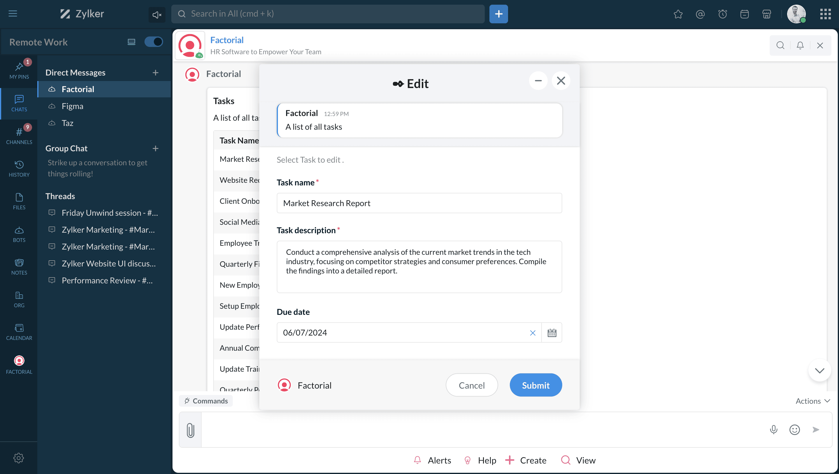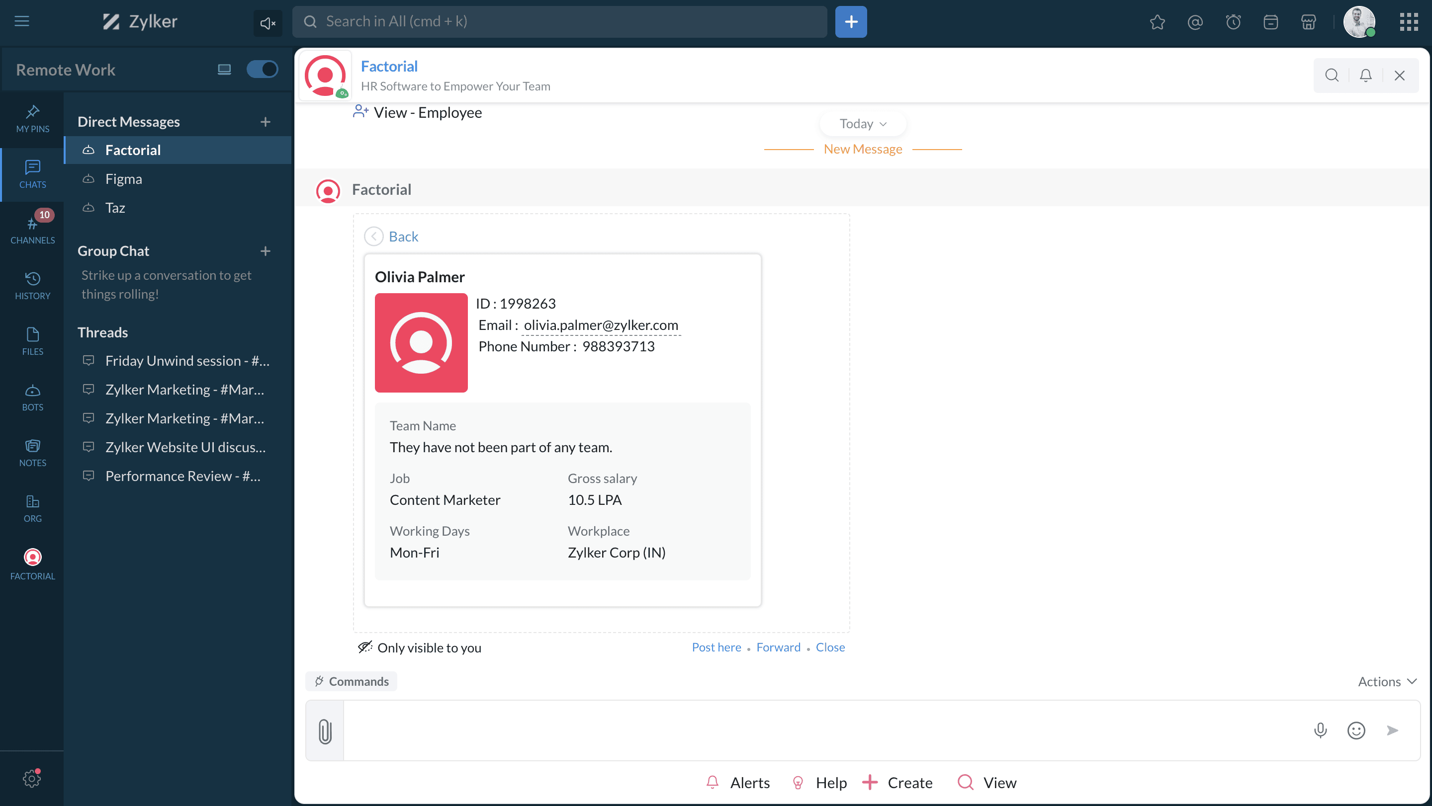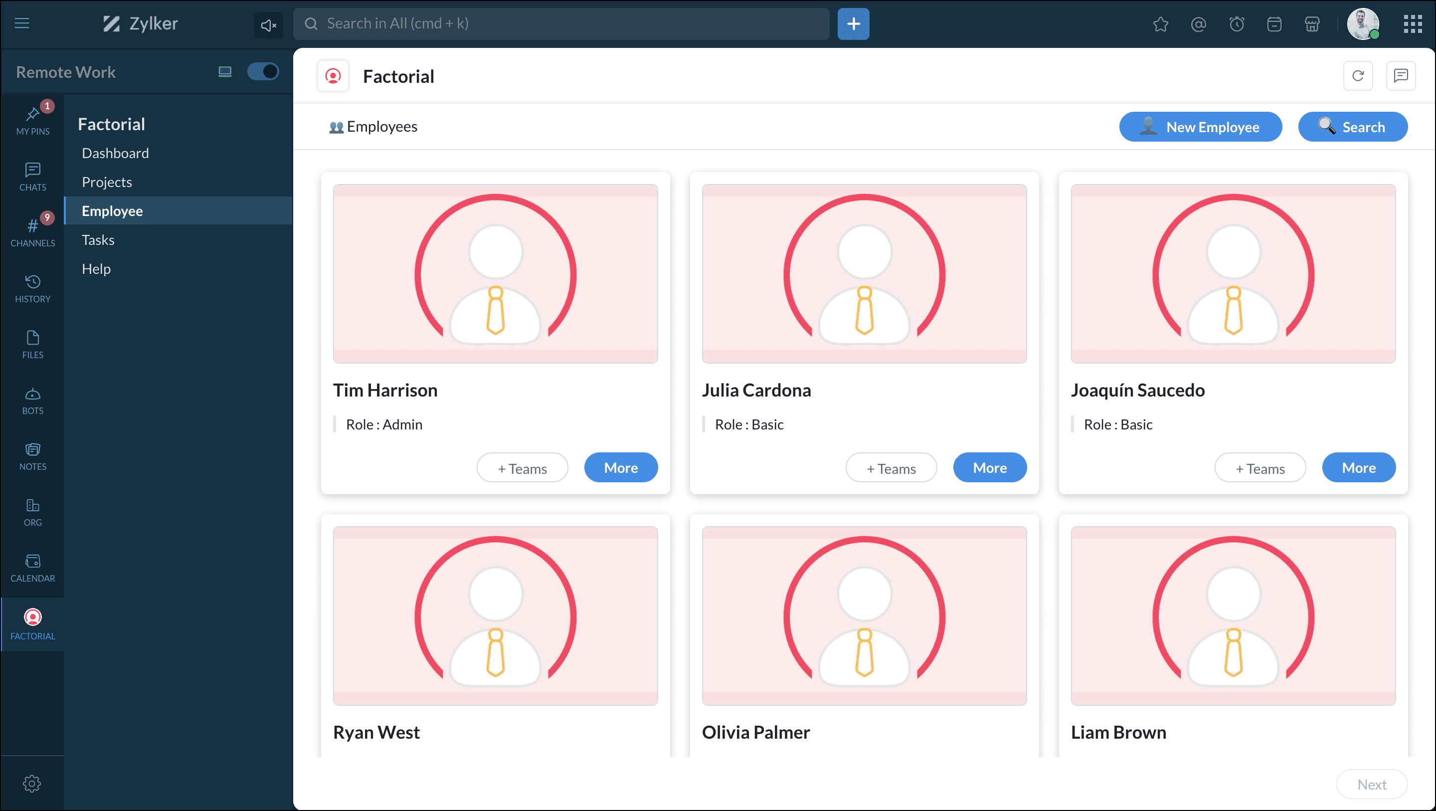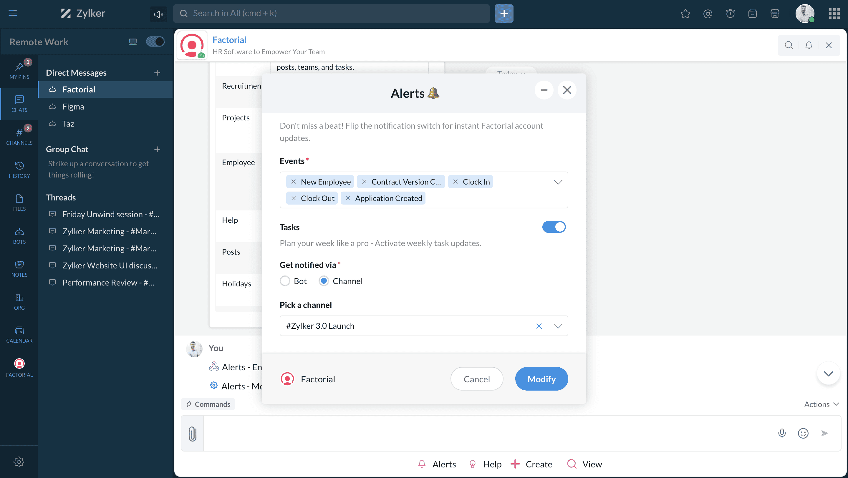 By integrating Factorial HR with Zoho Cliq, you can receive alerts on various events like adding employees, creating tasks, and viewing details of employees and tasks directly within Cliq.