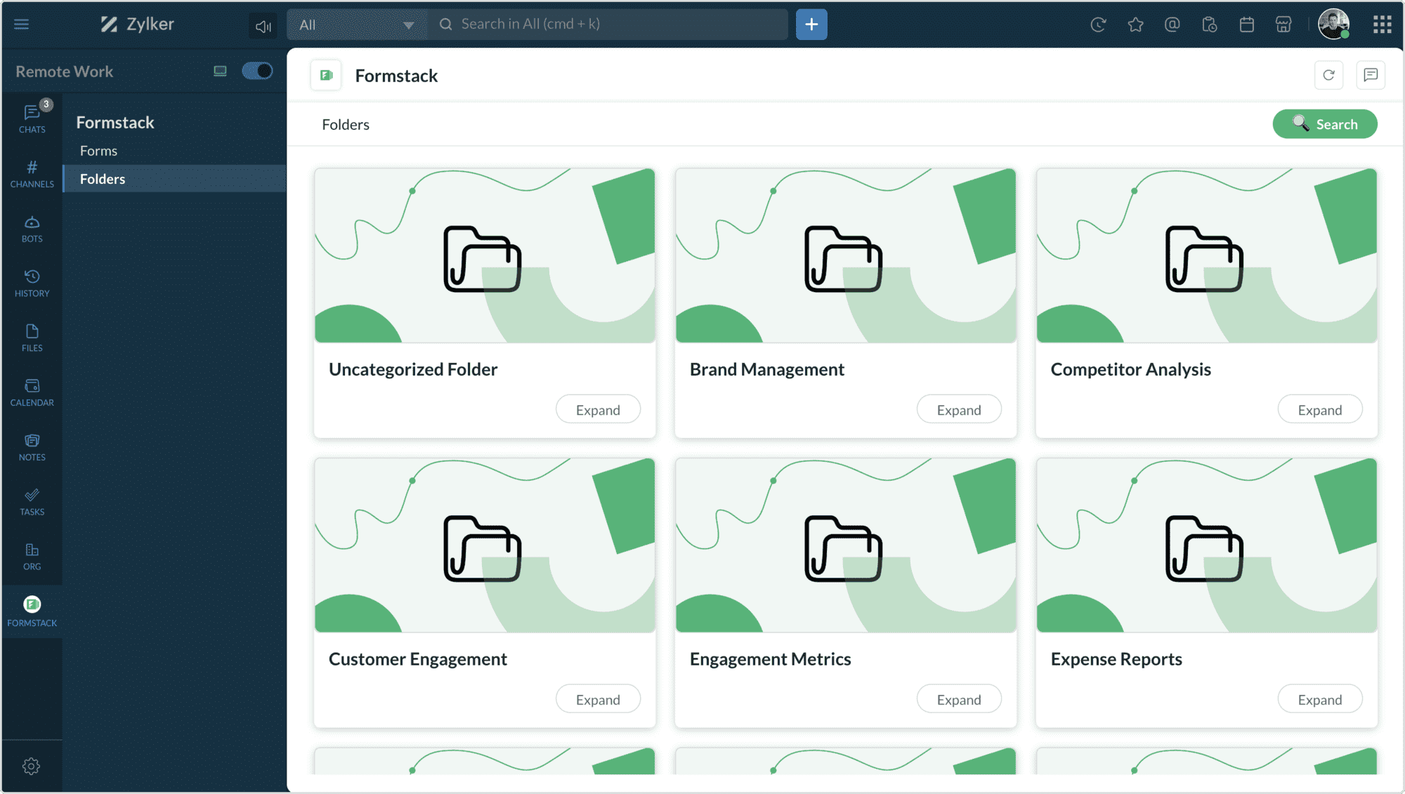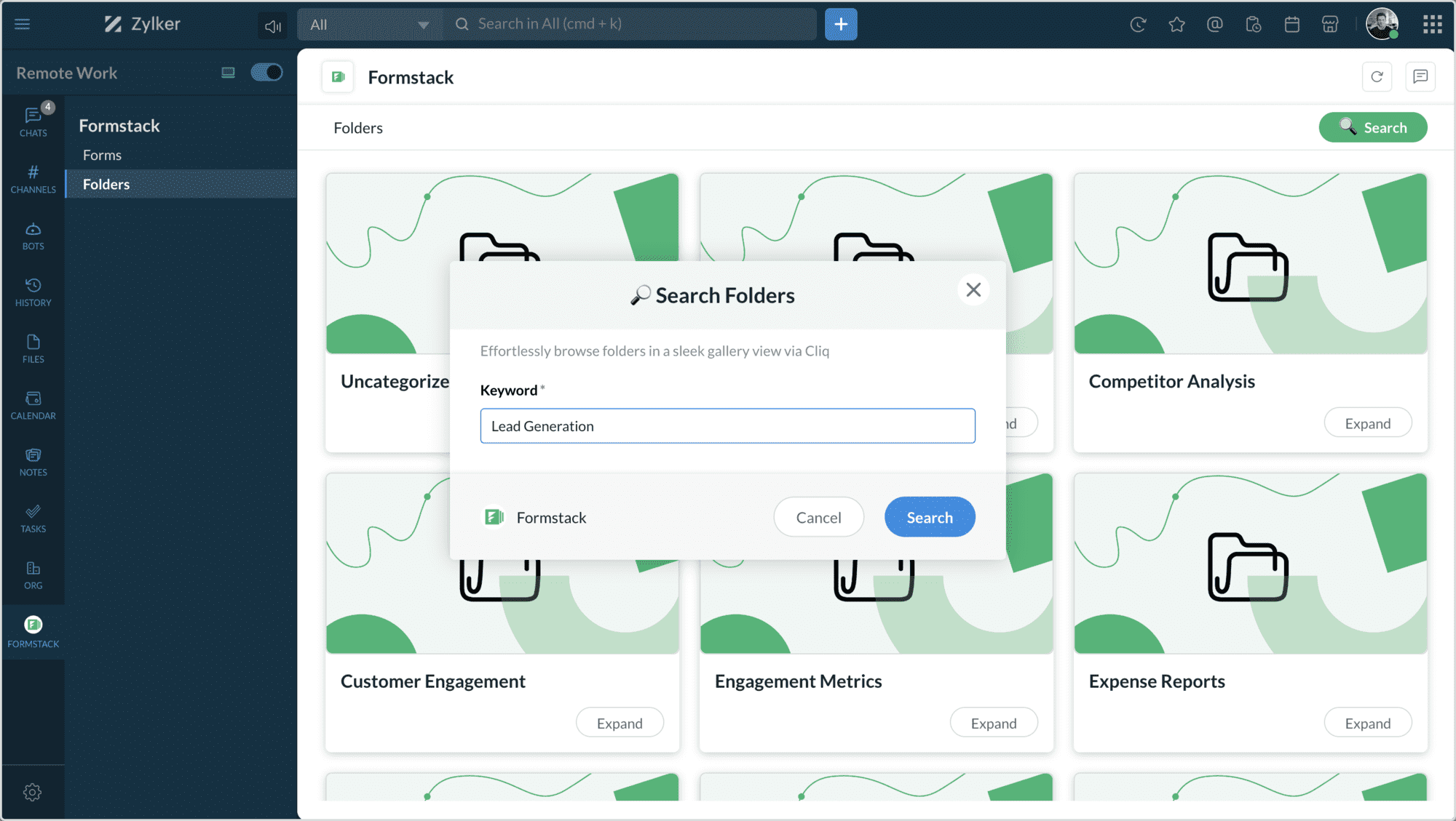 The Formstack widget has two tabs: Forms and Folders.
