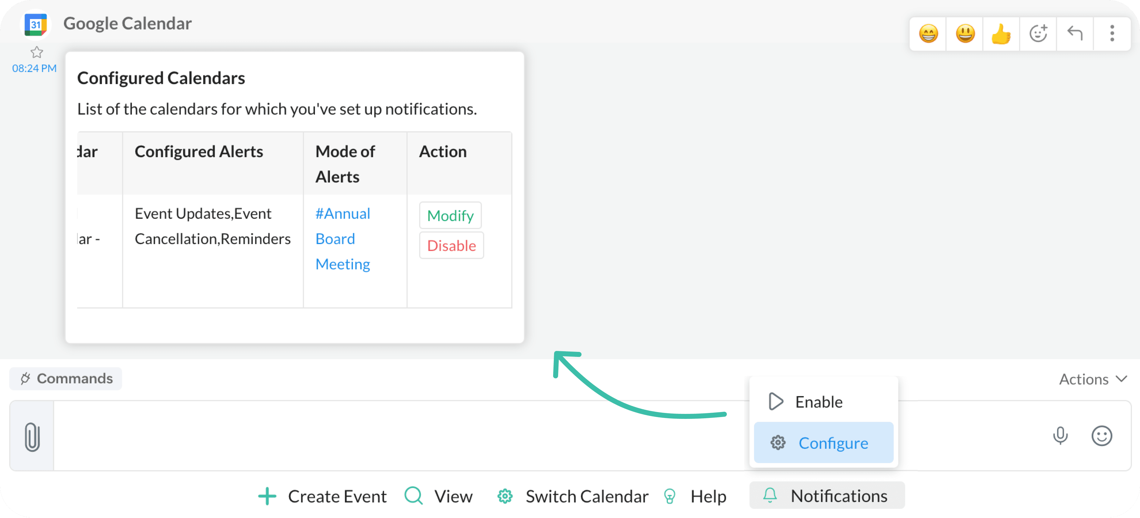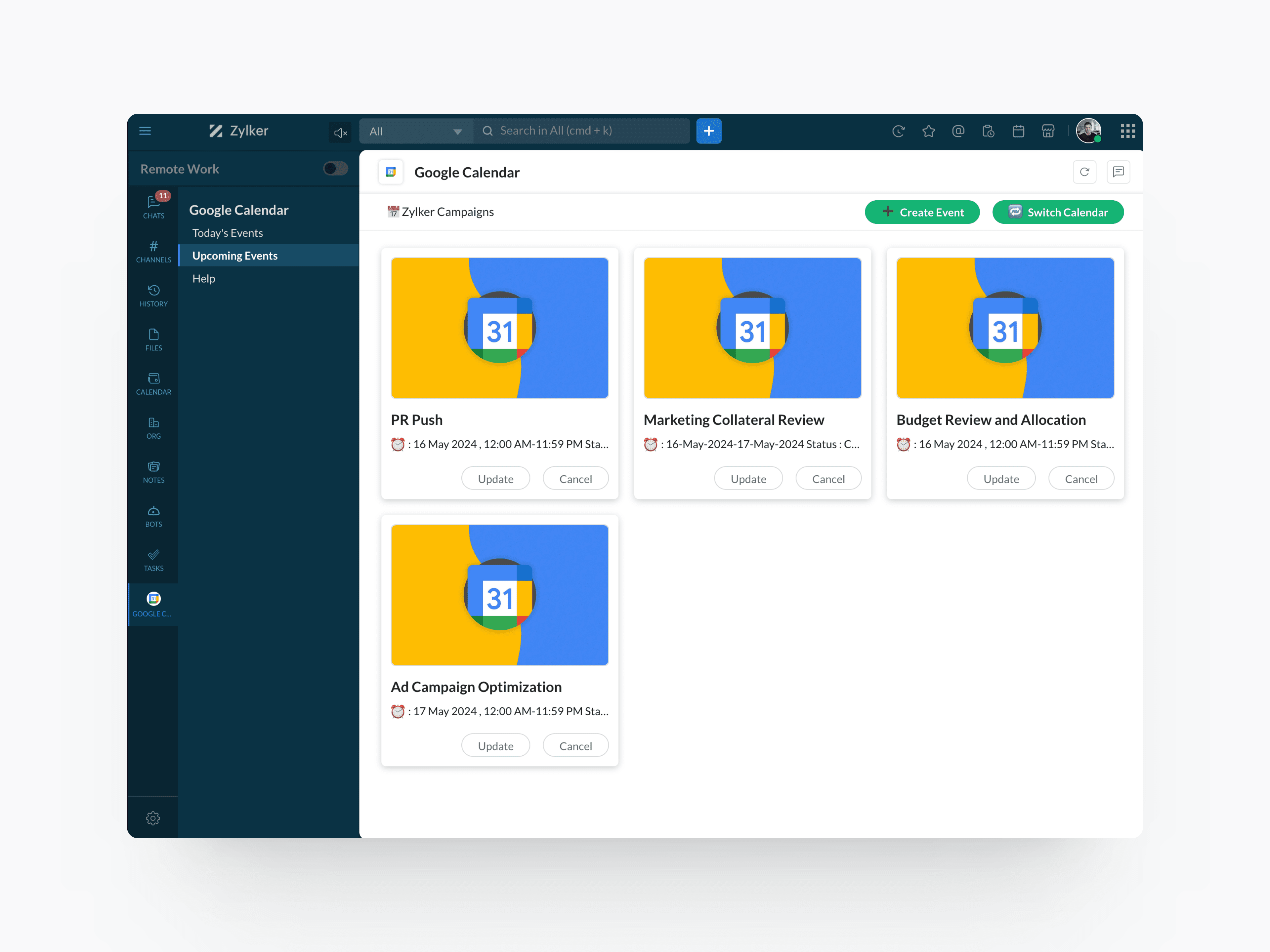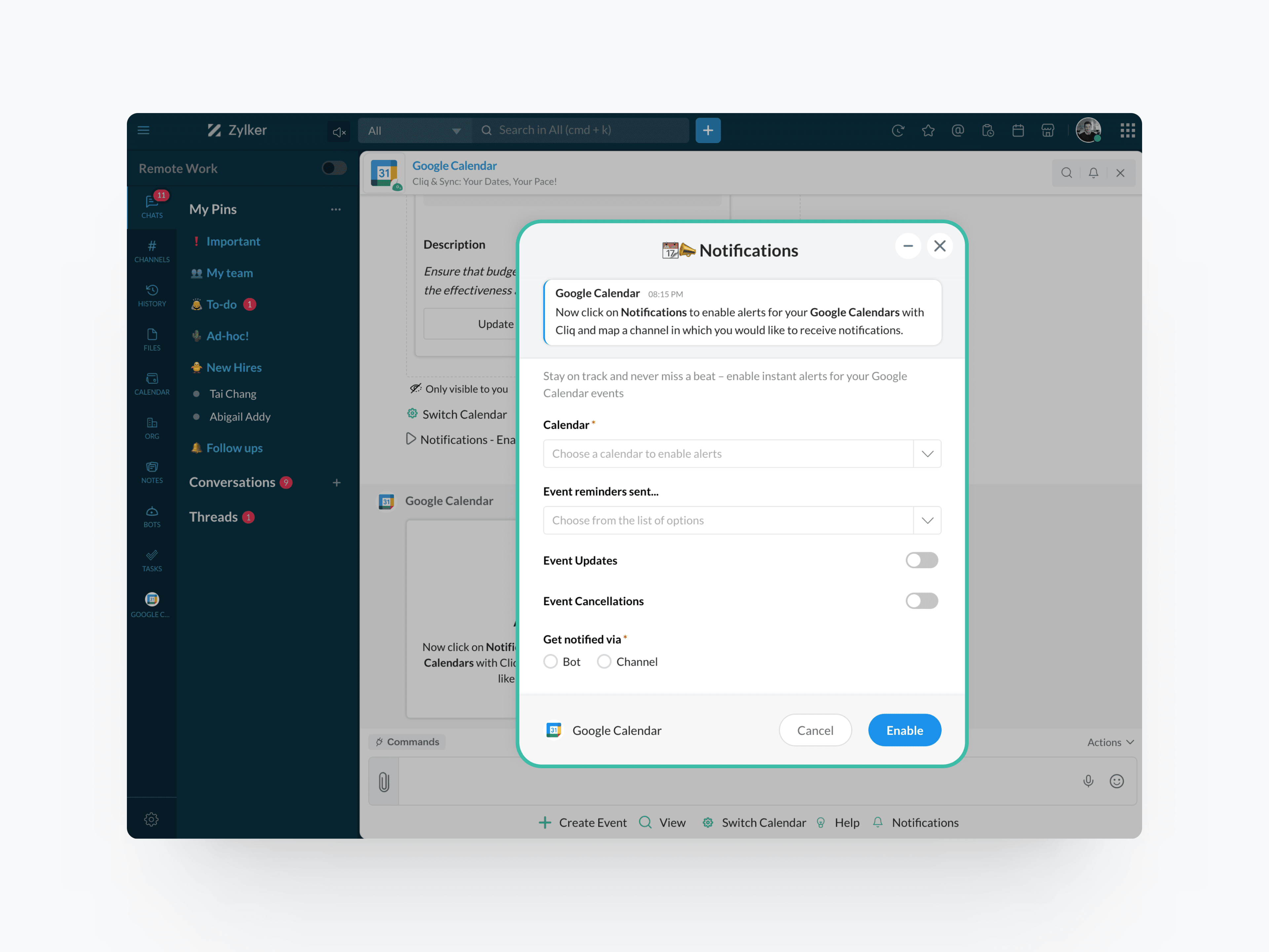 Google Calendar for Zoho Cliq streamlines your team's scheduling and ensures everyone stays informed and organized about upcoming events and meetings with notifications, event reminders, and more. Seamlessly merge your Google Calendar events with Zoho Cliq to enhance collaboration and productivity across your organization.