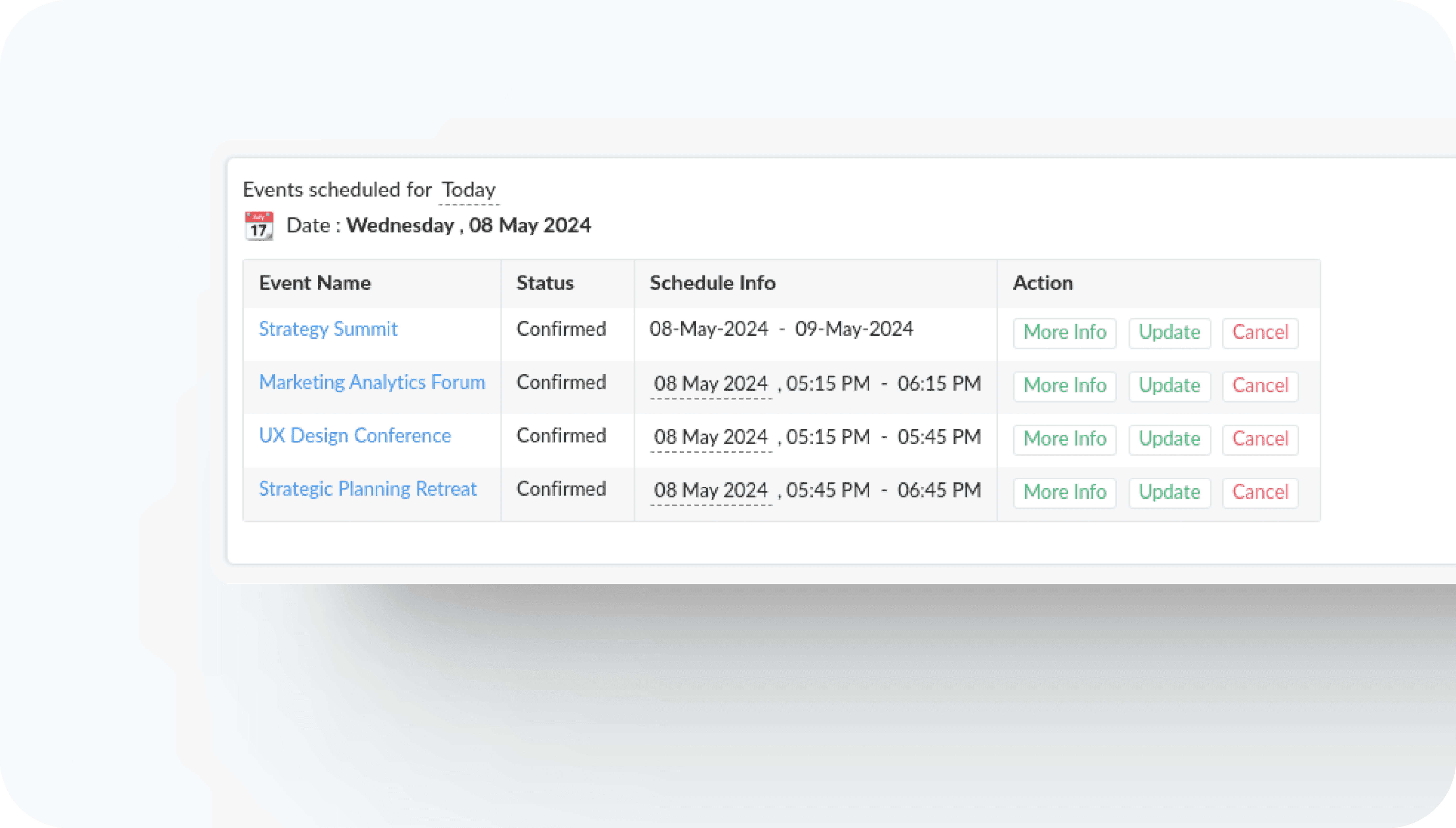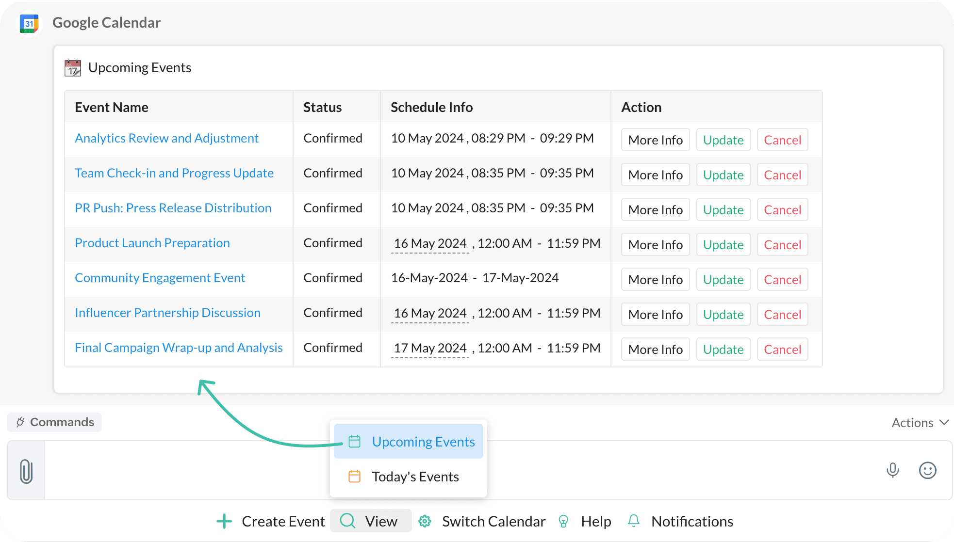 Google Calendar bot: Click on the View menu action → Today's Events or Upcoming events to view them all. Click on More info to view more details. You can also update and cancel the events from this view.