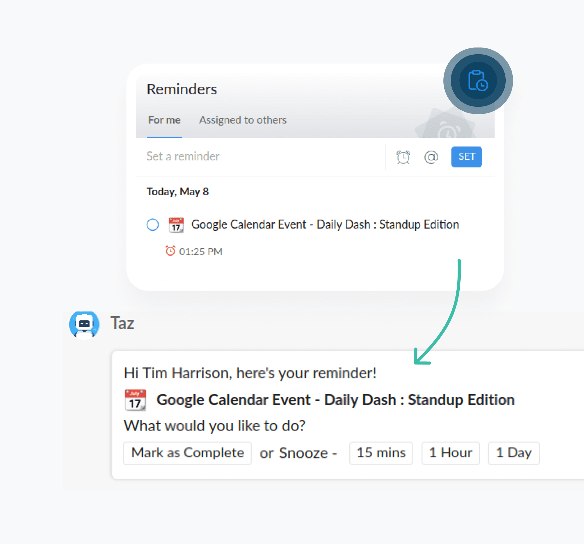 Based on your notification configuration, you will receive reminders minutes before or at the start of each event via a Taz notification.
