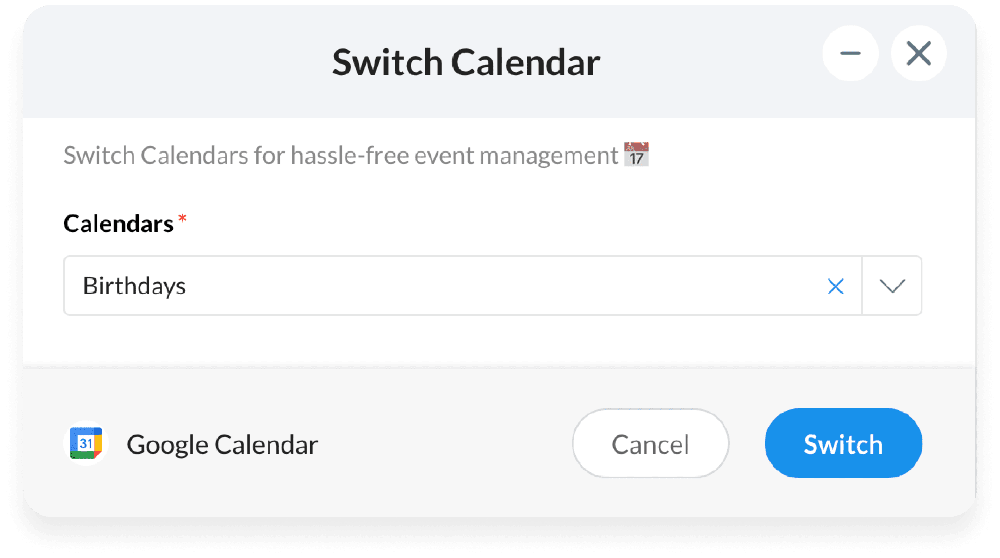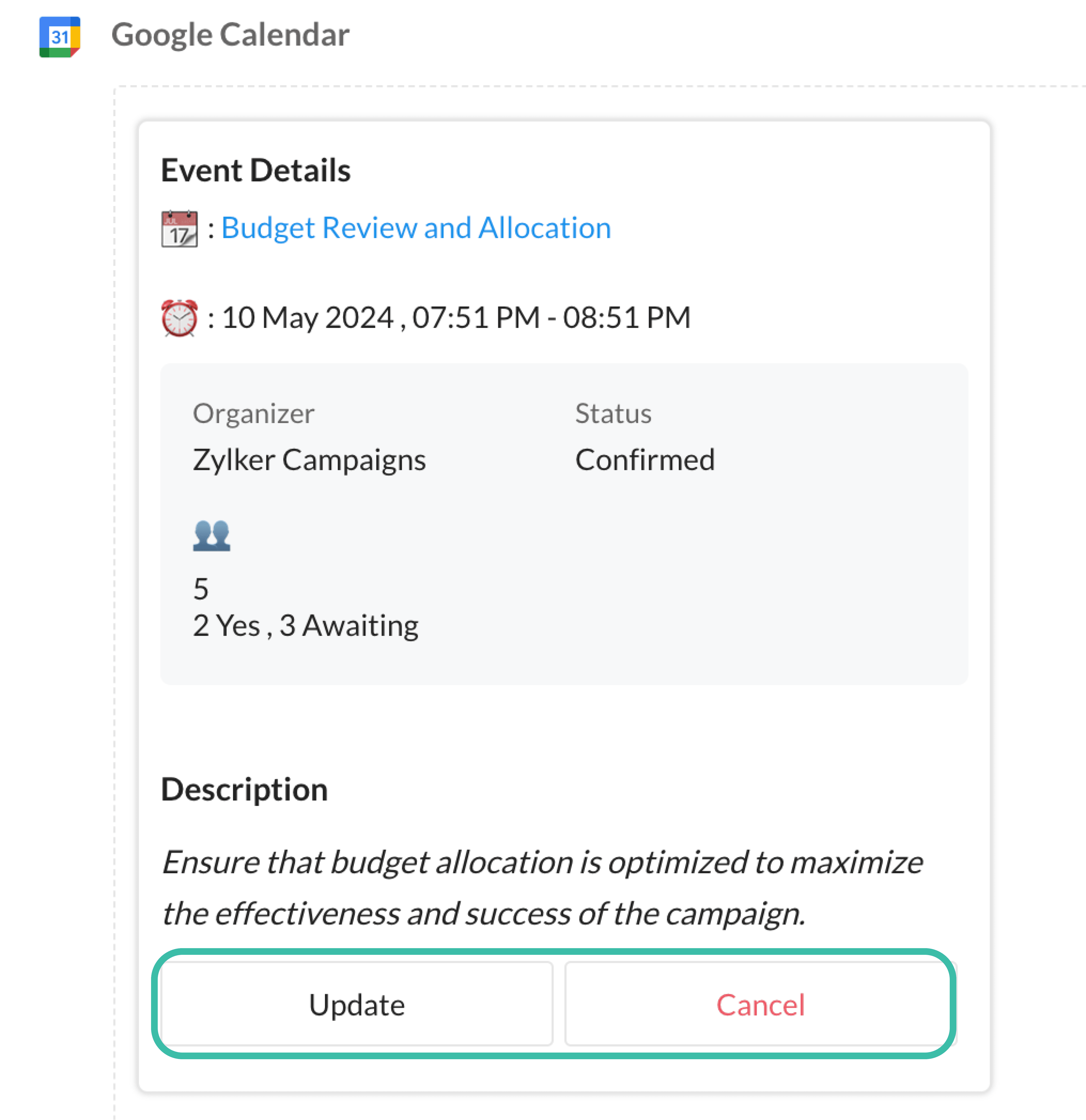 With the Google Calendar integration for Zoho Cliq, your team can streamline scheduling, enhance collaboration, and boost productivity by seamlessly merging their Google Calendar events with Zoho Cliq with nifty reminders and notifications so you don't miss a beat.