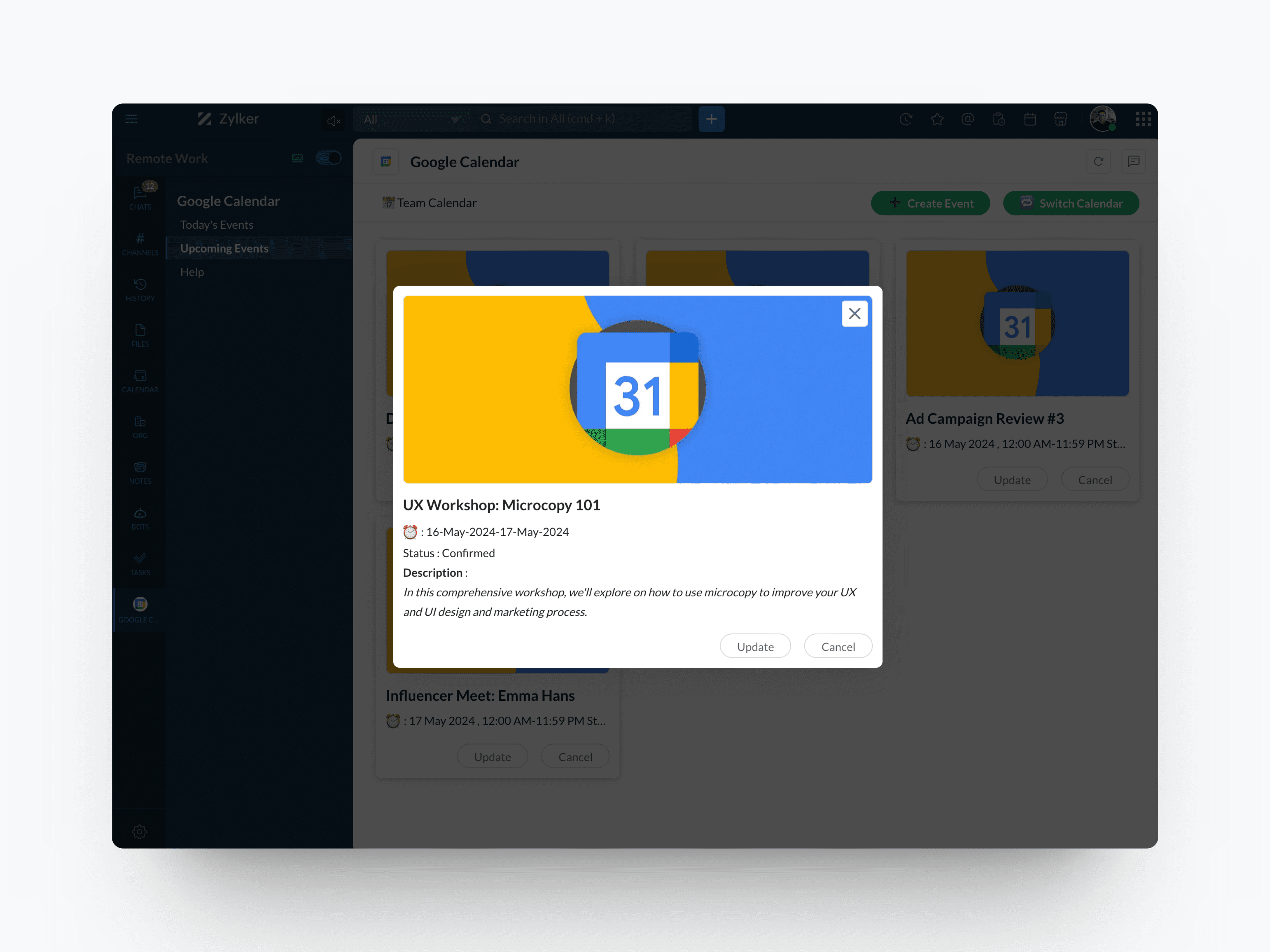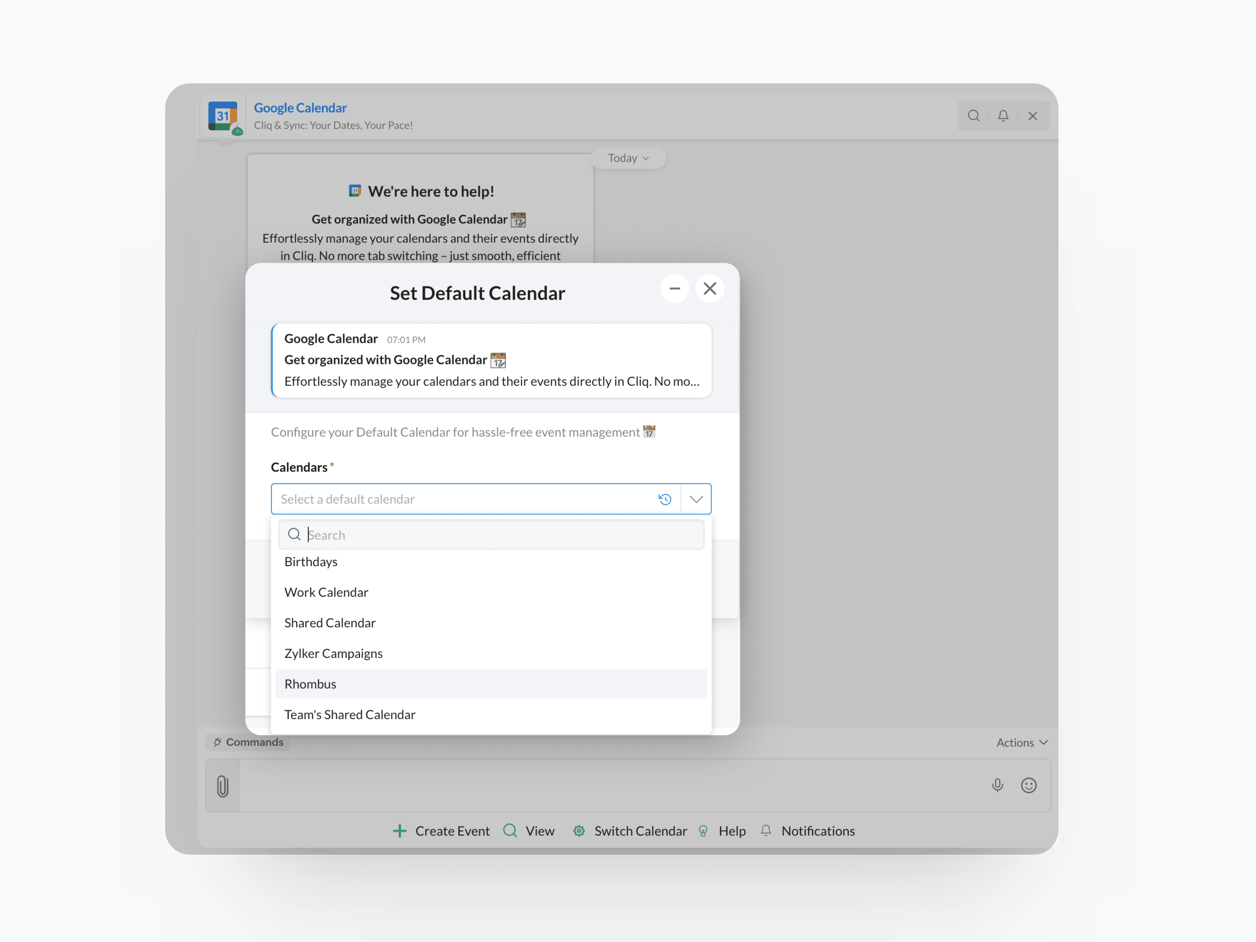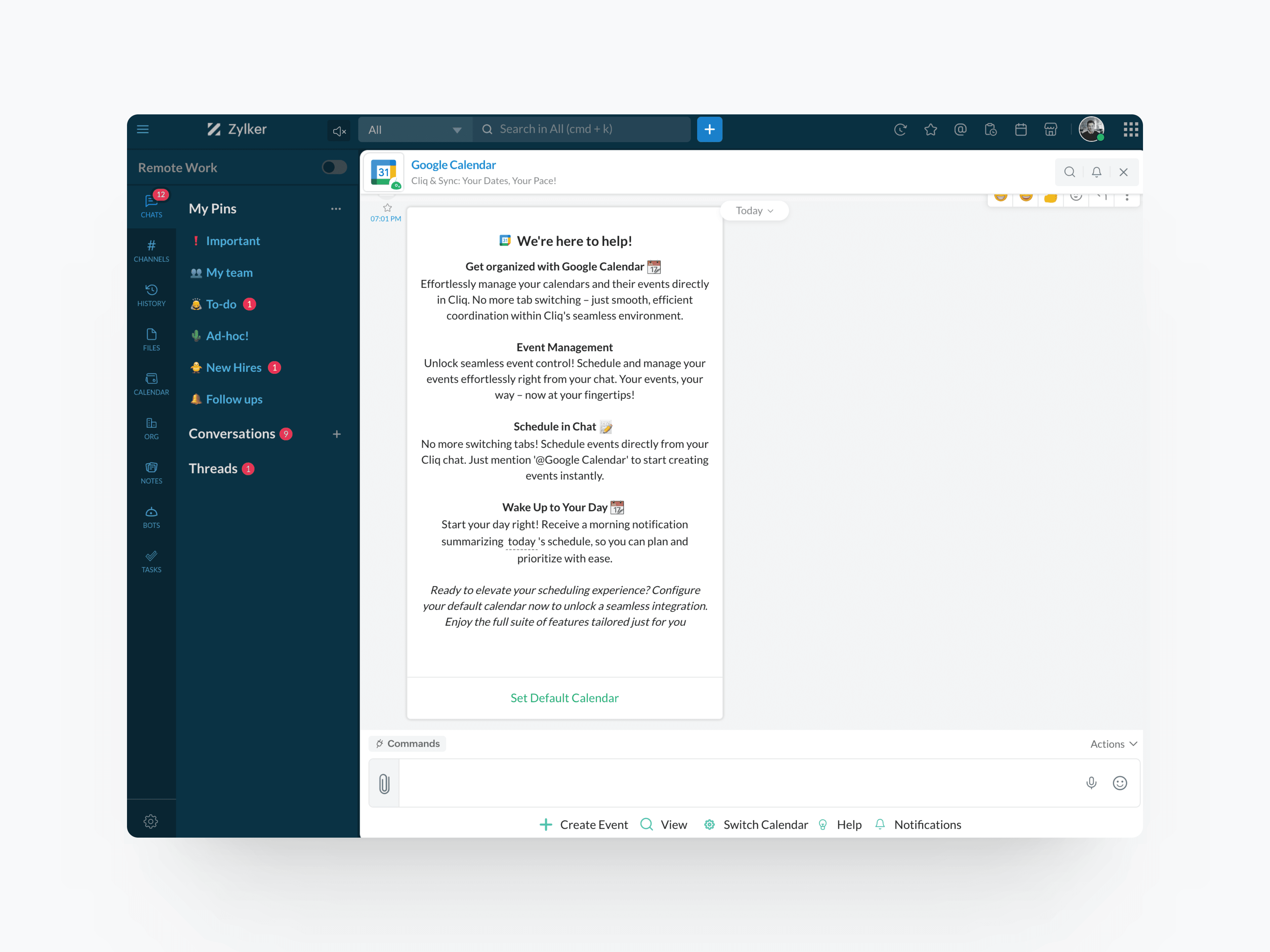 Effortlessly schedule meetings, organize events, and coordinate activities contextually and directly within Zoho Cliq.