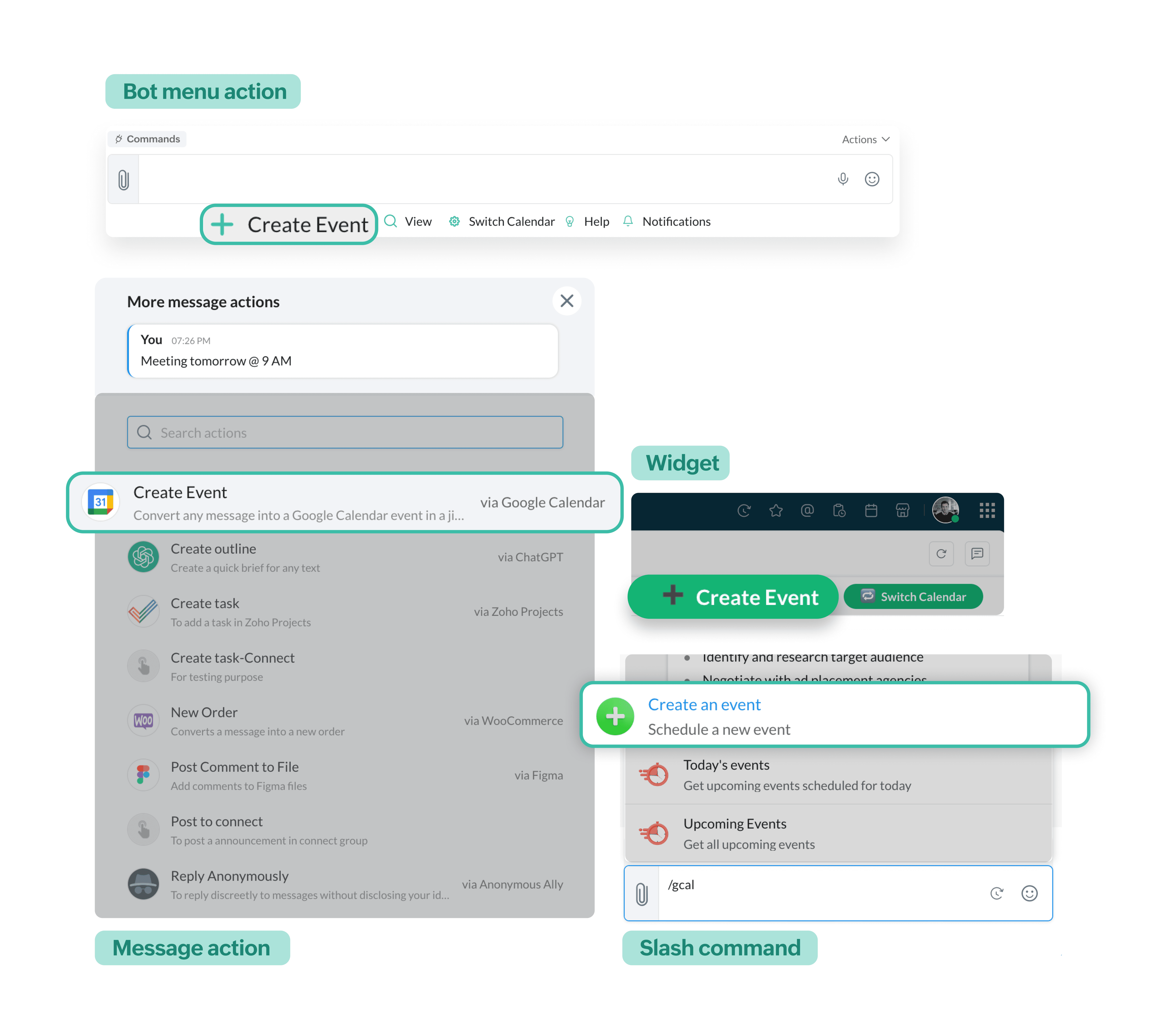 Bot menu action : Go to the Google Calendar bot → find the + Create Event bot menu action below to create an event.