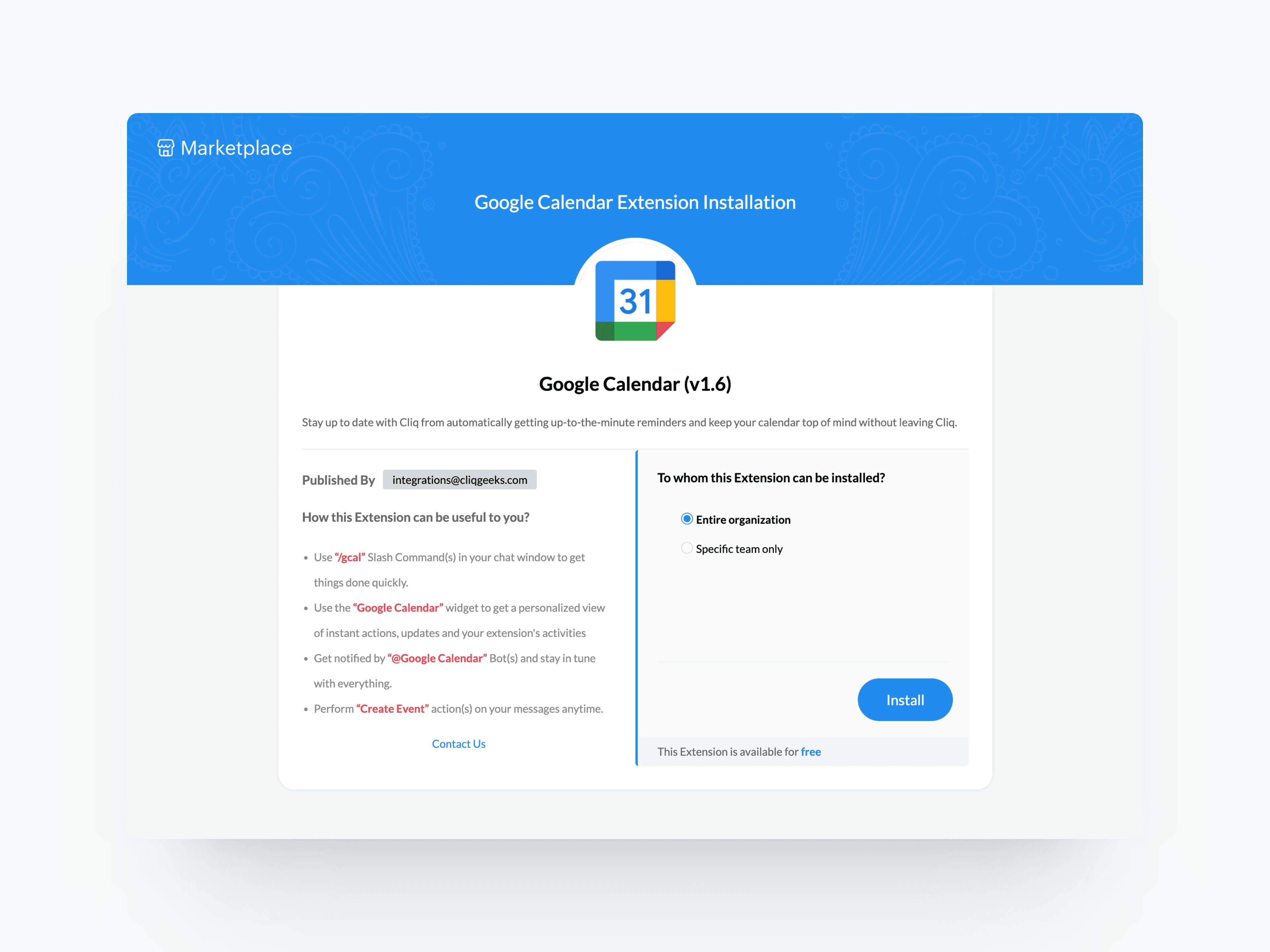 Go to the Zoho Cliq Marketplace and search for "Google Calendar for Zoho Cliq" or install it from here →.