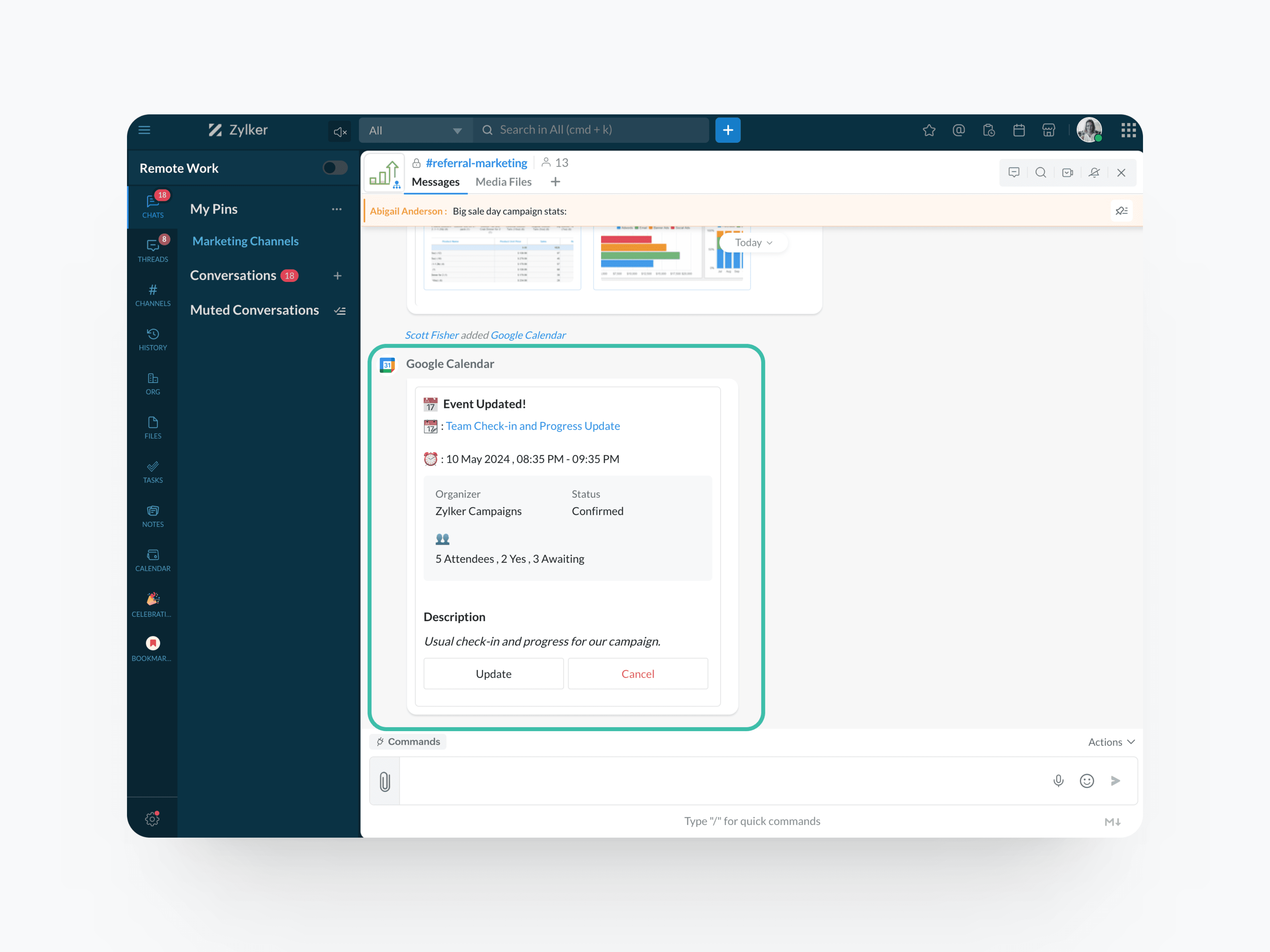 Receive timely notifications to scheduled meetings, events, or activities directly within Zoho Cliq, ensuring seamless communication and coordination, so your team doesn't miss a beat.