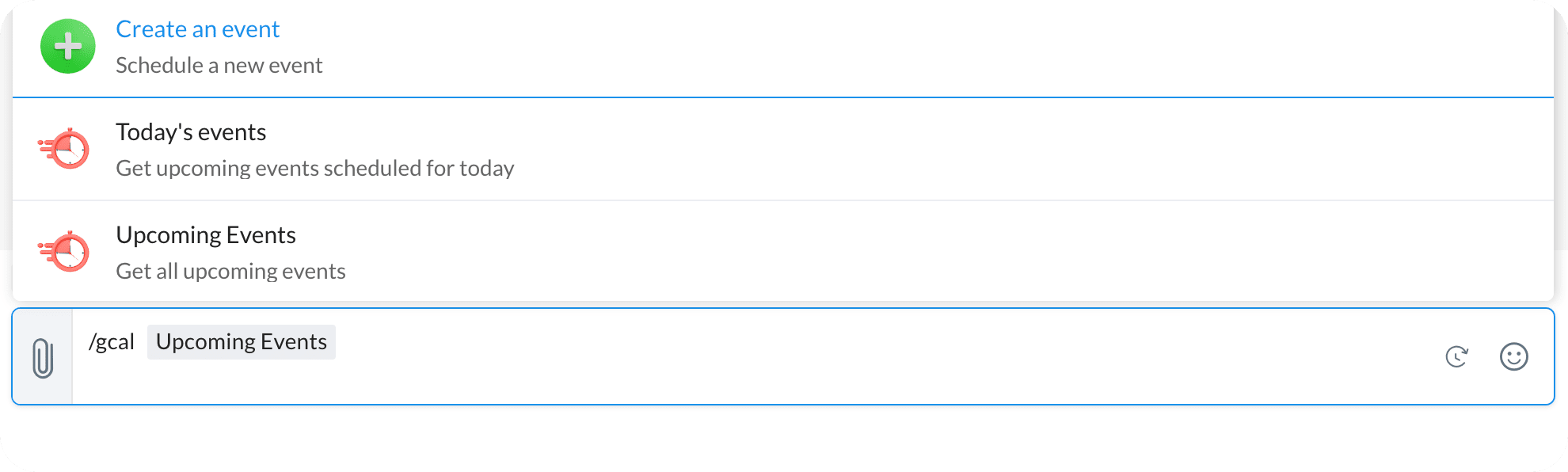 /gcal : Use the slash command to quickly whip up upcoming or today's events from any chat window you'd like, without interrupting your conversation.