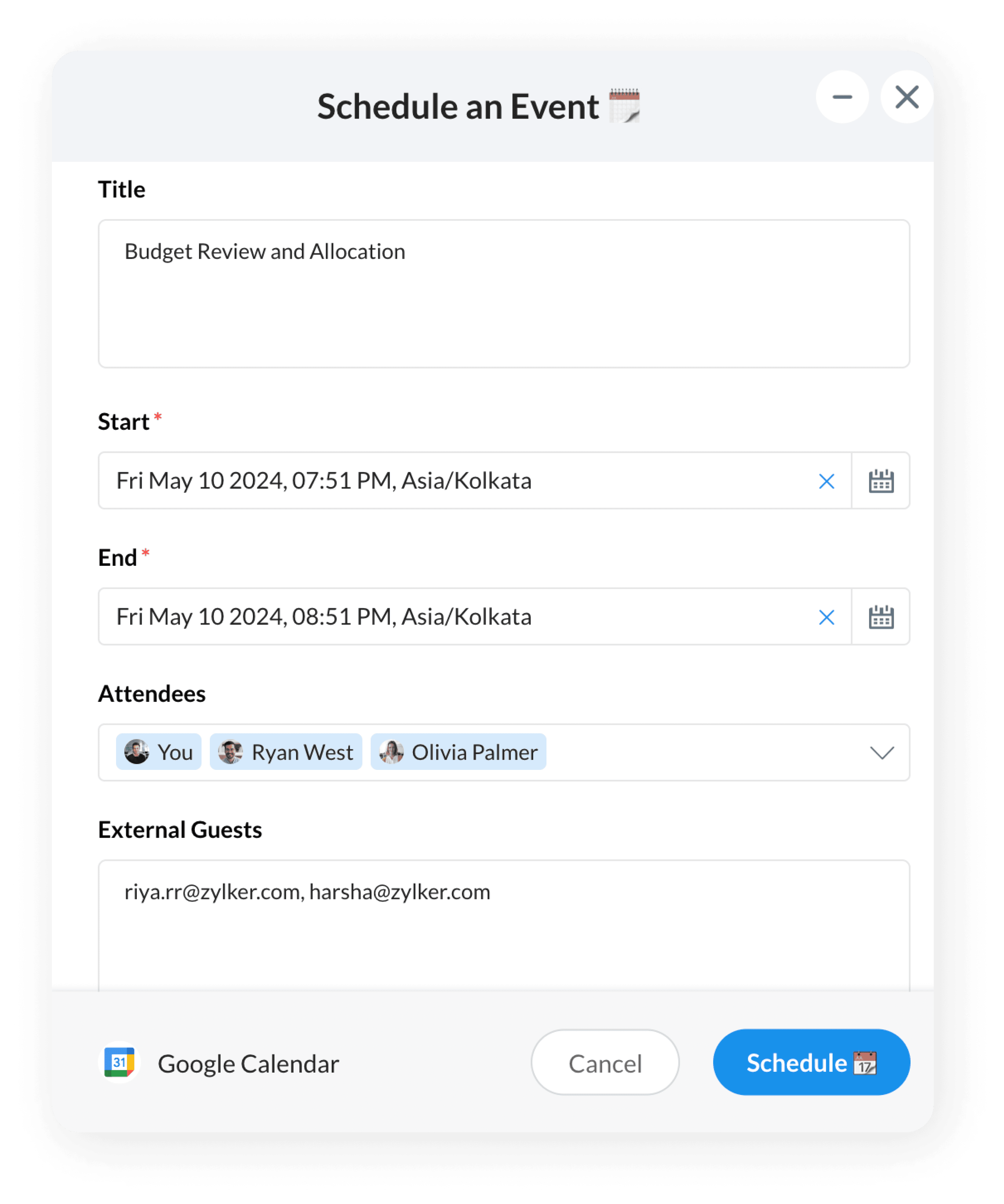 External guests: Enter the email addresses of external participants who are not part of your Zoho Cliq organization or team, separating each address with a comma.