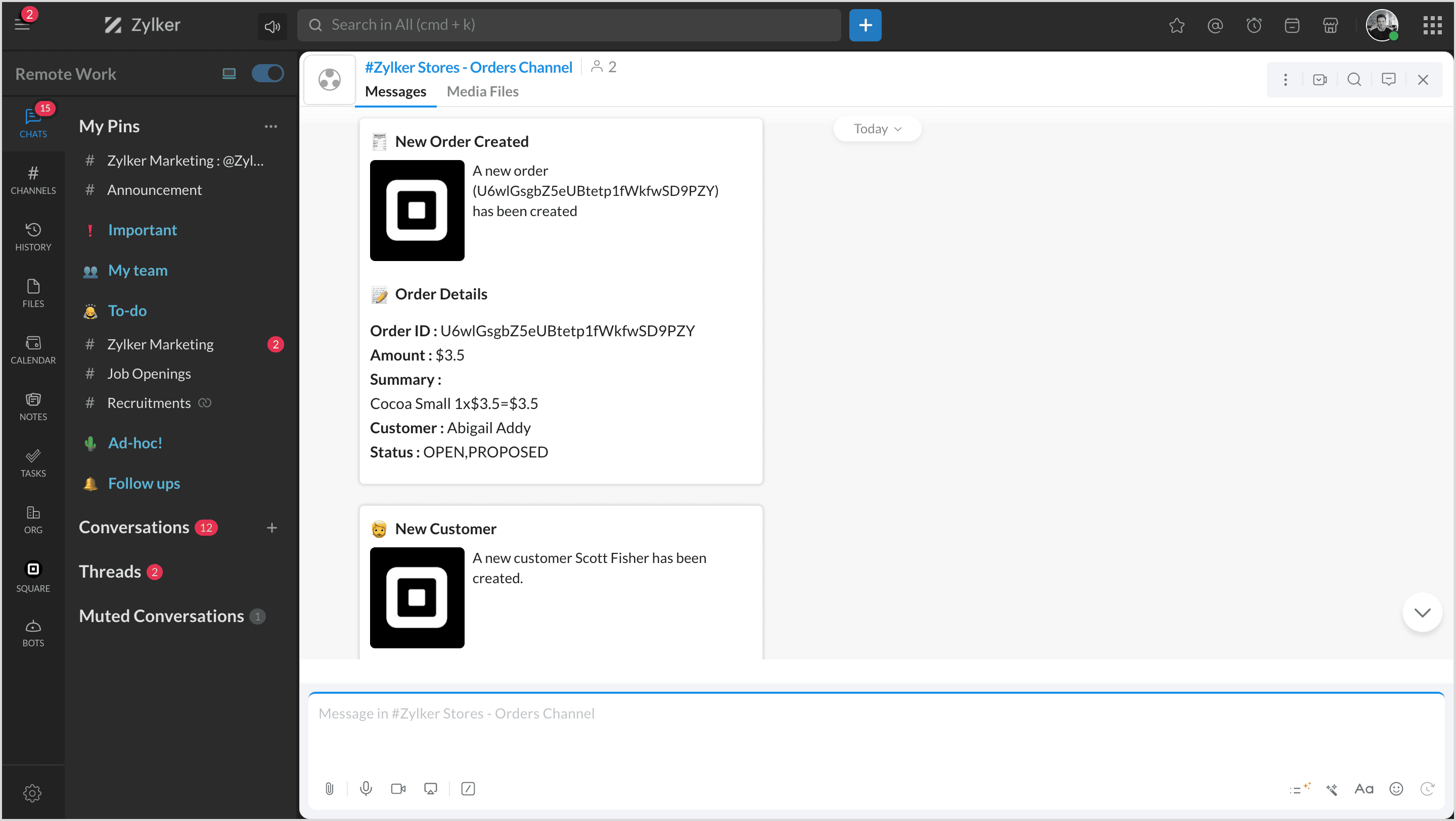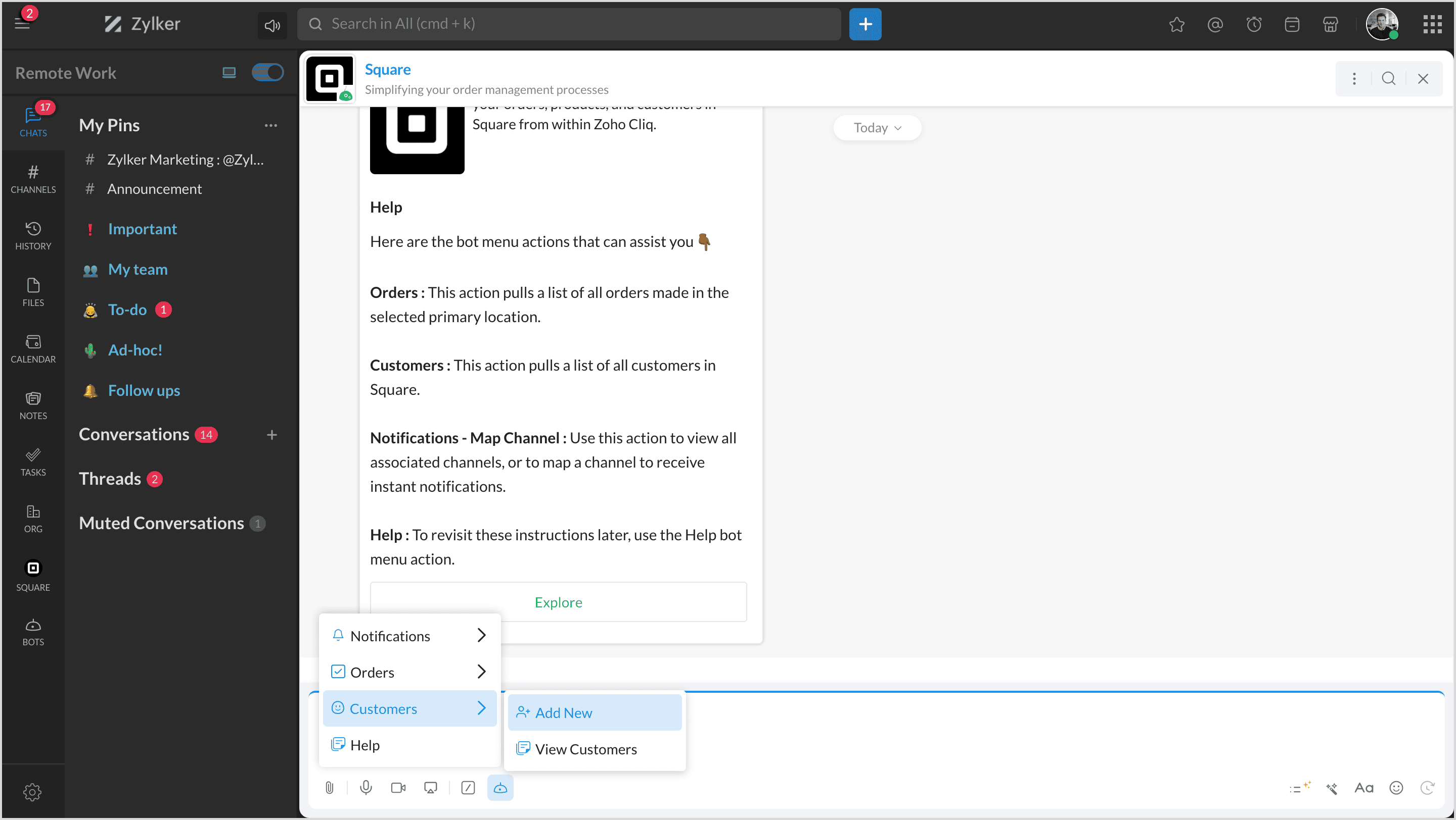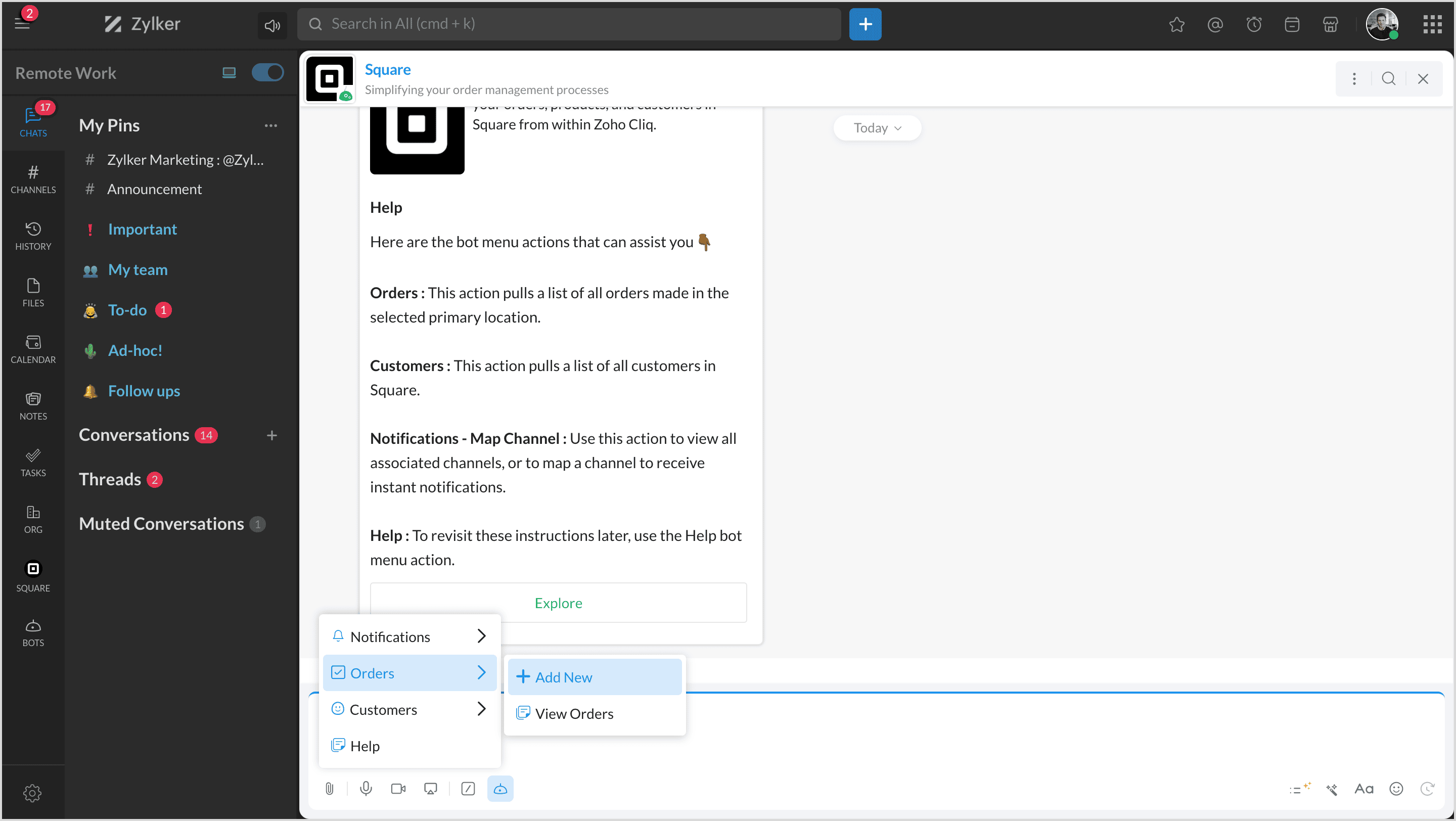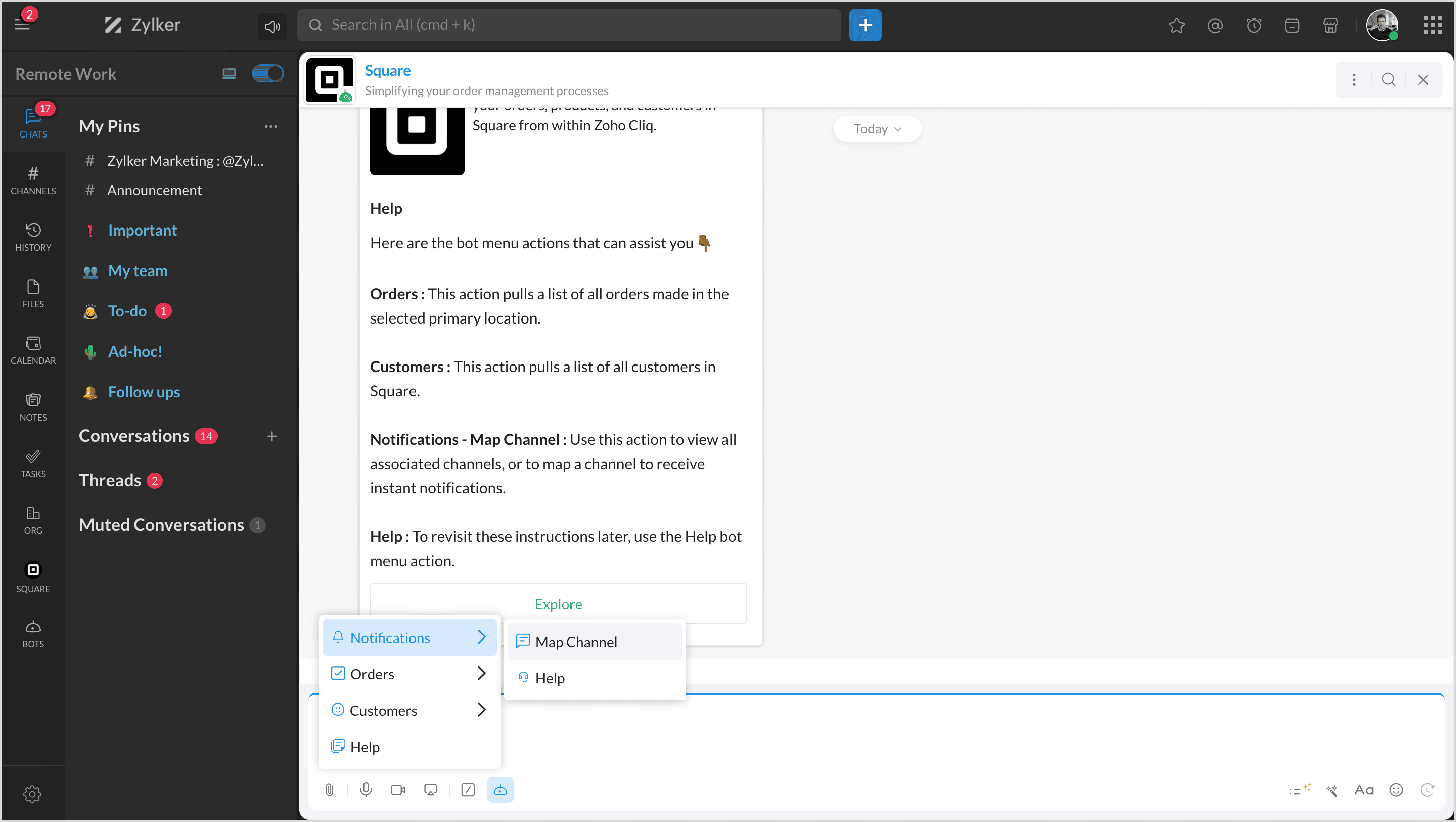 Square is a financial services and mobile payment company that provides tools and software for businesses to accept payments, manage inventory, and track finances. By integrating Square with Zoho Cliq, you can manage all your products, orders, and customers and map them to channels to get notifications.