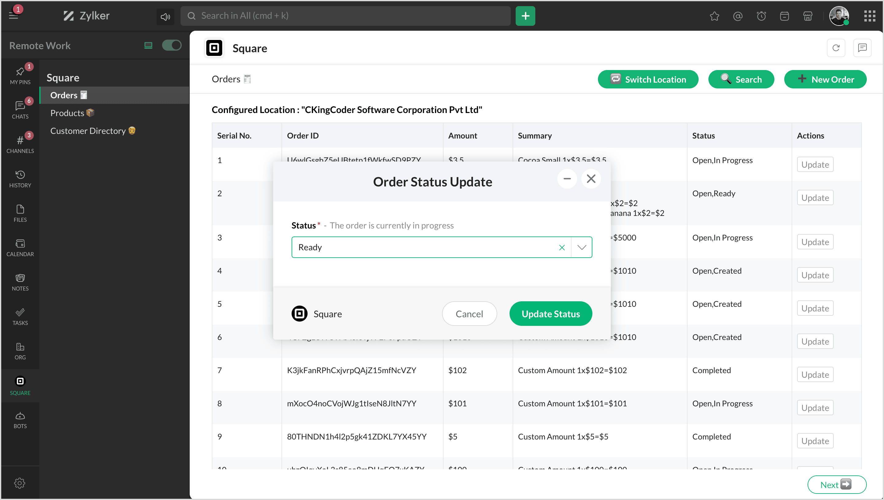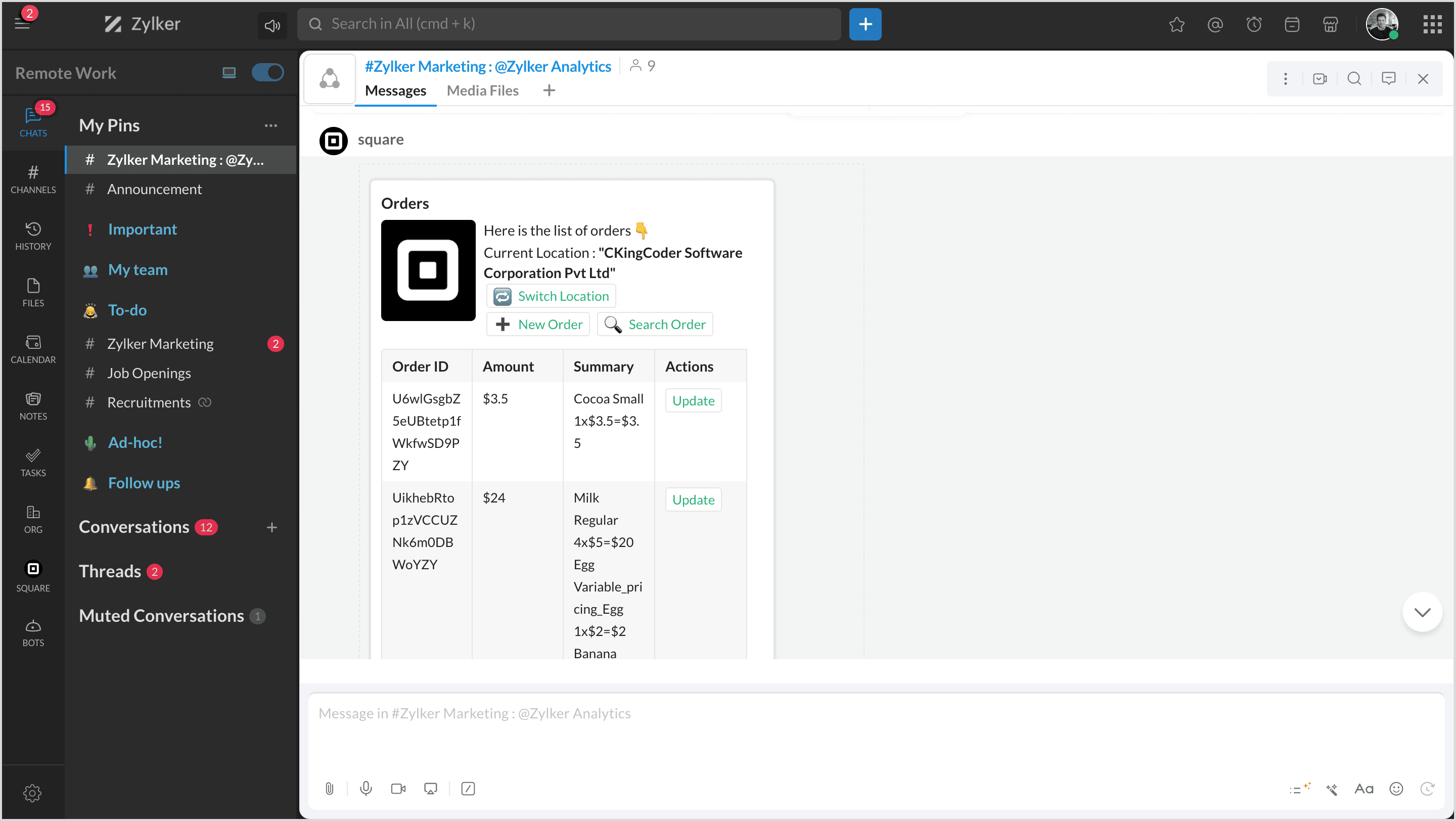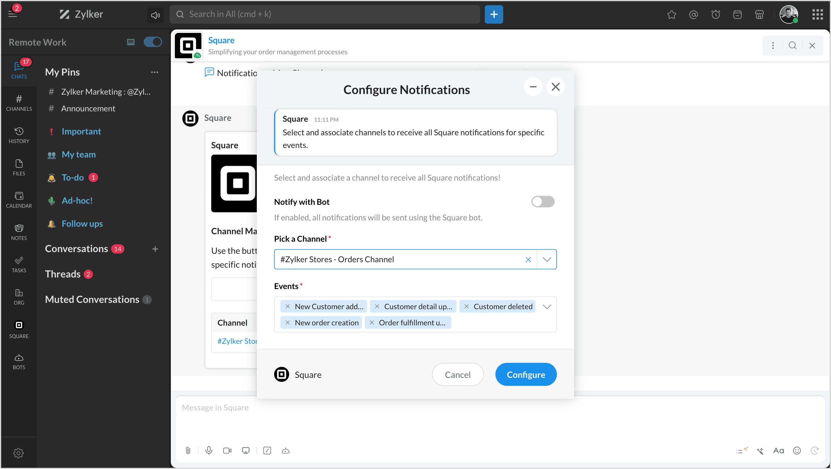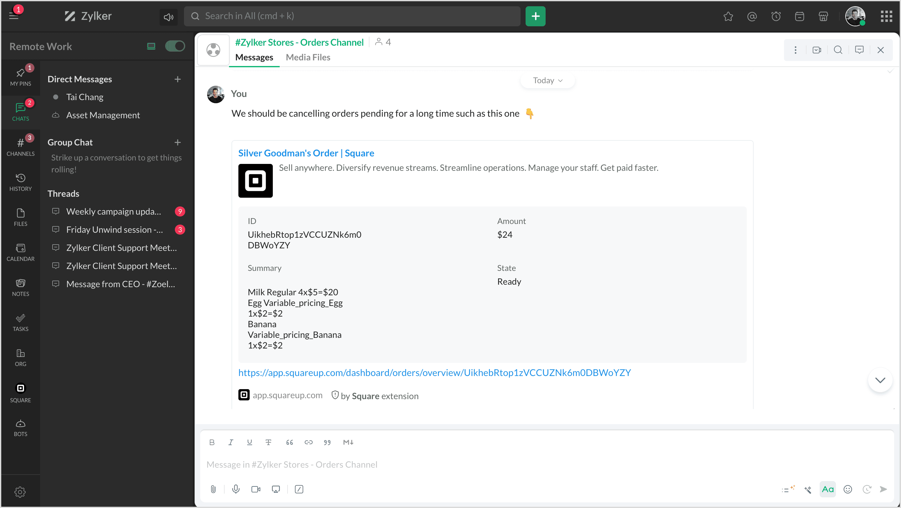 Square is a financial services and mobile payment company that provides tools and software for businesses to accept payments, manage inventory, and track finances. By integrating Square with Zoho Cliq, you can manage all your products, orders, and customers and map them to channels to get notifications.