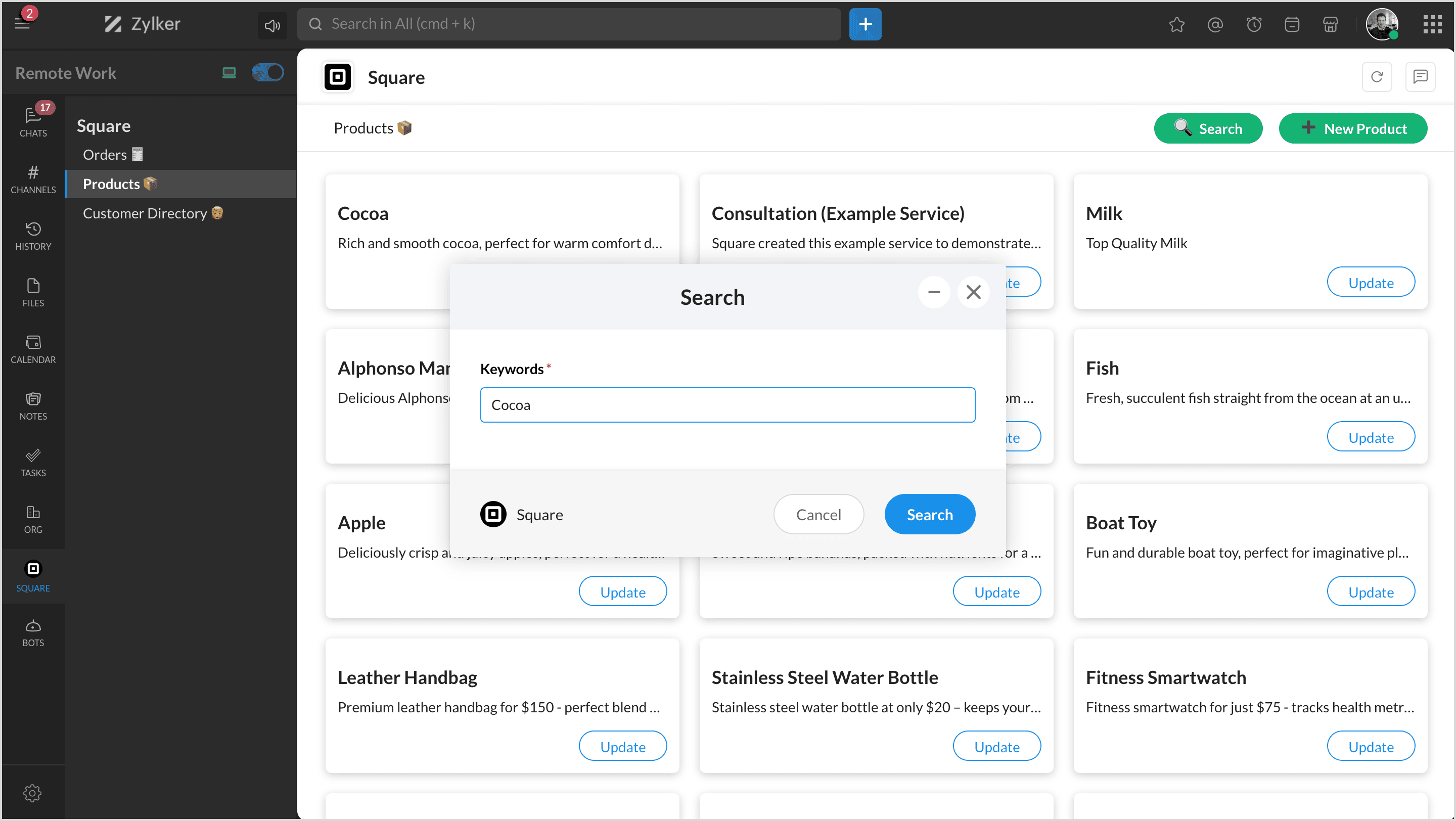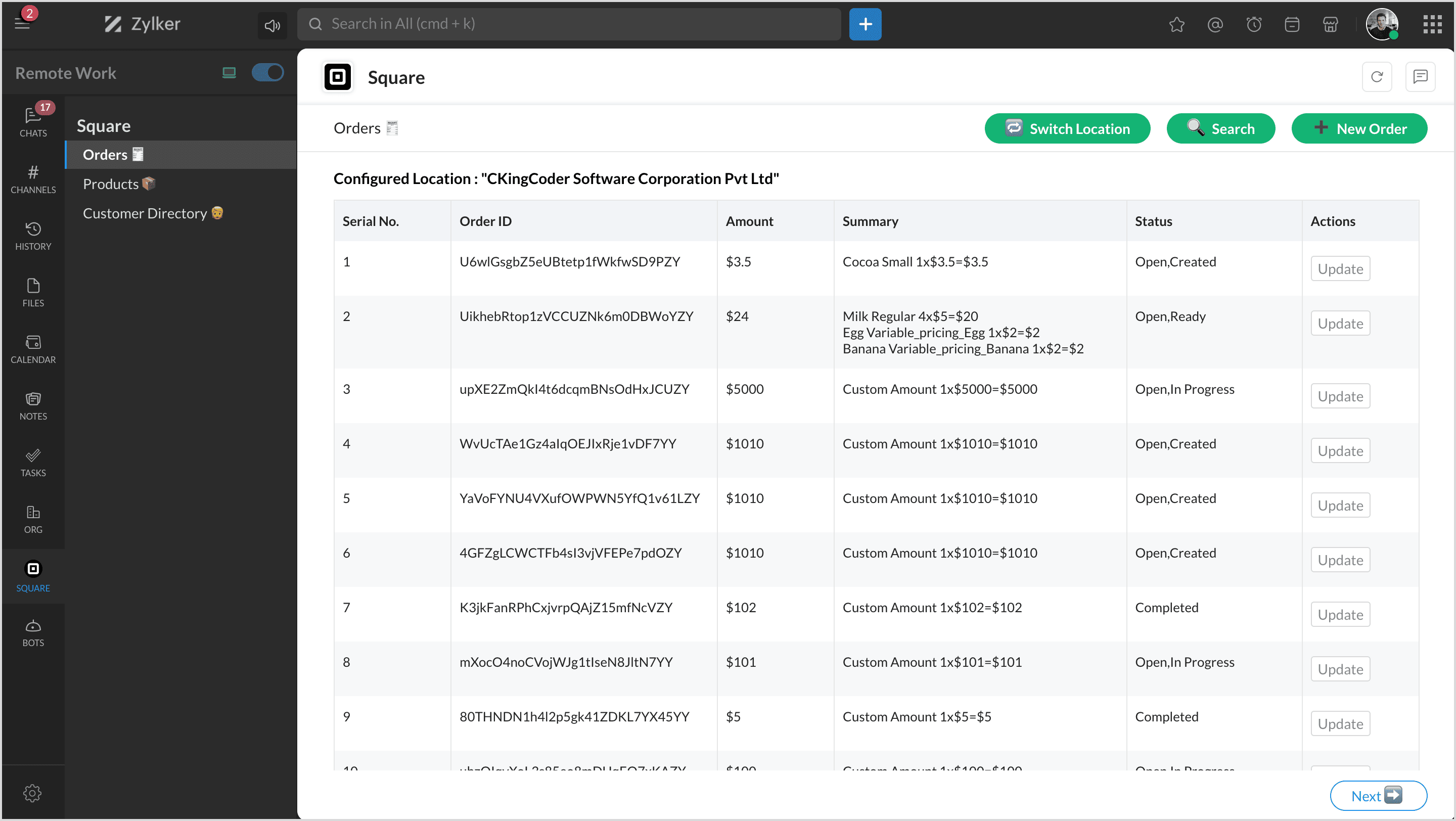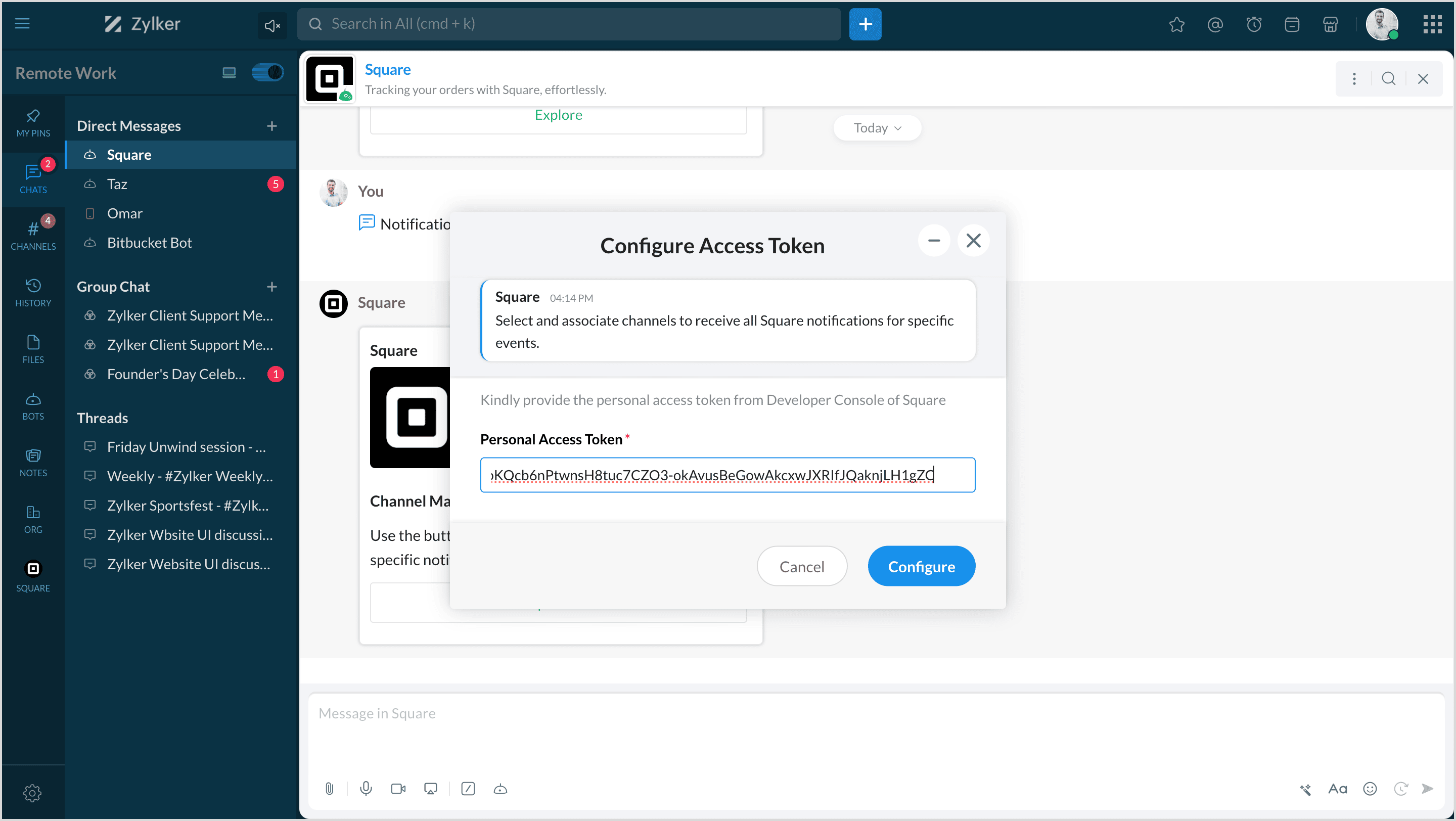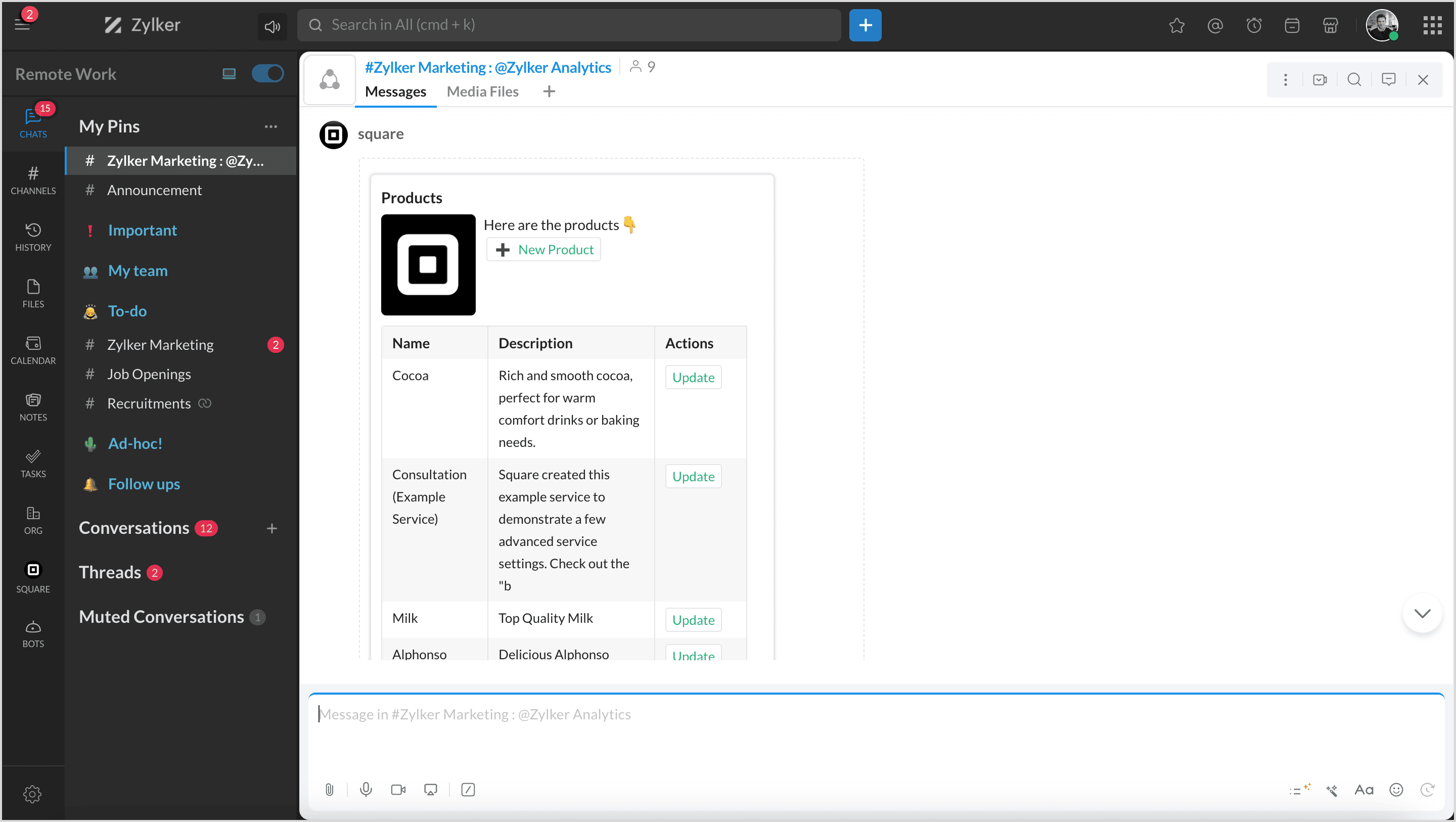 Square is a financial services and mobile payment company that provides tools and software for businesses to accept payments, manage inventory, and track finances. By integrating Square with Zoho Cliq, you can manage all your products, orders, and customers and map them to channels to get notifications.