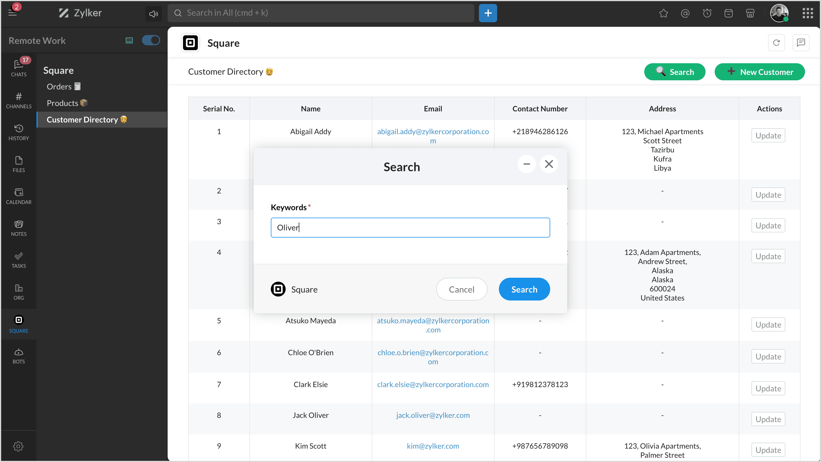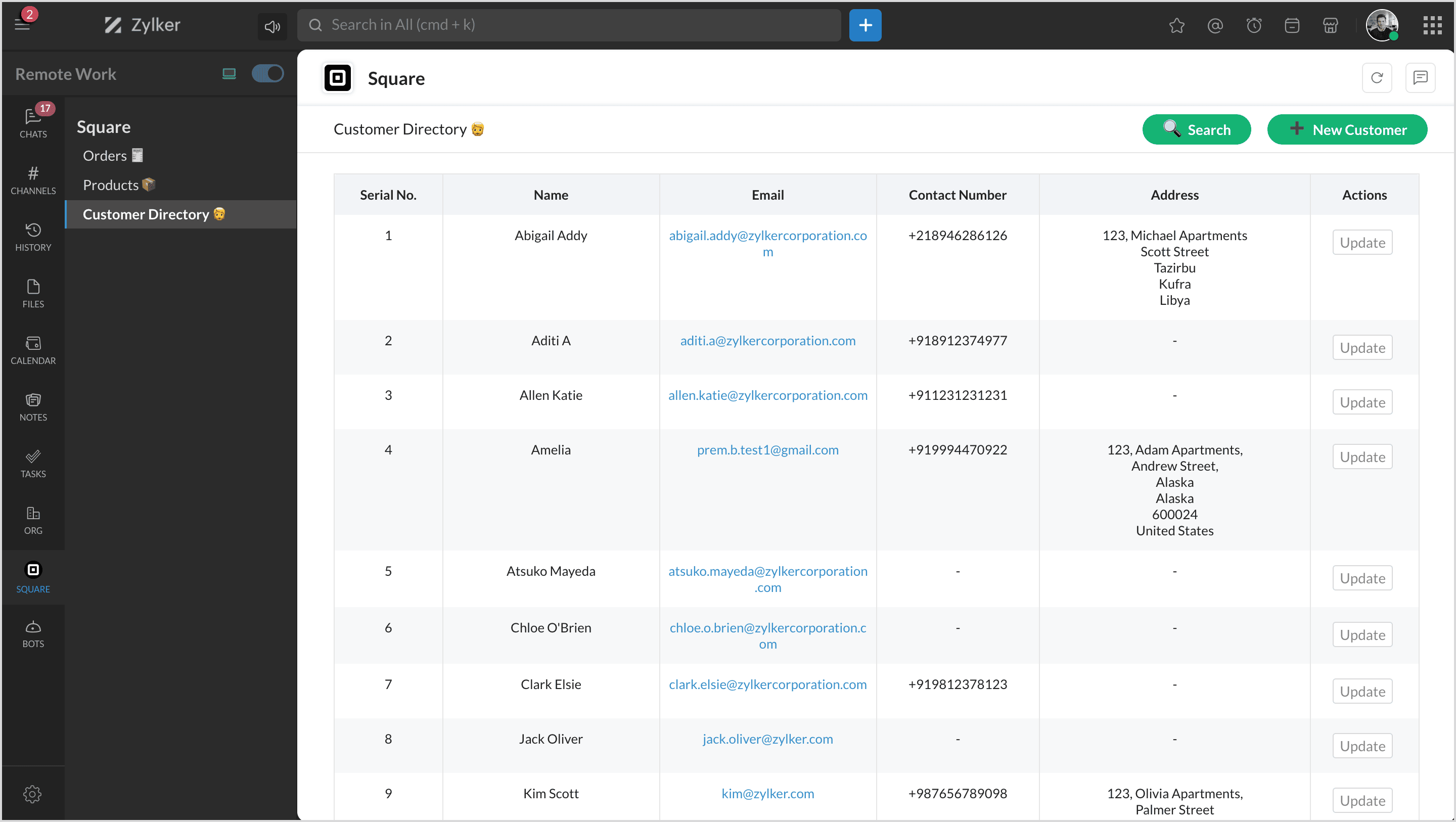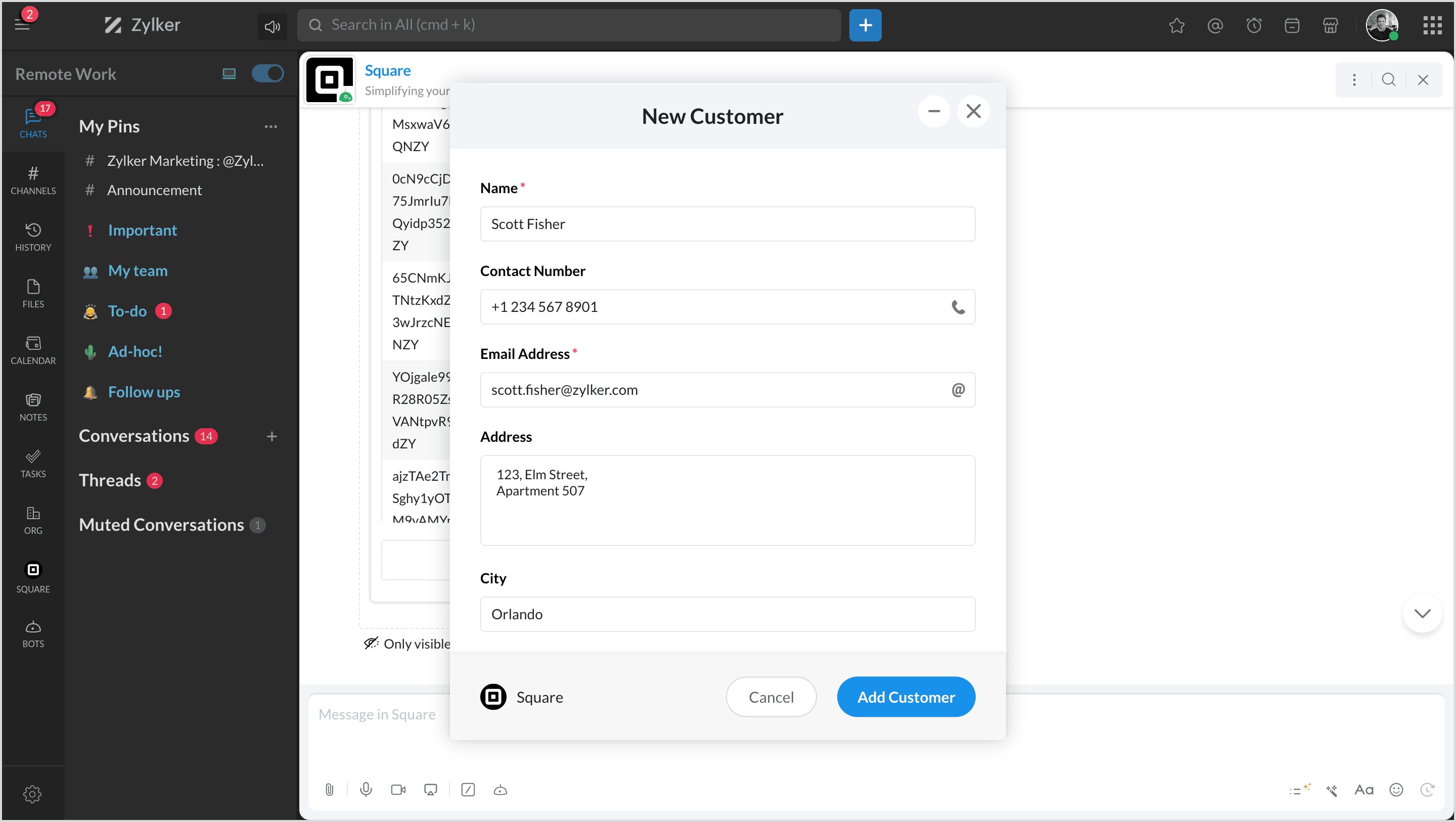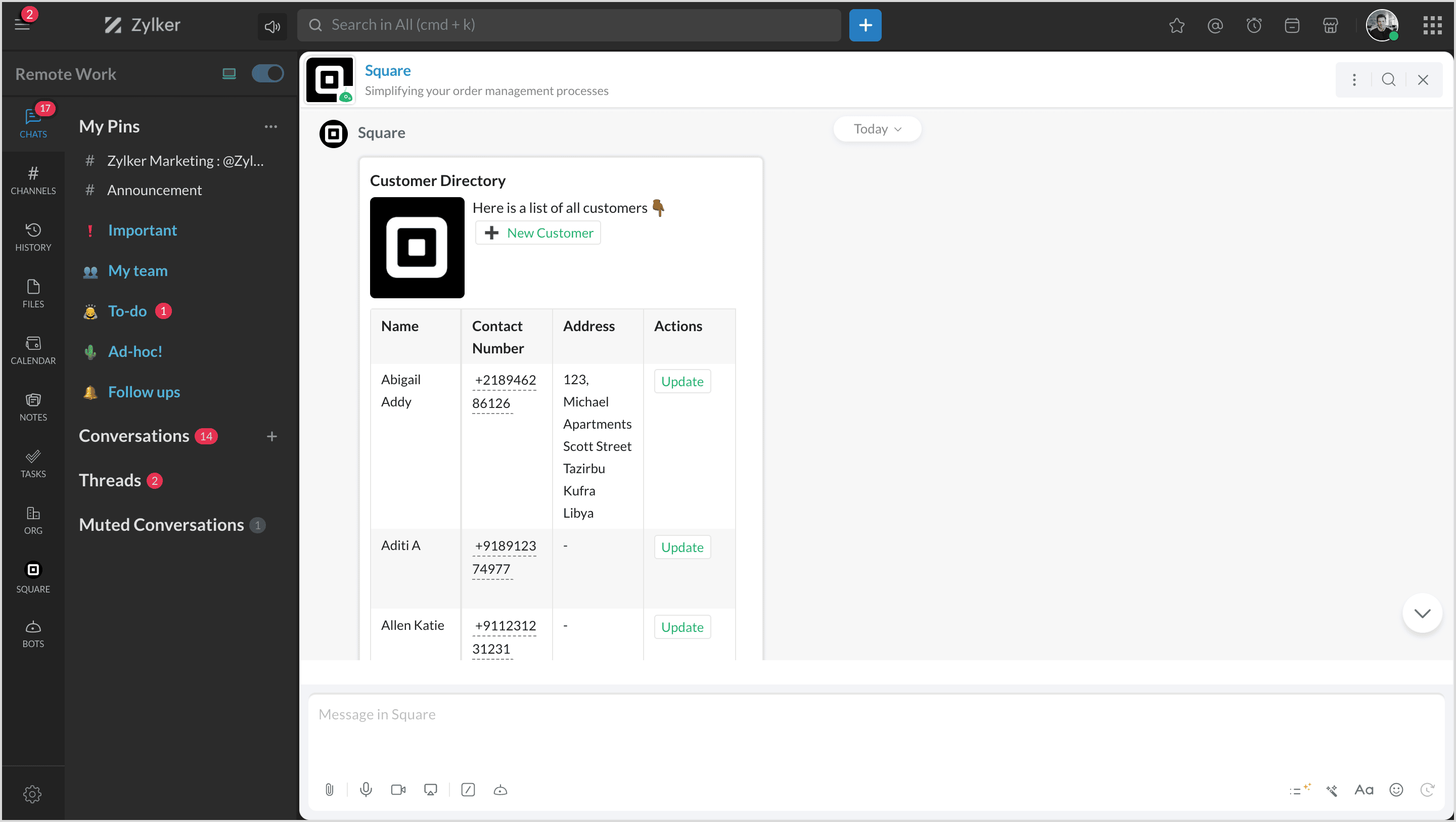 You can view all your customers' list instantly in any chat or channel using the slash '/square' command and select Customers.