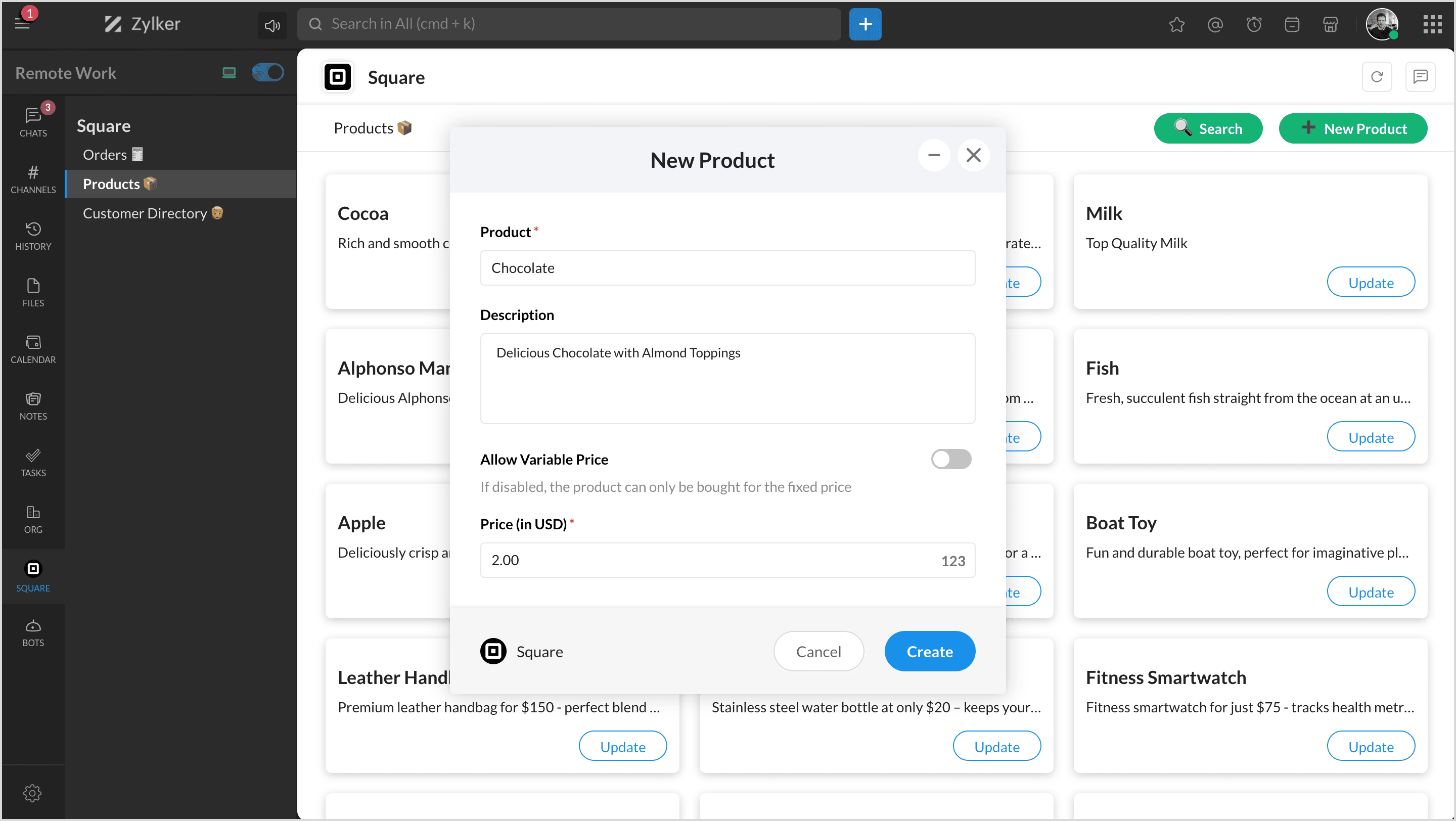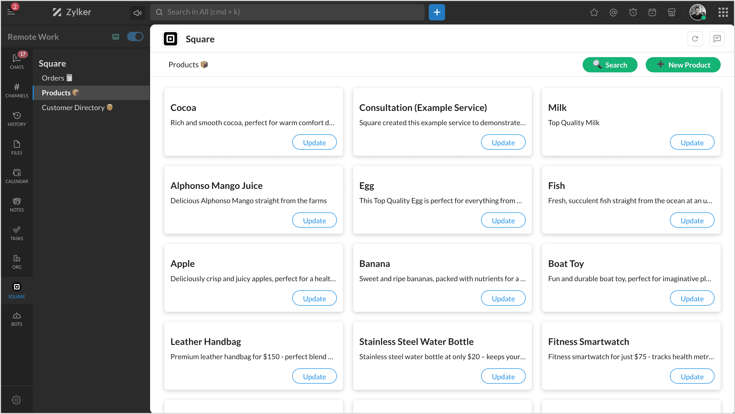 You can view all your products list instantly in any chat or channel using the slash command '/square' and select 'Products.'