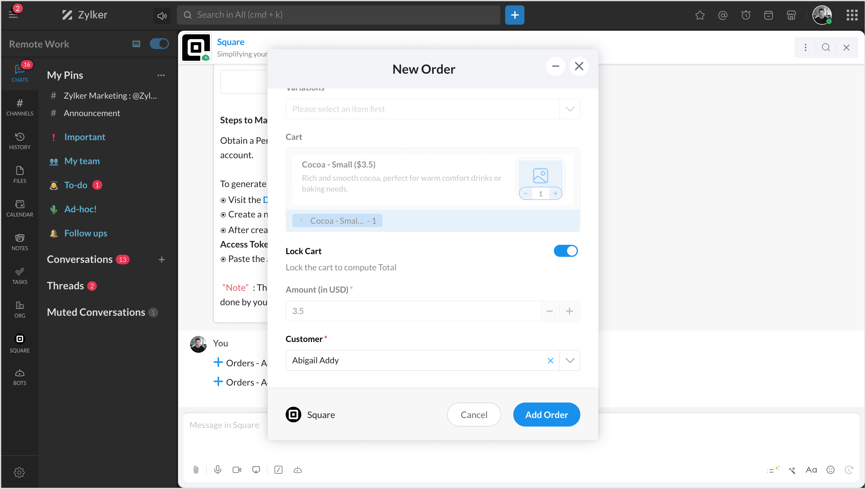 - To add a new order using the bot menu, navigate to the Square bot.
