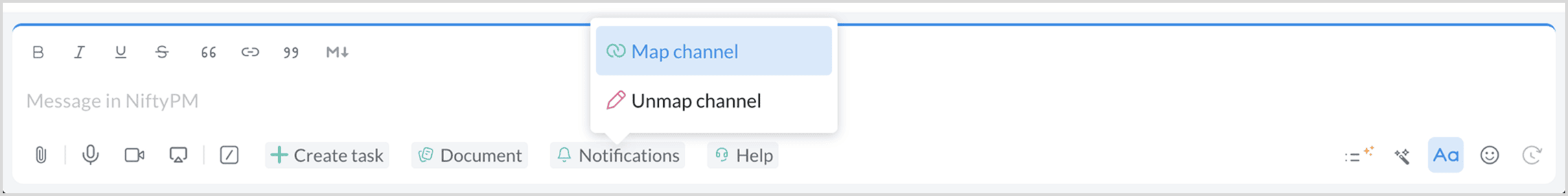 Navigate to the Nifty bot, select Notifications > Map Channel in the text composer.